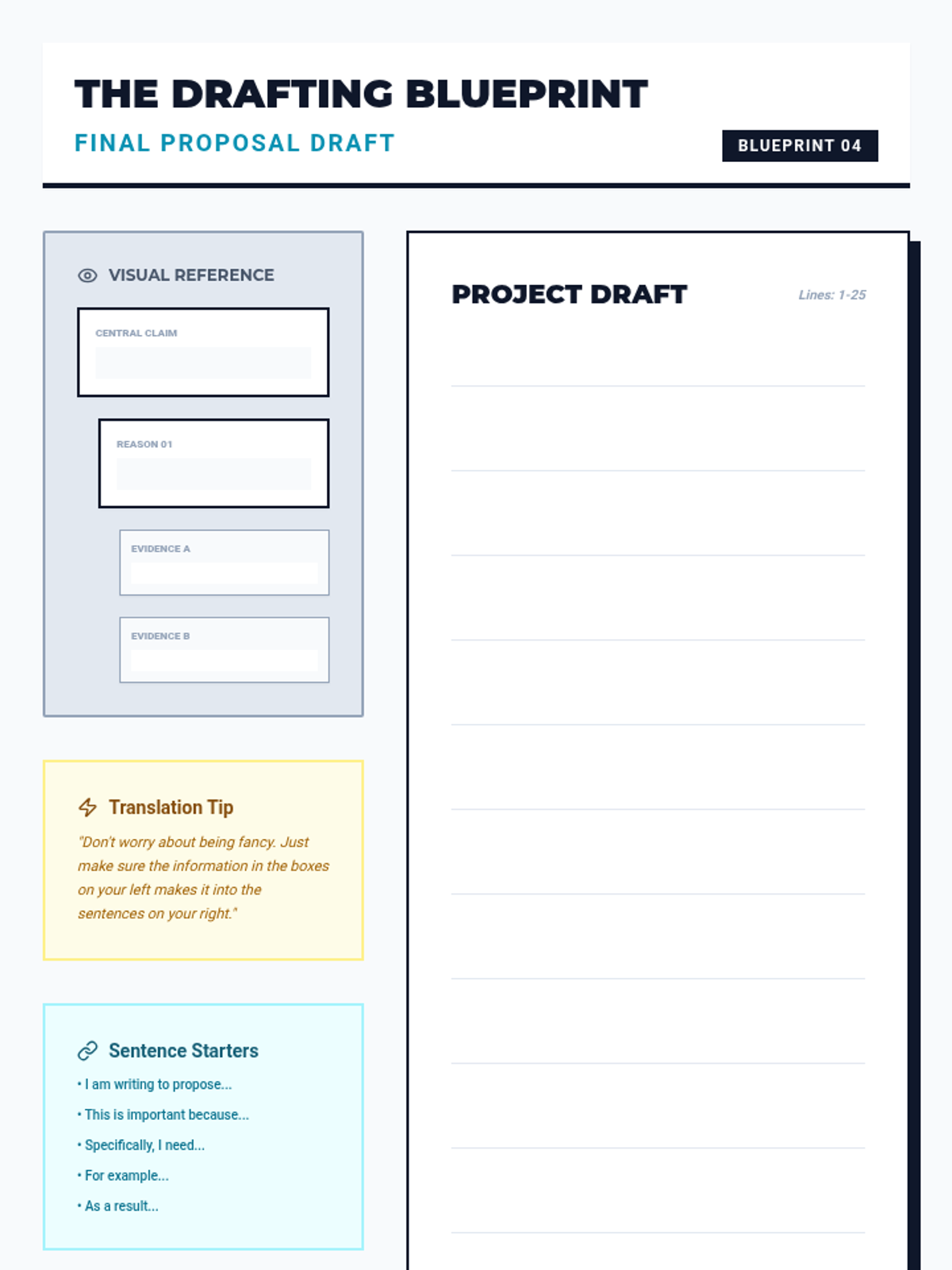 A project-based sequence for 12th-grade students to master text structure graphic organizers as pre-writing scaffolds. Students transition from abstract ideas to concrete written proposals for their senior advocacy or post-secondary transition plans.
