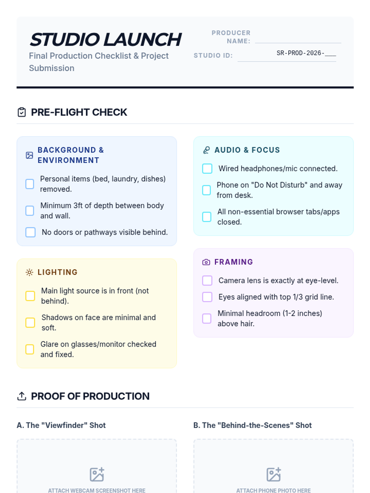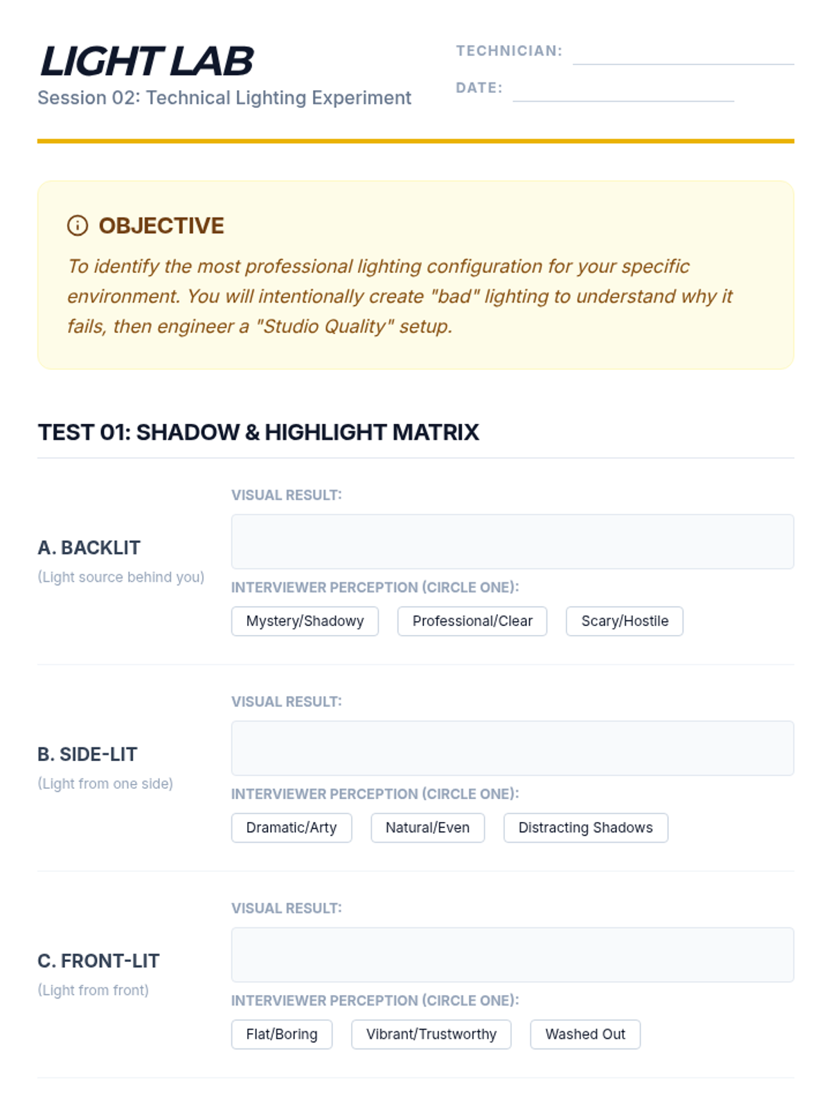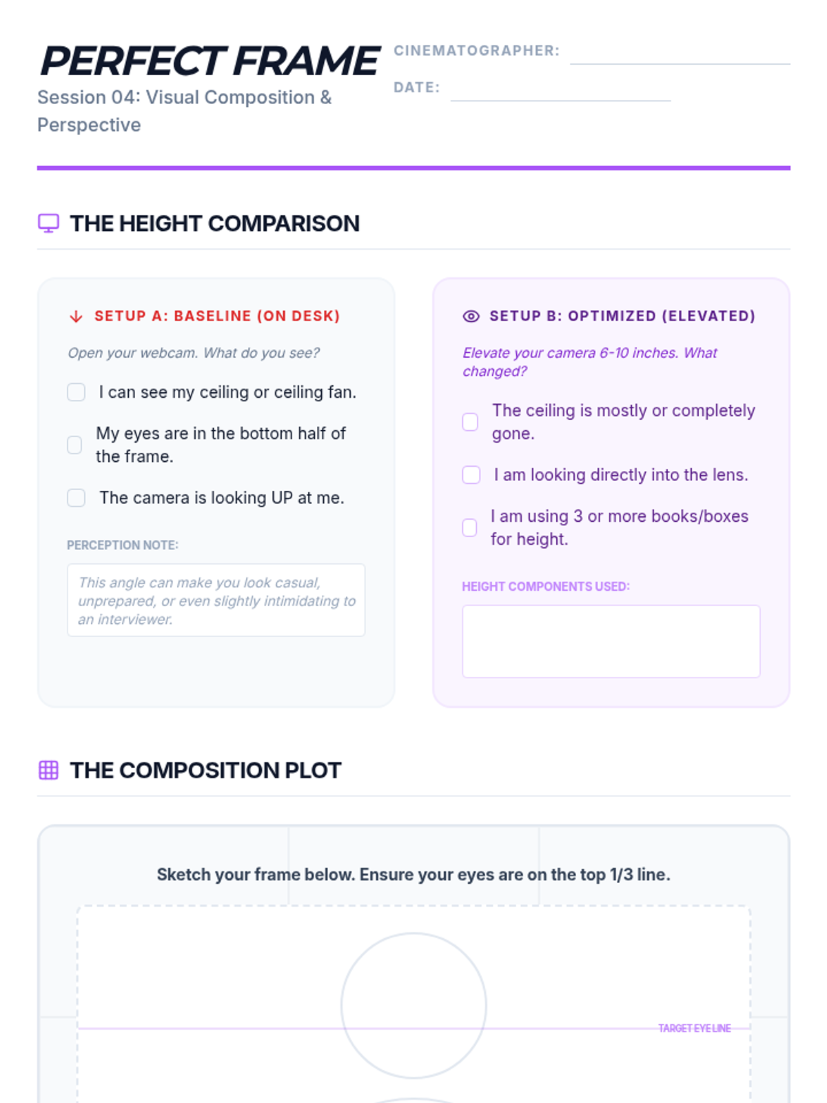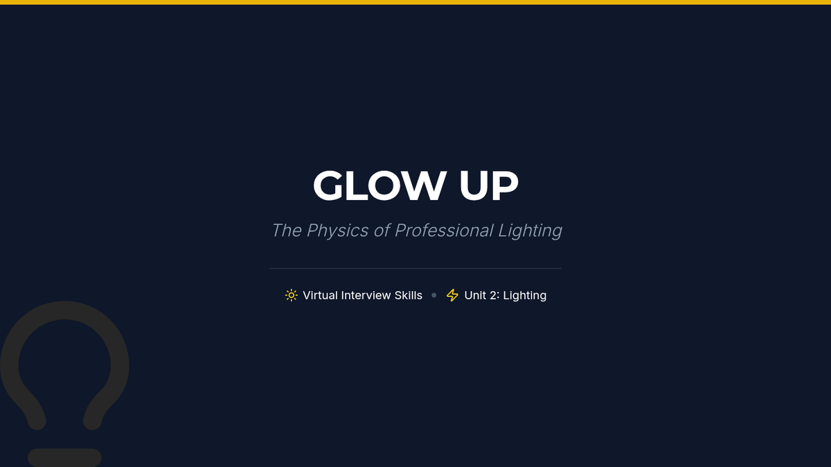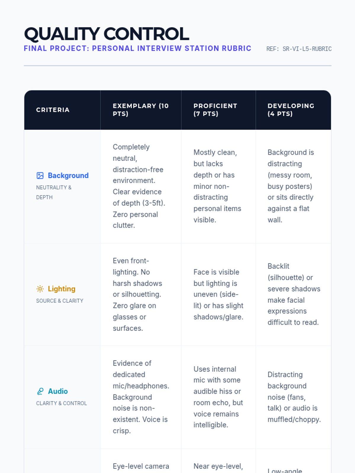 A comprehensive 5-lesson sequence for 9th graders focusing on the technical and environmental aspects of professional virtual interviews, from background composition to lighting, audio, and framing.