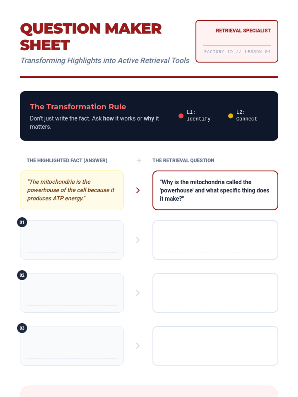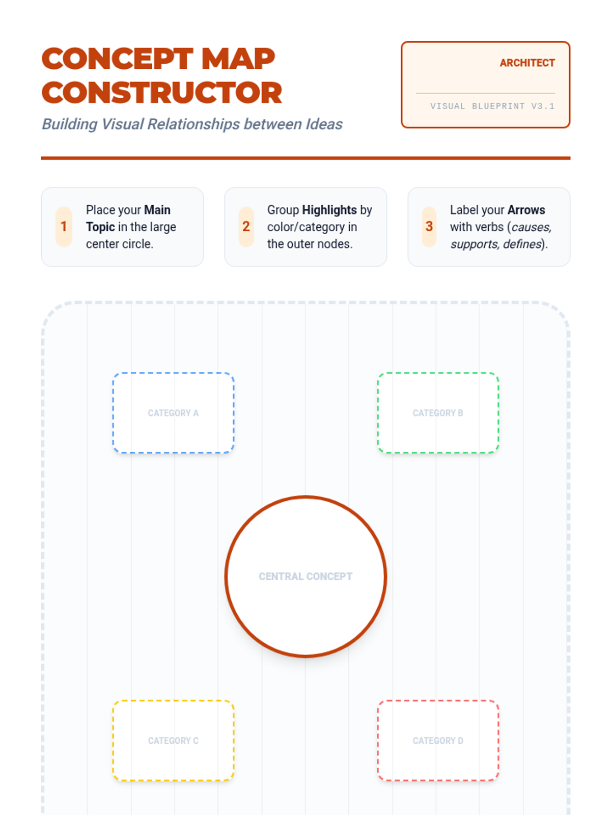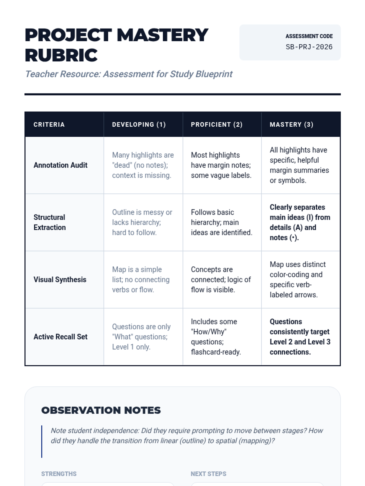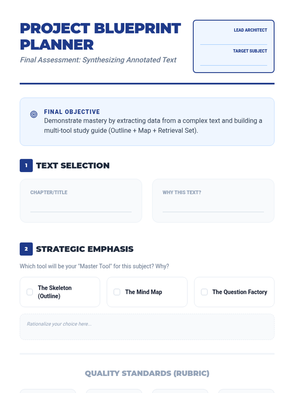A comprehensive 5-lesson series designed to help 9th-grade students in academic support settings transform their passive highlights and annotations into active retrieval-based study tools. Through a 'Study Blueprint' theme, students move from auditing their existing notes to building outlines, concept maps, and flashcards, culminating in a personalized study guide for an external subject.