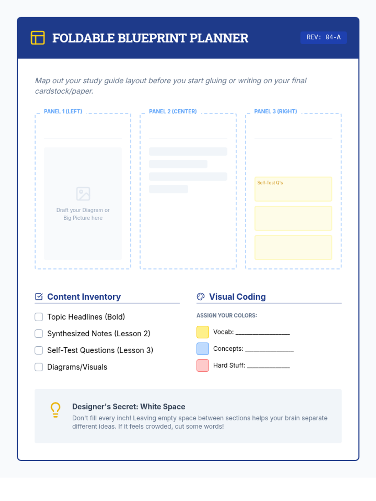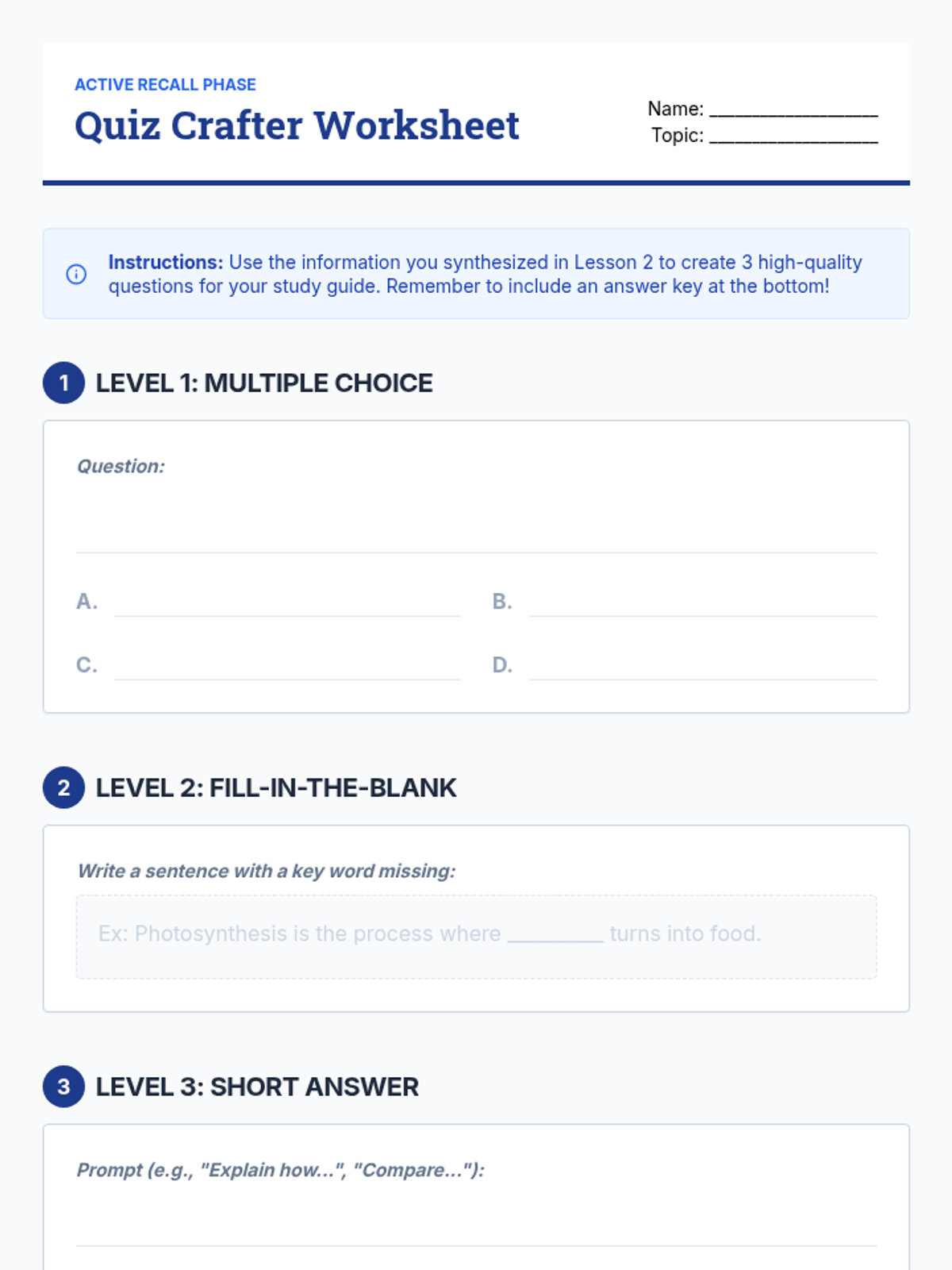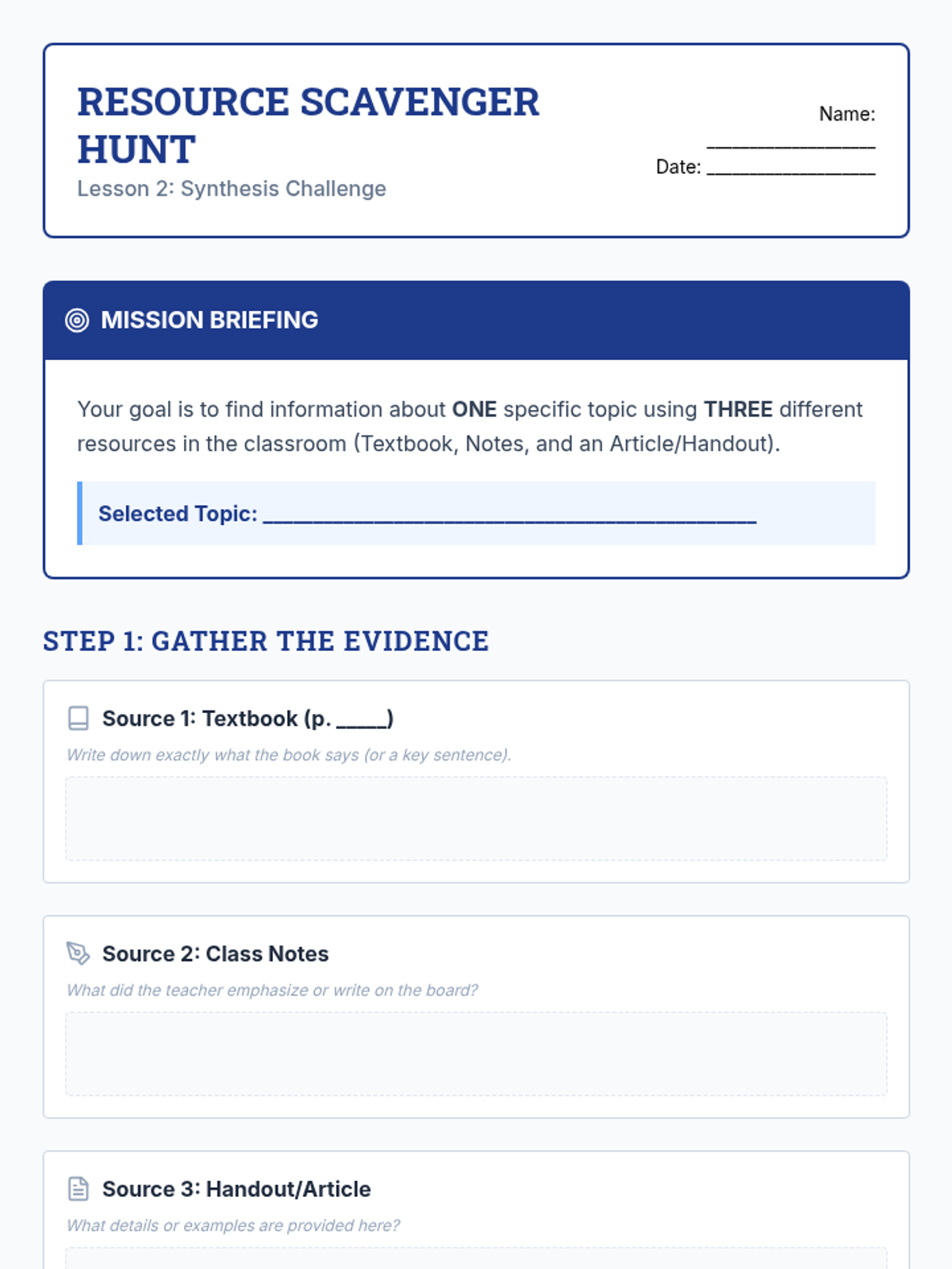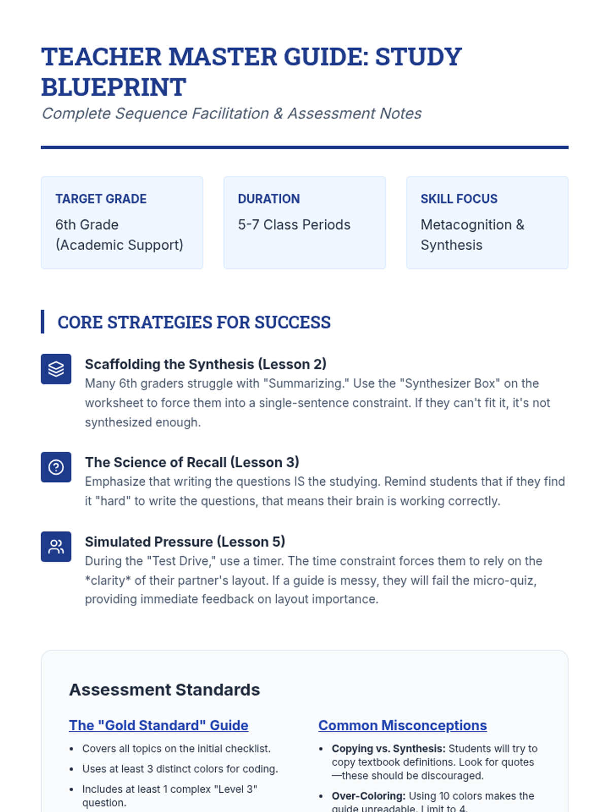 A project-based sequence for 6th graders to master the art of study guide creation. Students progress from deconstructing assessment requirements to synthesizing resources, drafting active recall questions, and physically assembling a review tool.