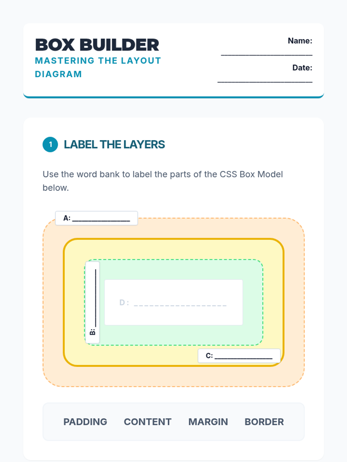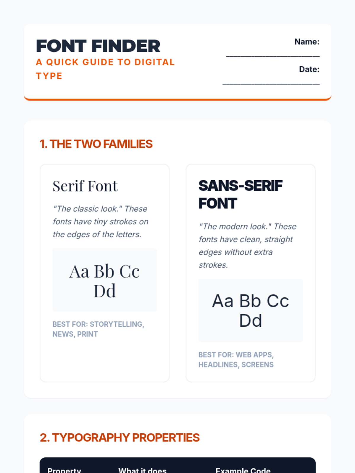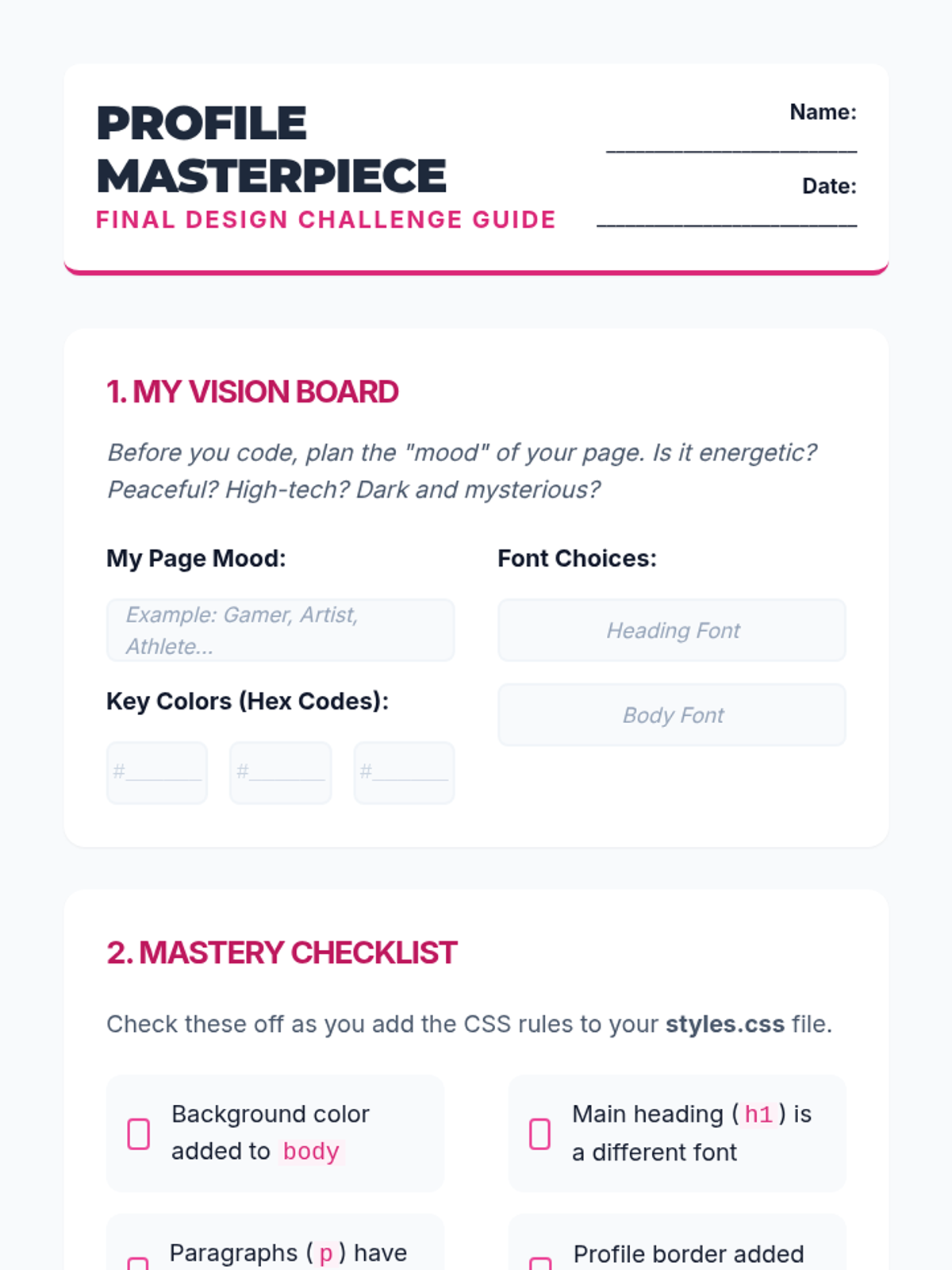 Students transition from basic HTML to CSS, learning how to style web pages with colors, fonts, and layouts. The sequence covers CSS syntax, color theory, typography, and the box model, culminating in a personal profile design project.