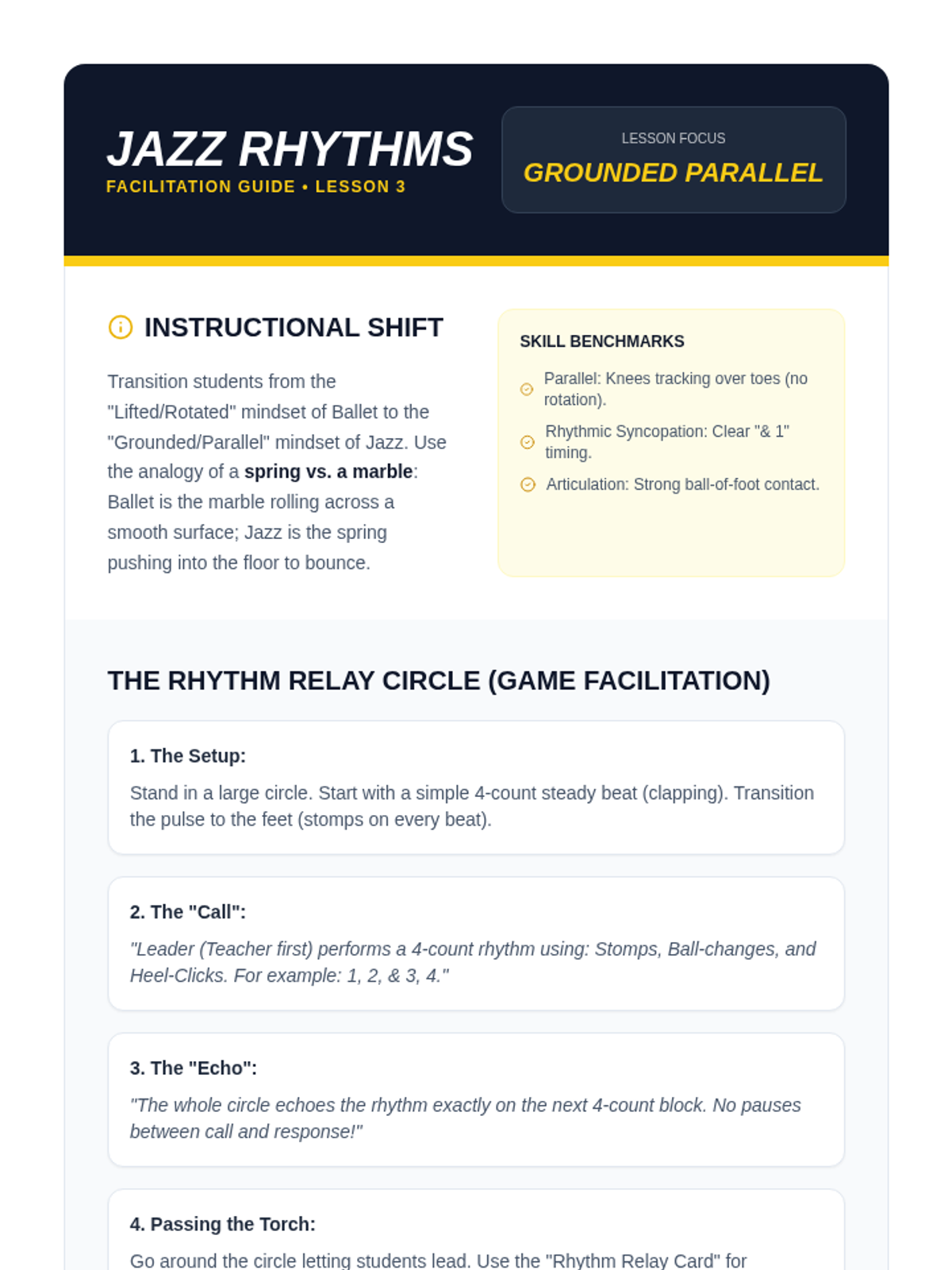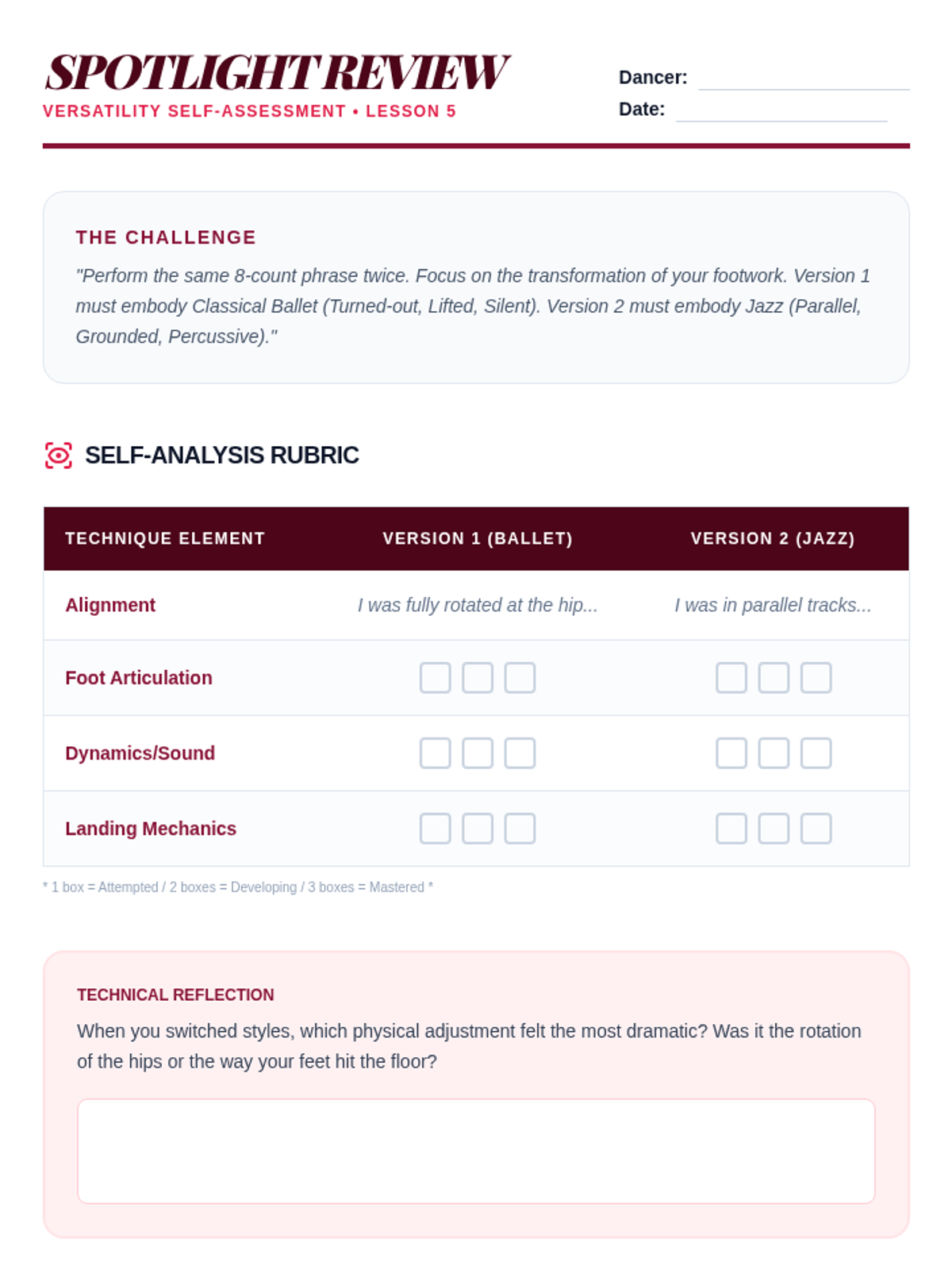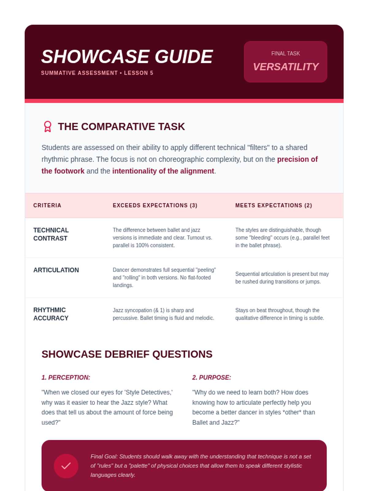 Students investigate how footwork technique defines and differentiates dance genres, specifically comparing Ballet and Jazz. They analyze the mechanics of the foot, experiment with stylistic qualities, and conclude with a comparative performance task.