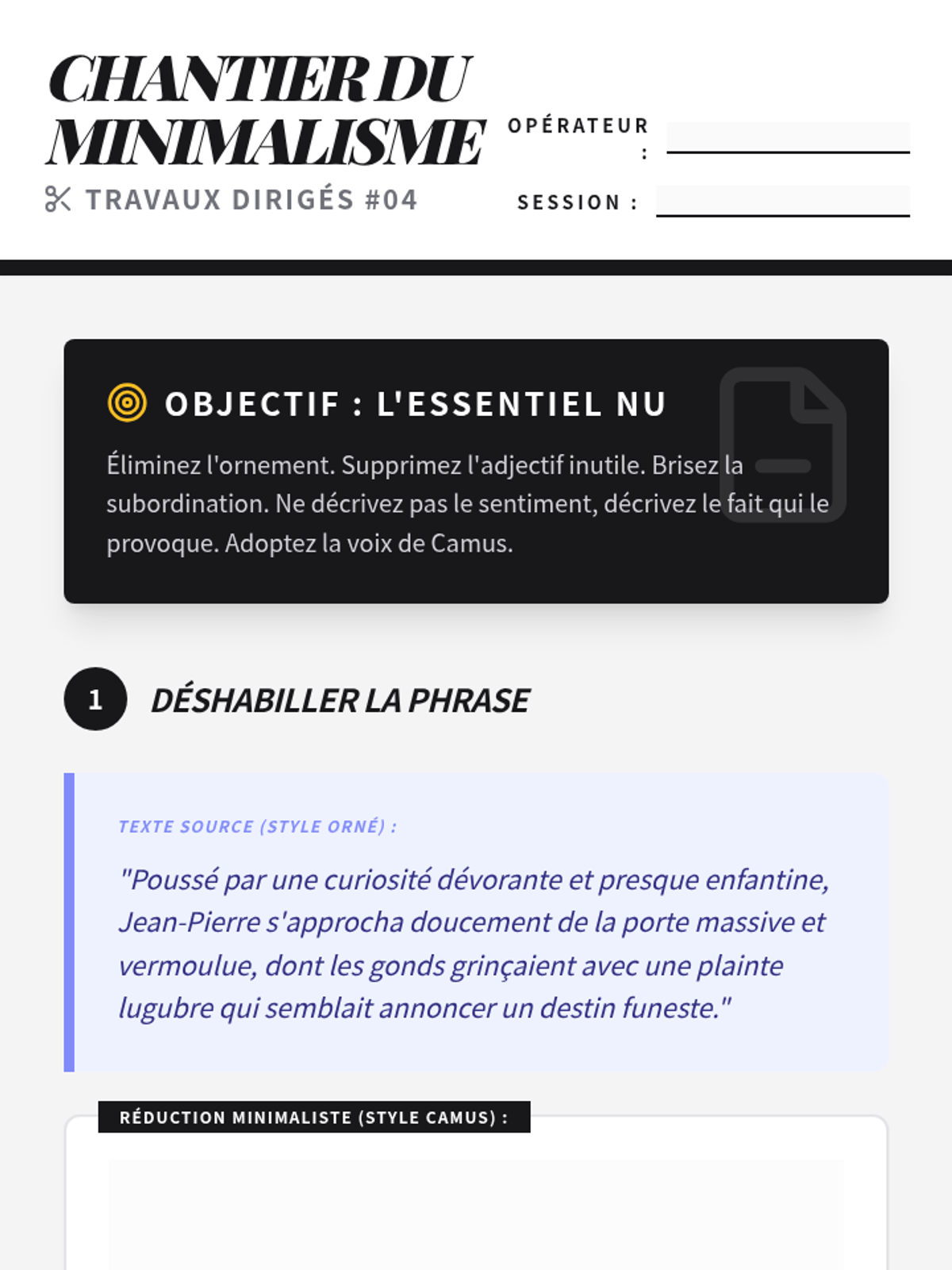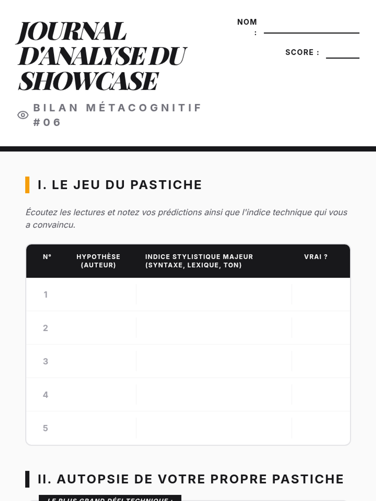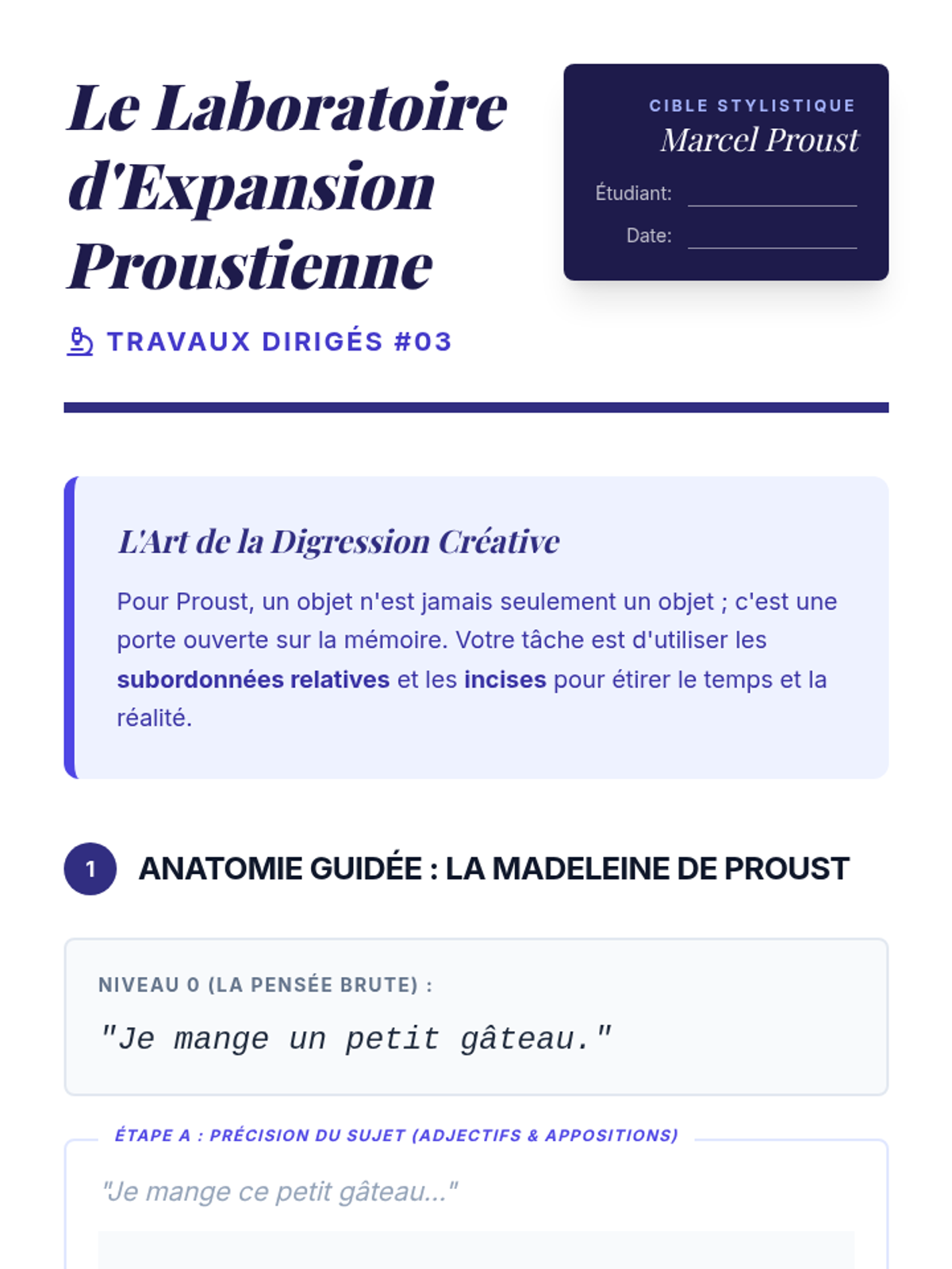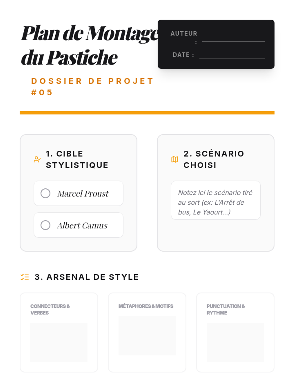 This advanced French writing sequence explores the art of pastiche, challenging students to analyze and imitate the unique stylistic 'fingerprints' of major Francophone authors like Proust, Camus, and Duras. Through forensic analysis and creative application, students master complex syntax and develop a deeper appreciation for literary voice.