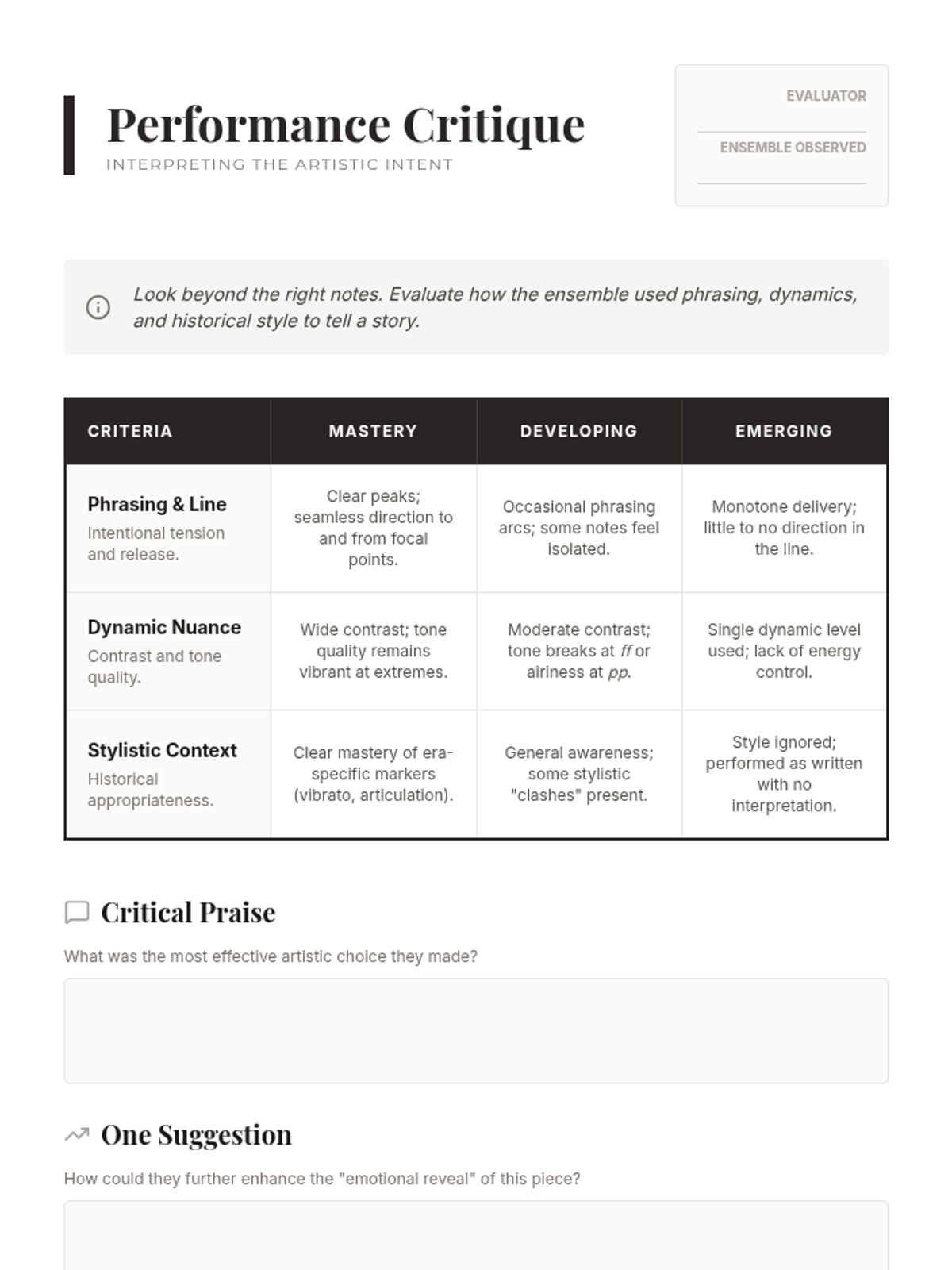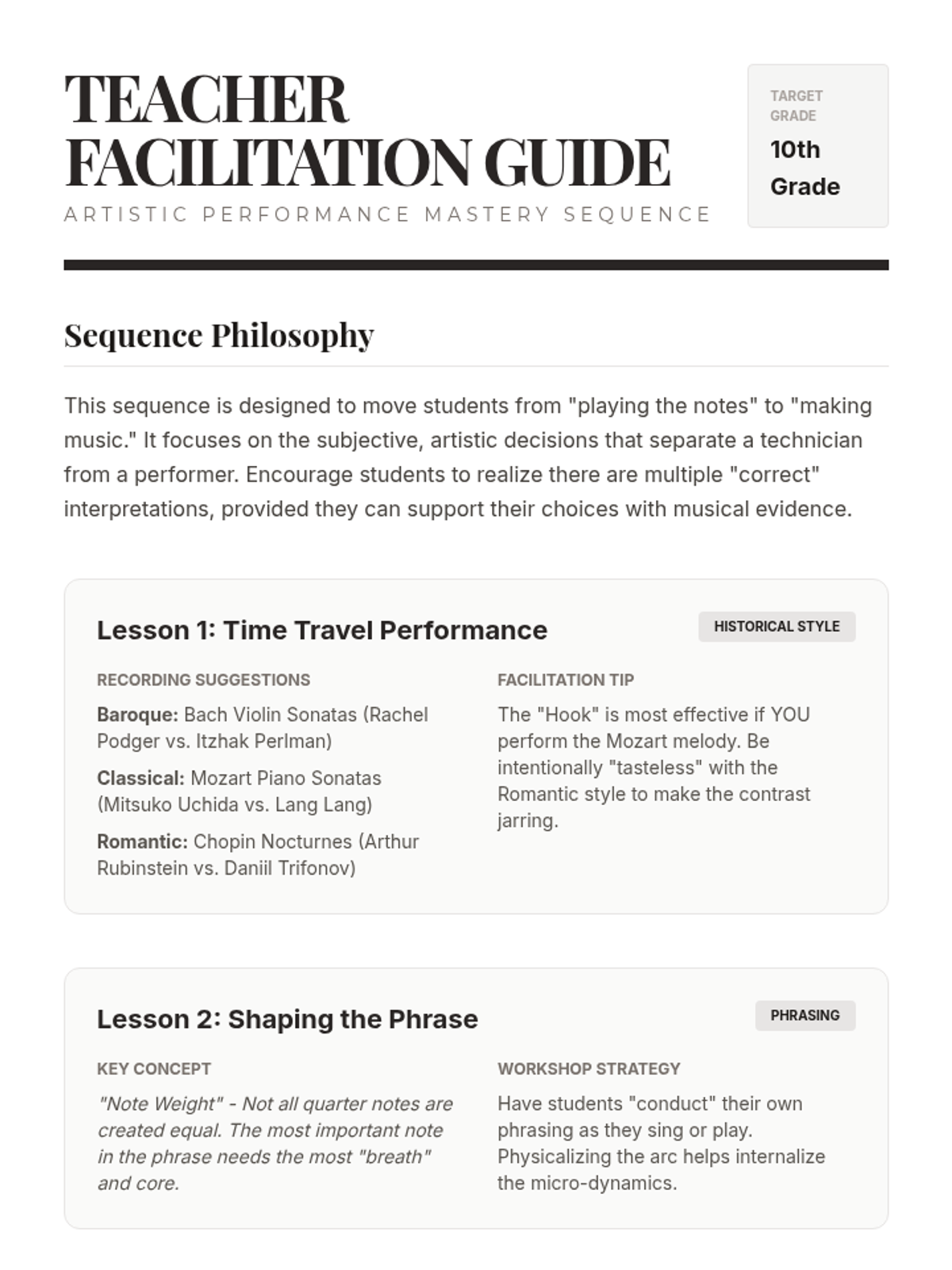 Students bridge the gap between technical accuracy and artistic performance by studying phrasing, dynamics, and historical style. This sequence empowers musicians to make independent artistic decisions and understand the 'why' behind musical notation.