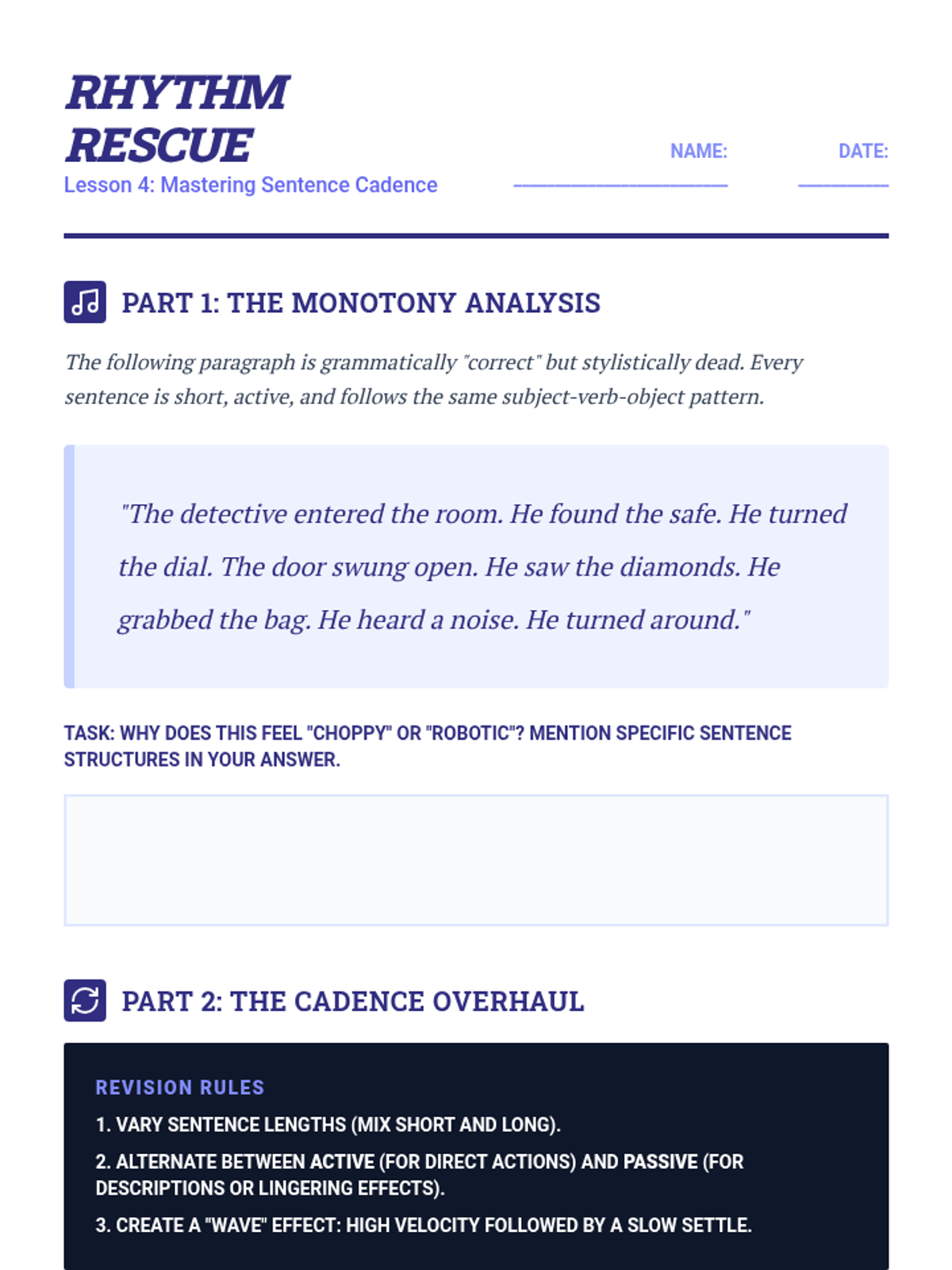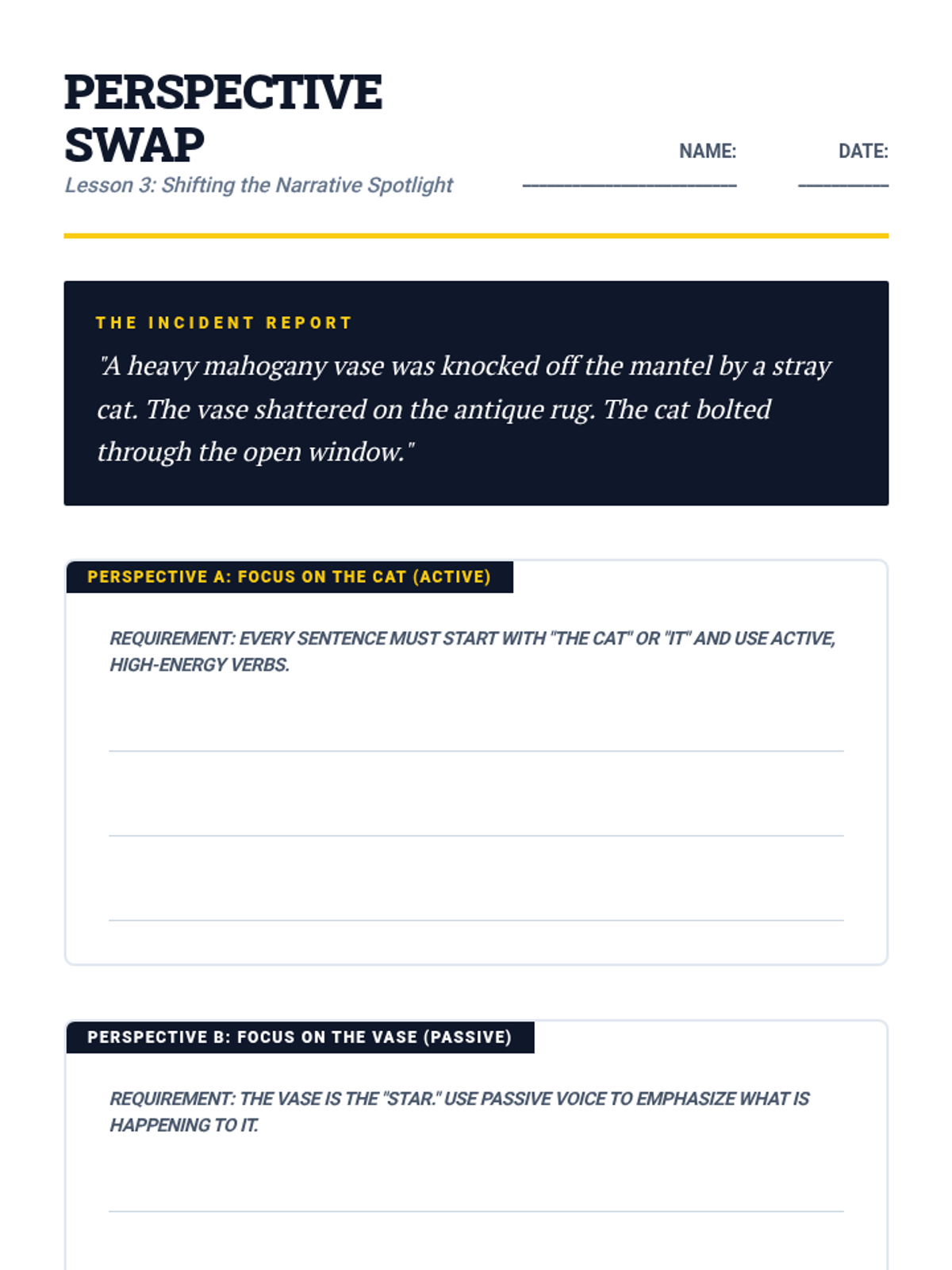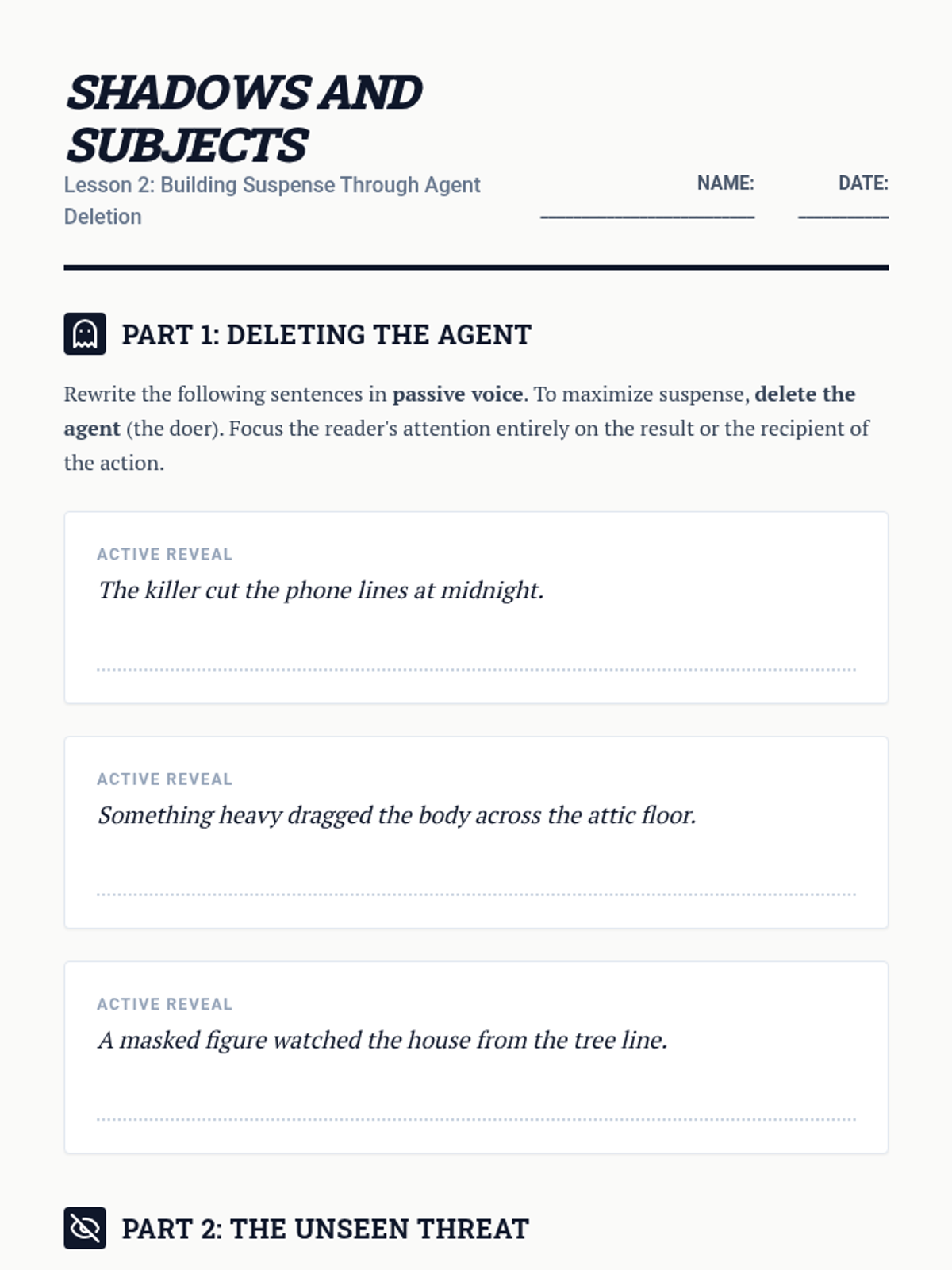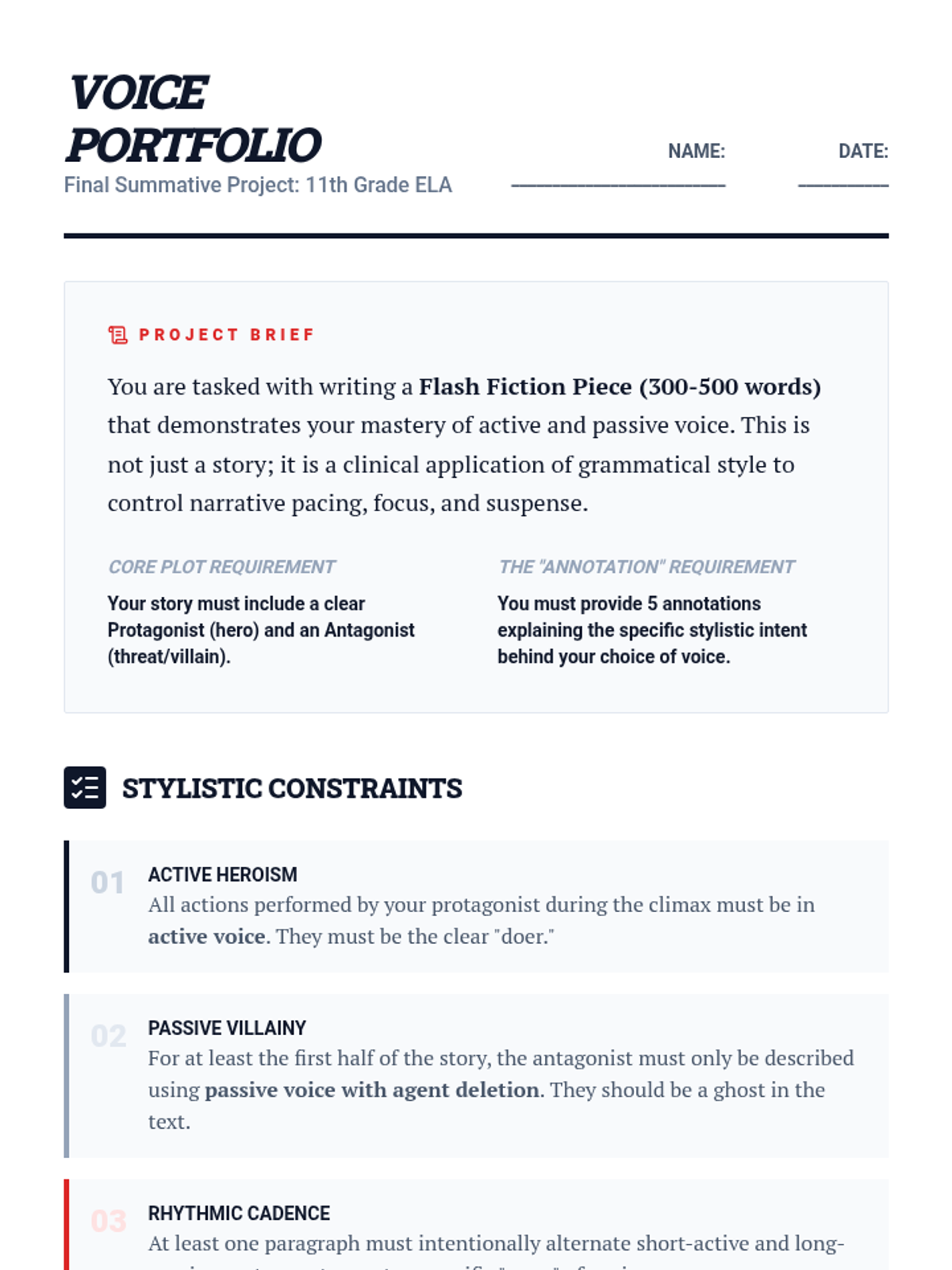 This 11th Grade ELA sequence explores active and passive voice through the lens of creative writing. Students learn to use active voice to drive pacing in action scenes and passive voice to build suspense and shift perspective, culminating in a flash fiction portfolio piece.