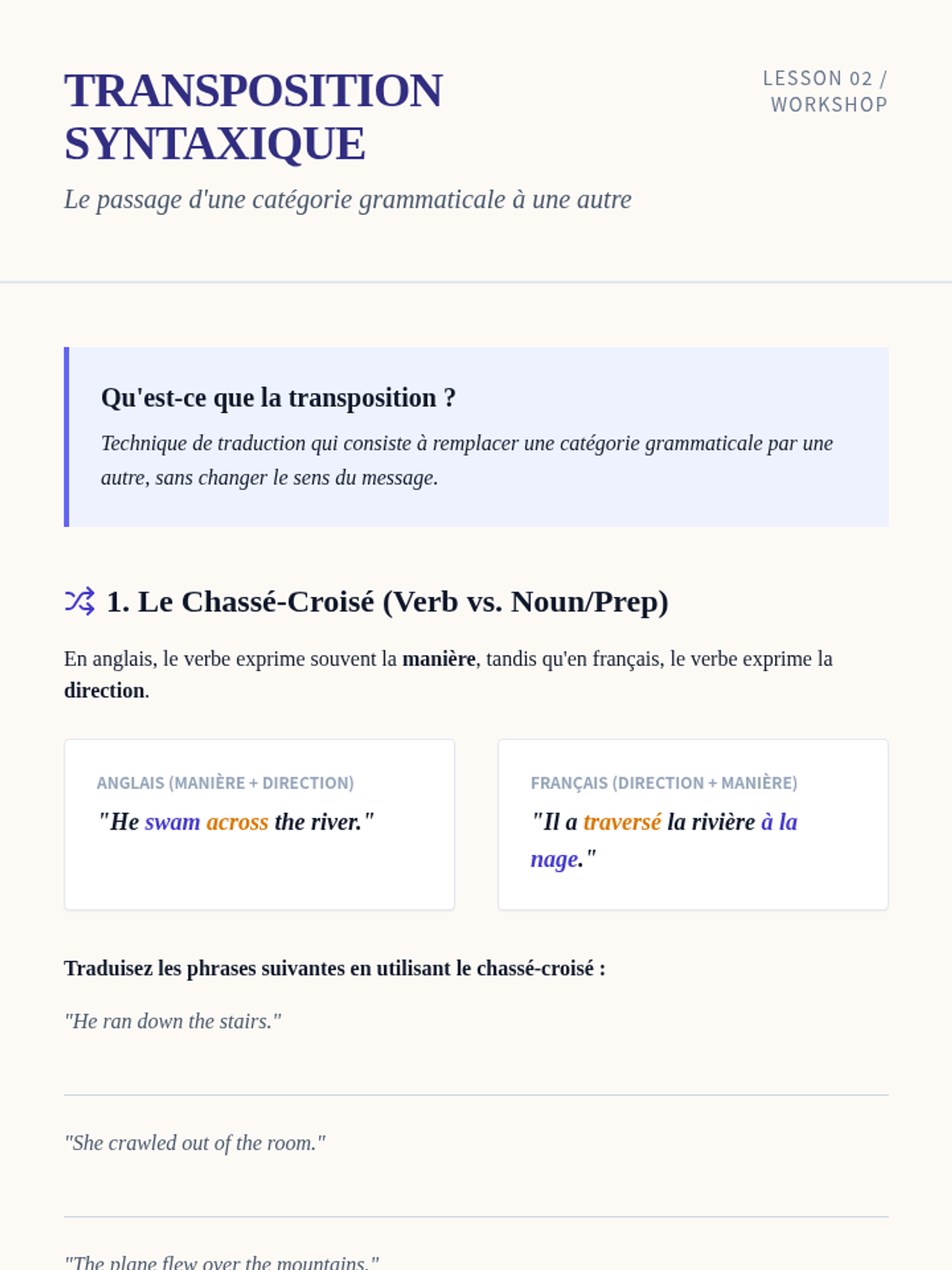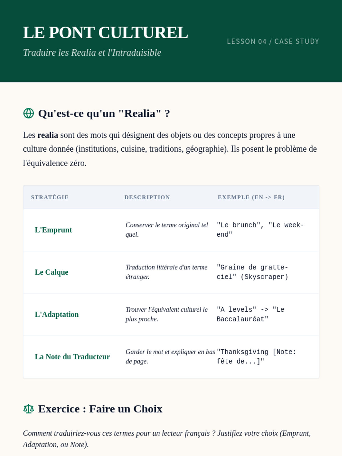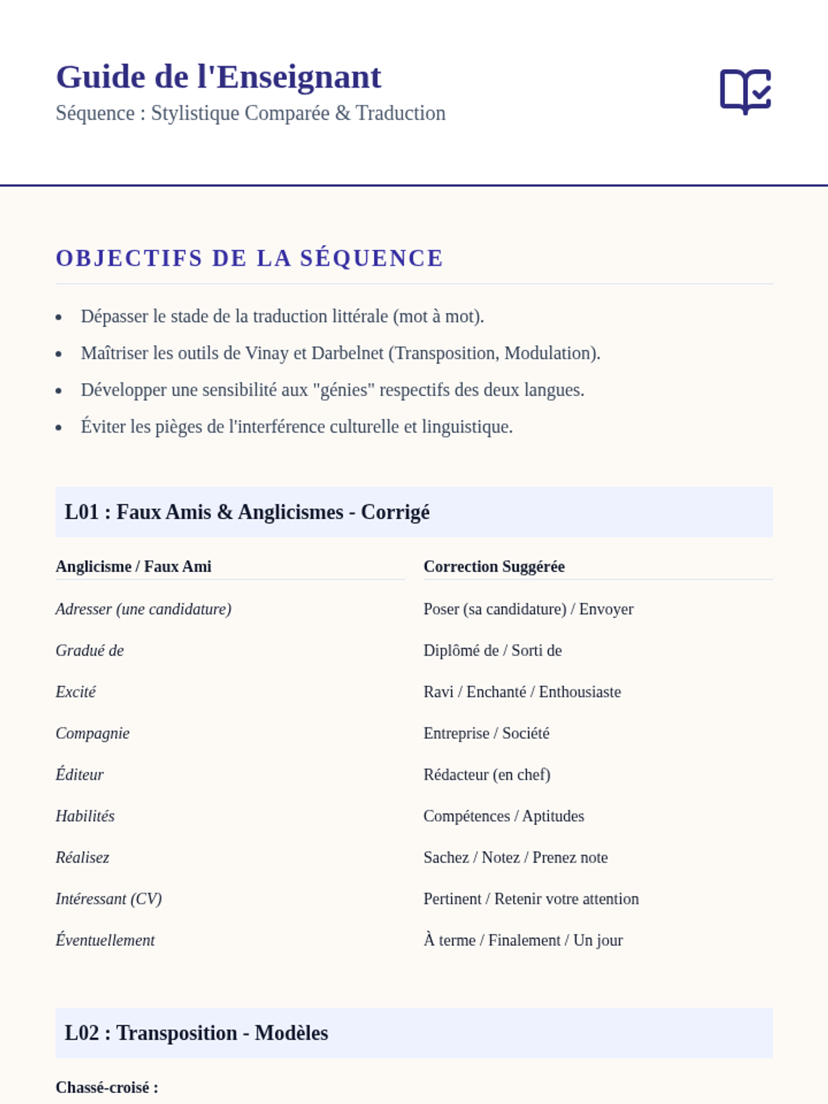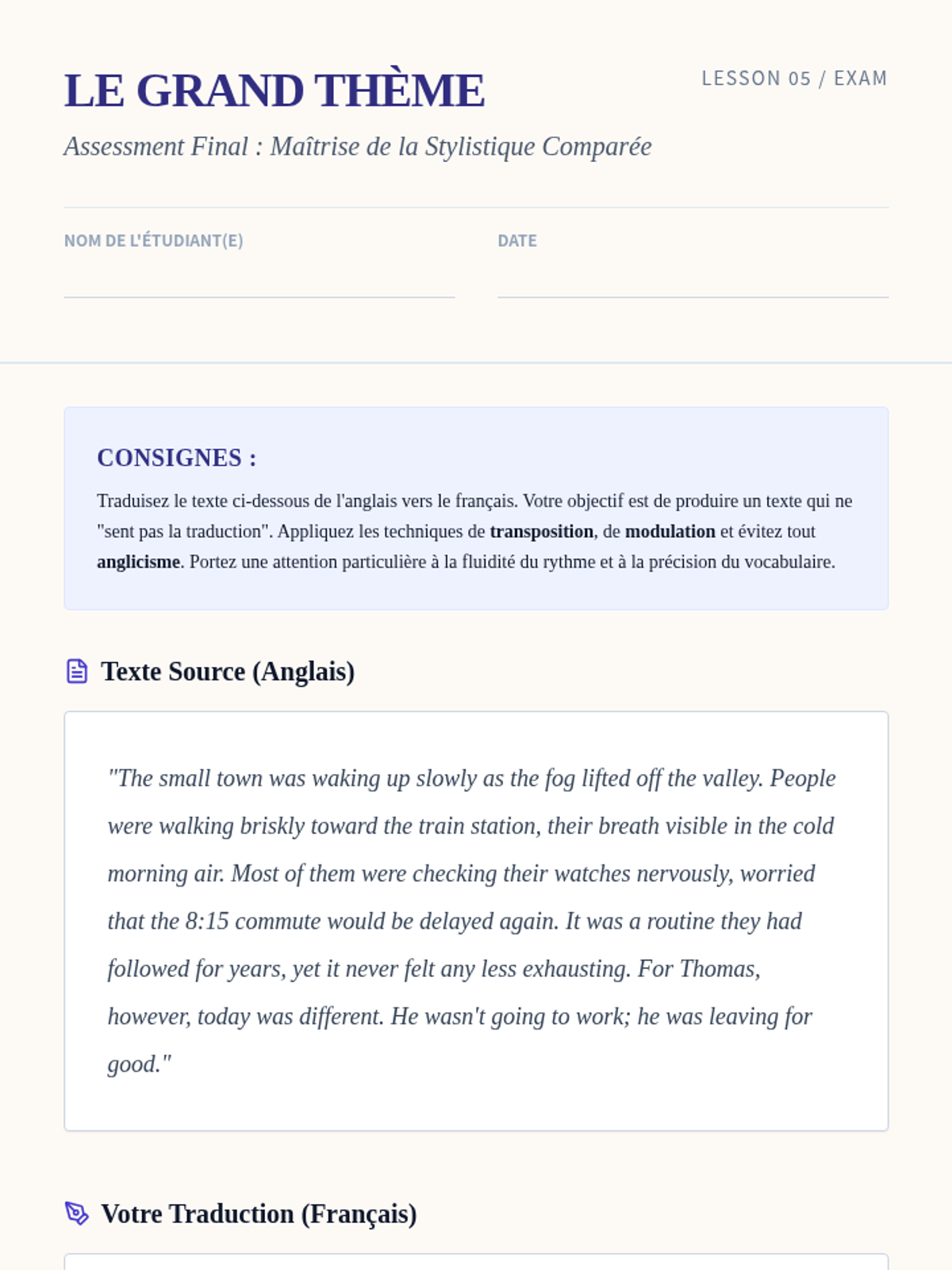 This advanced sequence explores the stylistic differences between English and French, equipping undergraduate students with professional translation techniques like transposition, modulation, and cultural mediation to produce authentic-sounding French text.