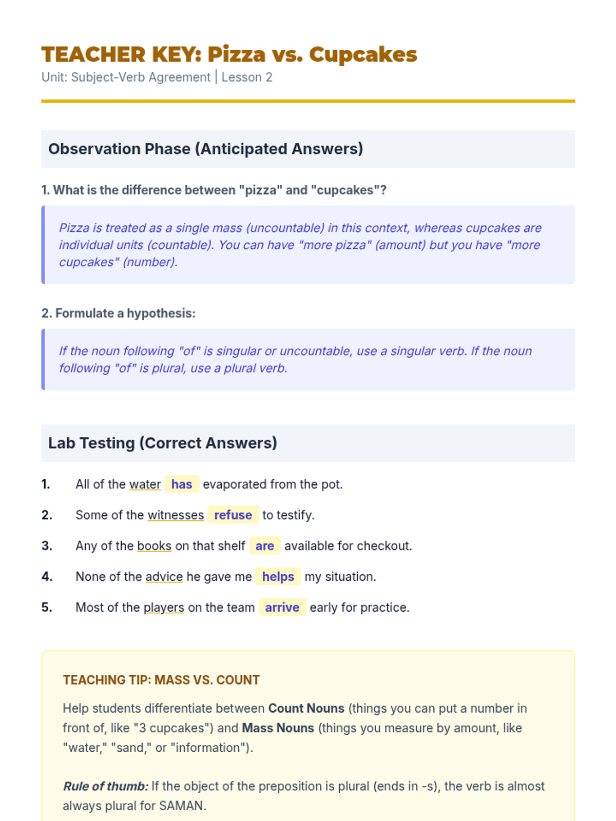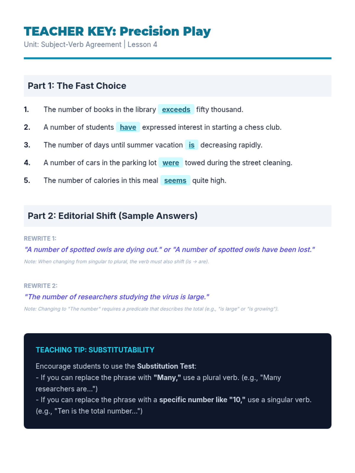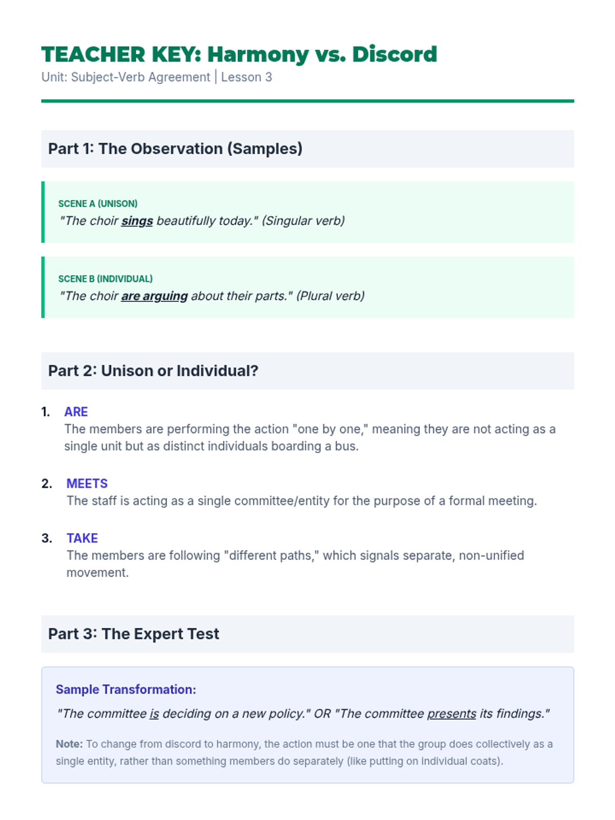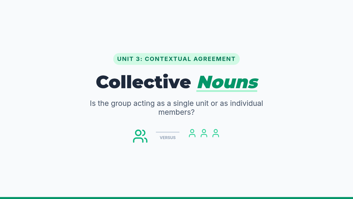 This grammar sequence for 8th-grade students explores the complexities of subject-verb agreement with collective nouns and indefinite pronouns. Students will analyze when groups act as singular units versus plural individuals, mastering rules for fractional expressions and idiomatic phrases like 'a number' versus 'the number.'