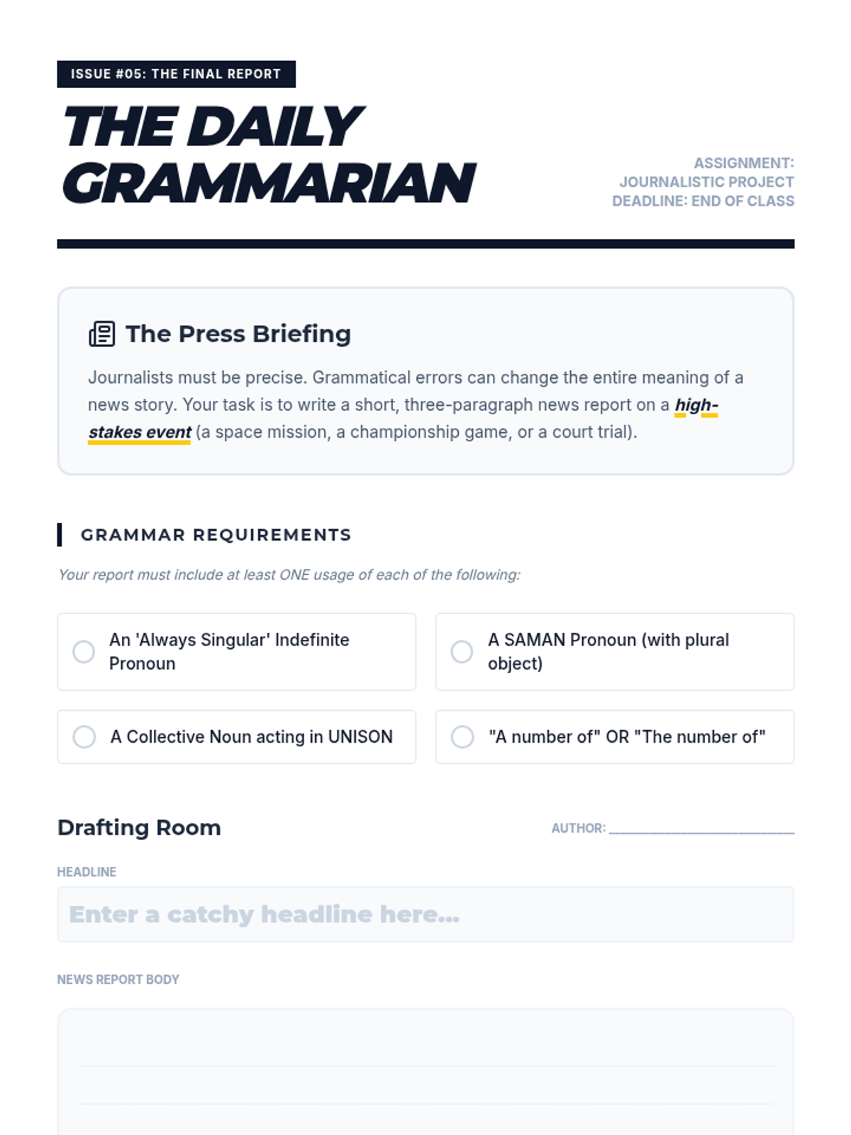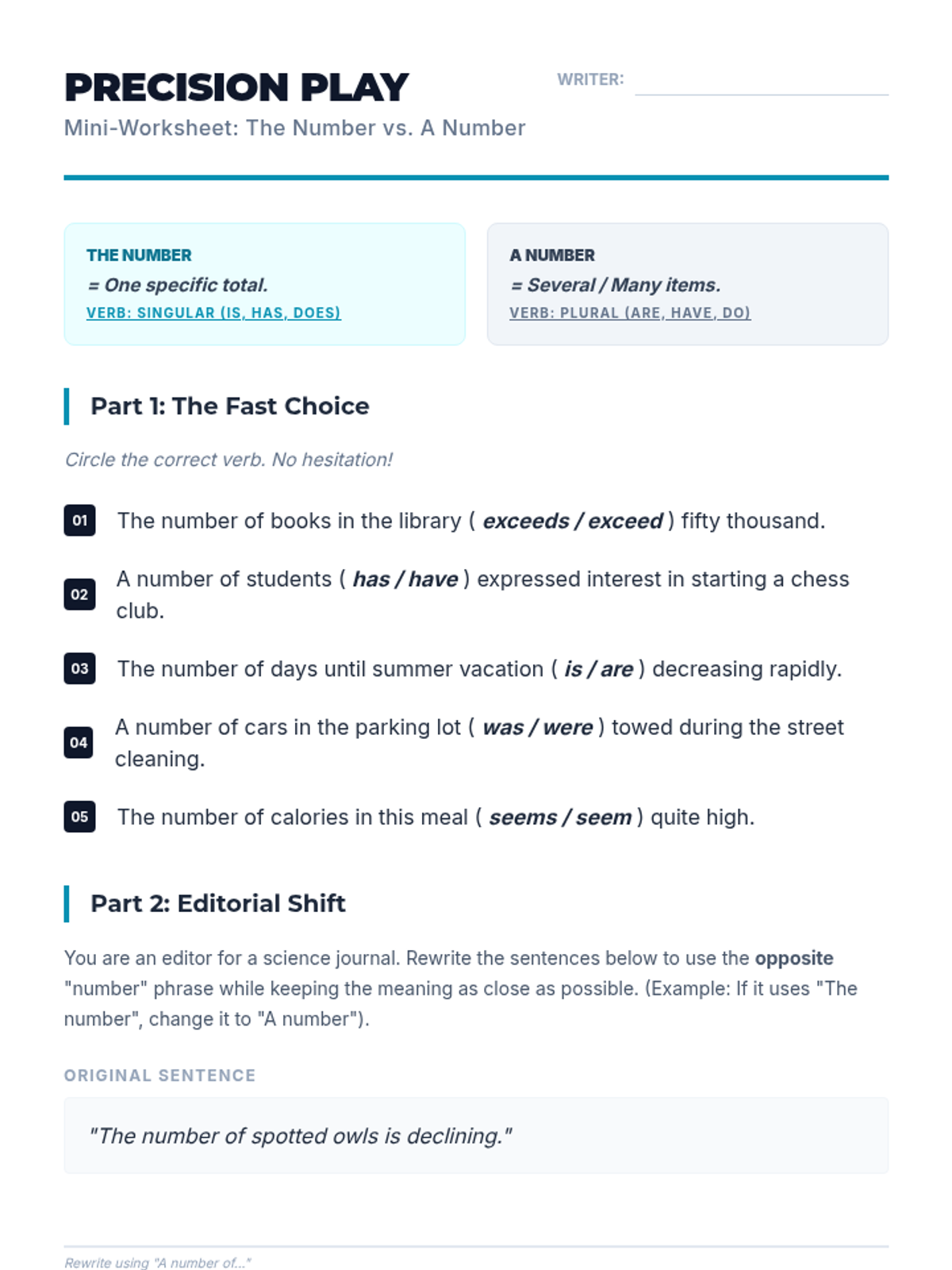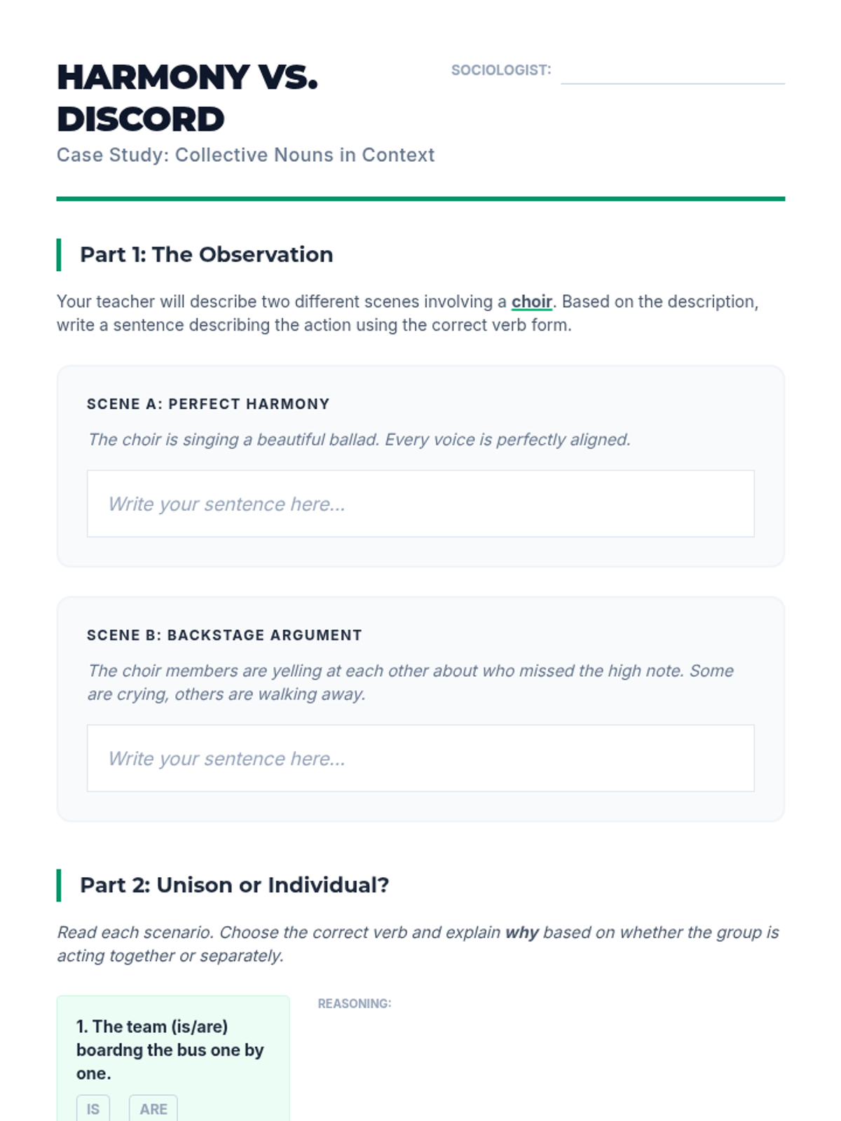 This grammar sequence for 8th-grade students explores the complexities of subject-verb agreement with collective nouns and indefinite pronouns. Students will analyze when groups act as singular units versus plural individuals, mastering rules for fractional expressions and idiomatic phrases like 'a number' versus 'the number.'