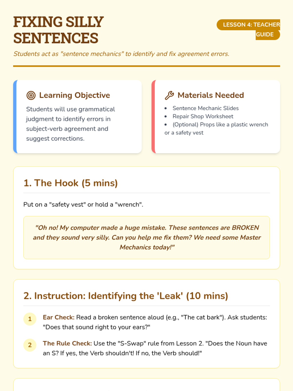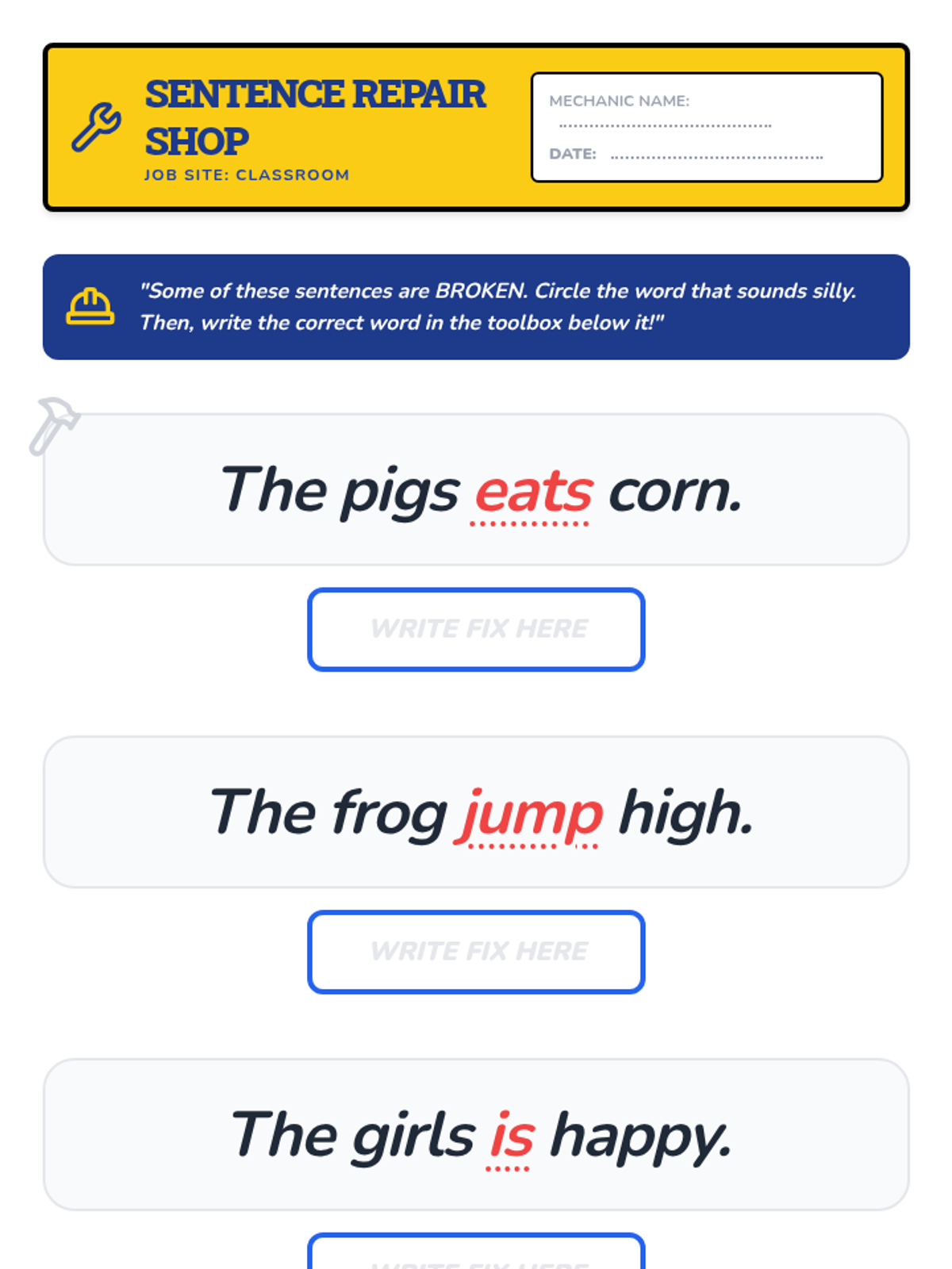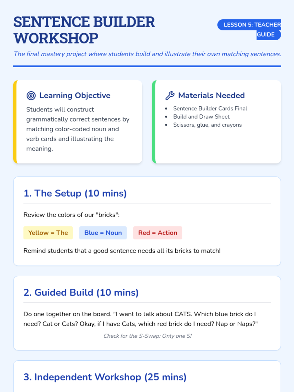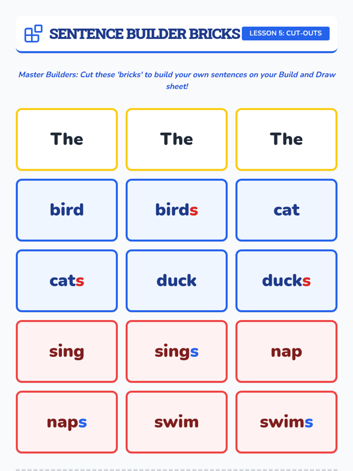 A Kindergarten ELA unit focused on subject-verb agreement. Students learn to match singular and plural subjects with correct verb forms through hands-on activities, games, and sentence building.