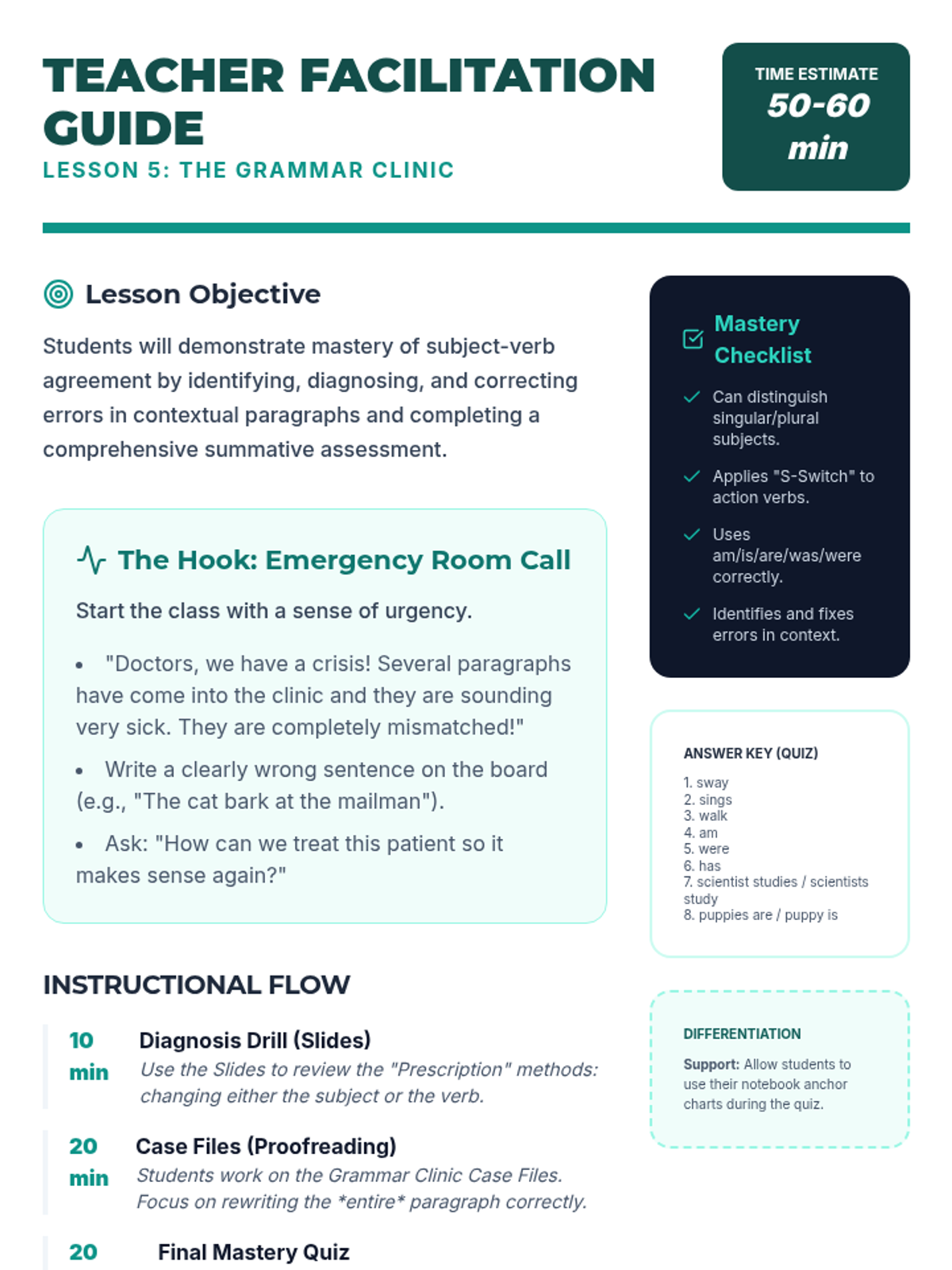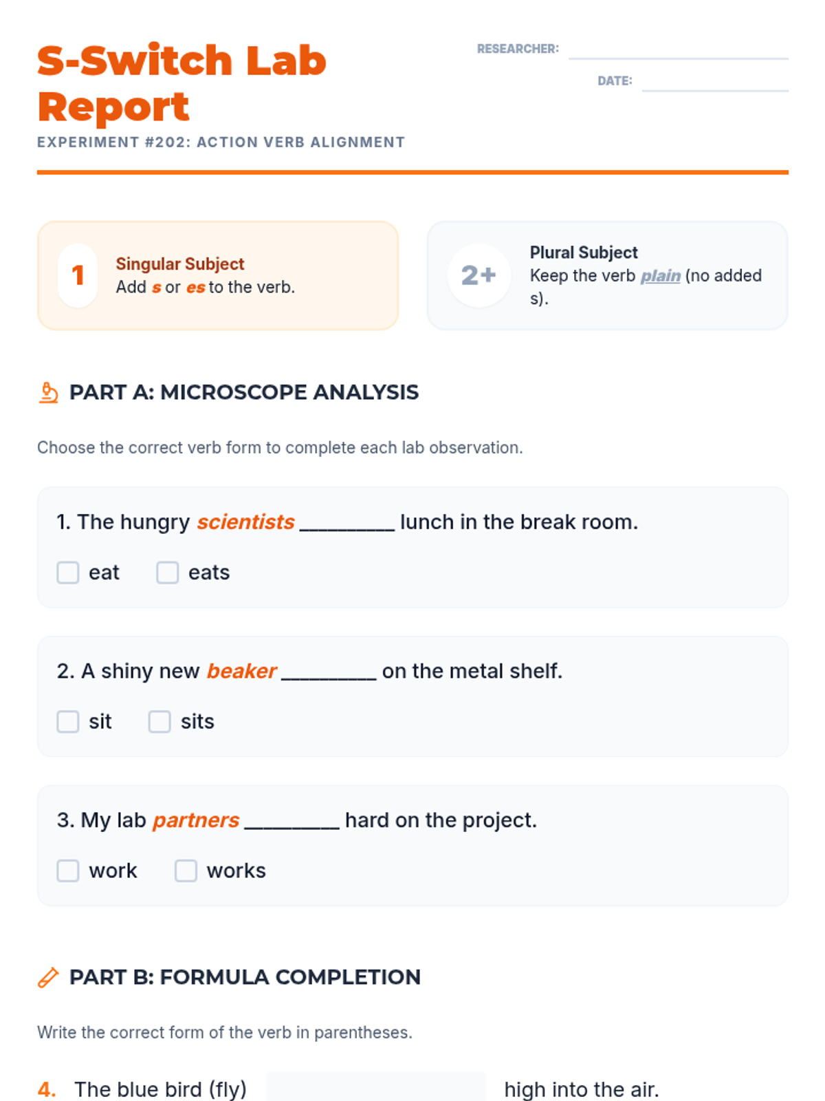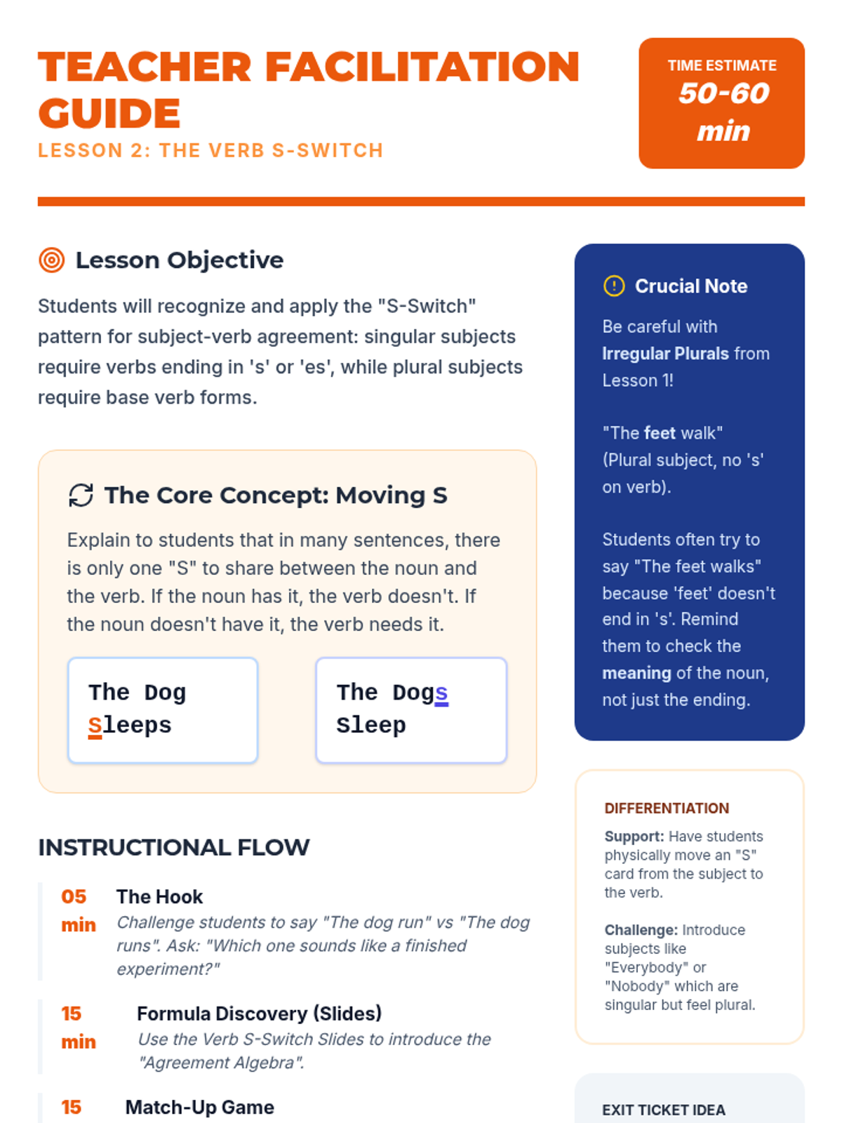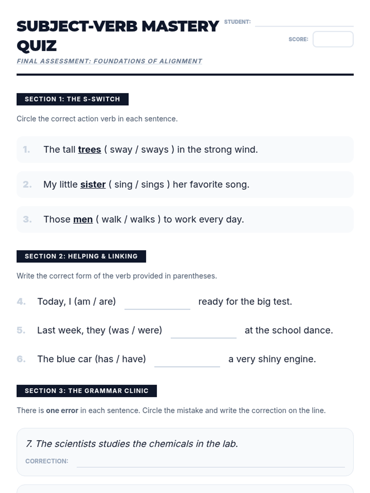 This sequence establishes the fundamental rules of subject-verb agreement for 4th graders, focusing on singular vs. plural subjects, action verb markers (the 'S-Switch'), irregular auxiliary verbs, and proofreading techniques. Students progress from simple noun categorization to complex sentence construction and error analysis.