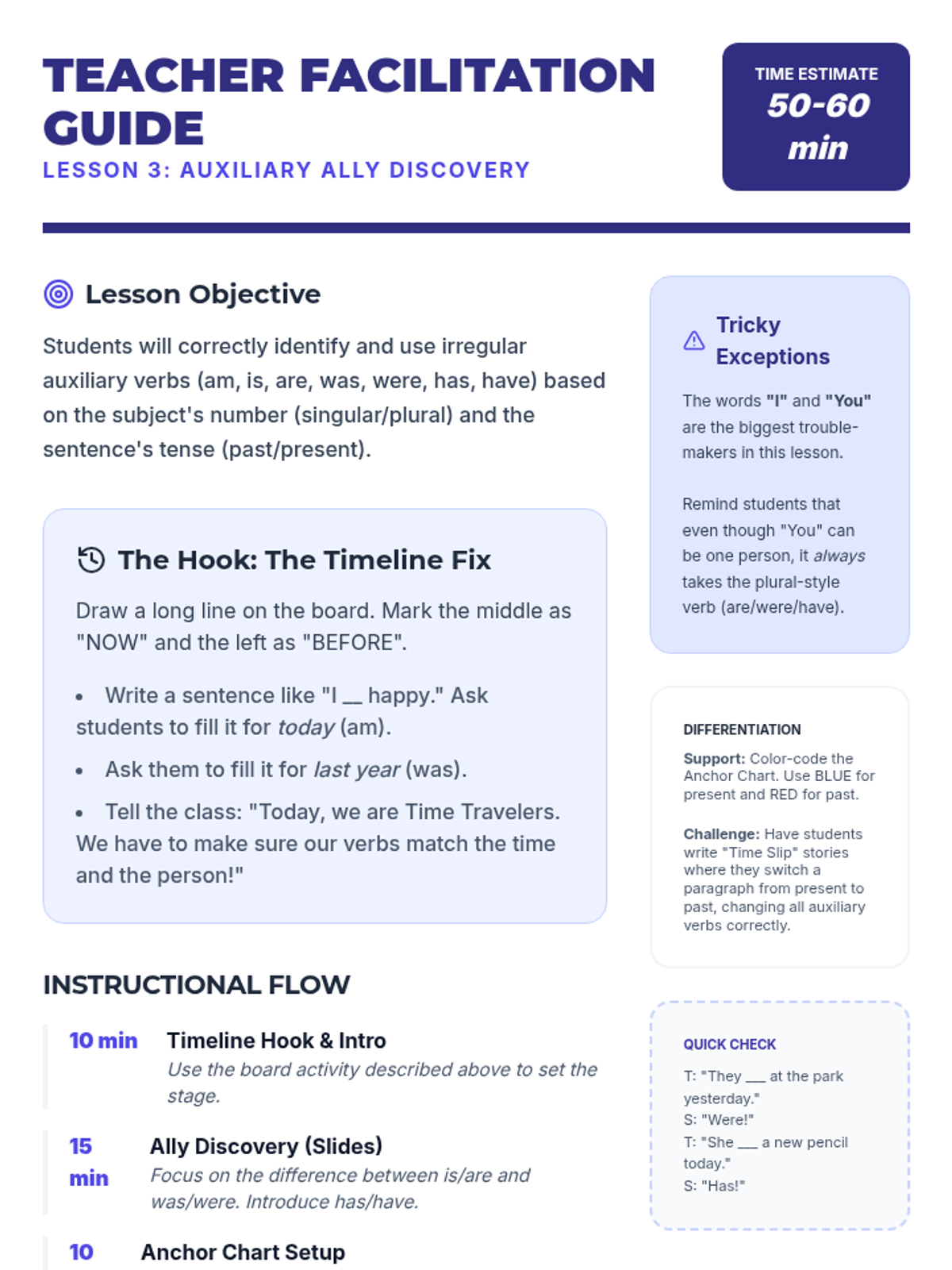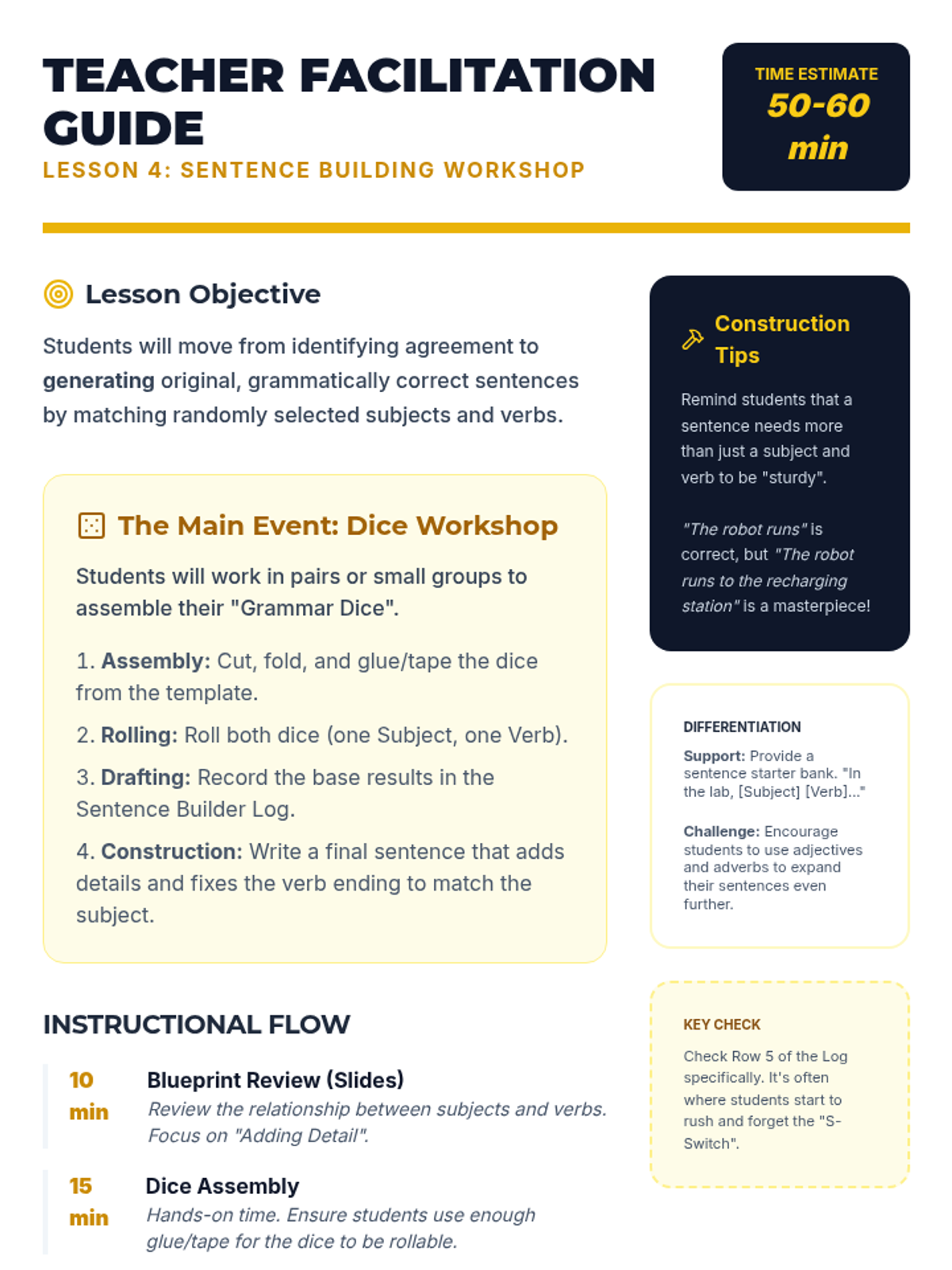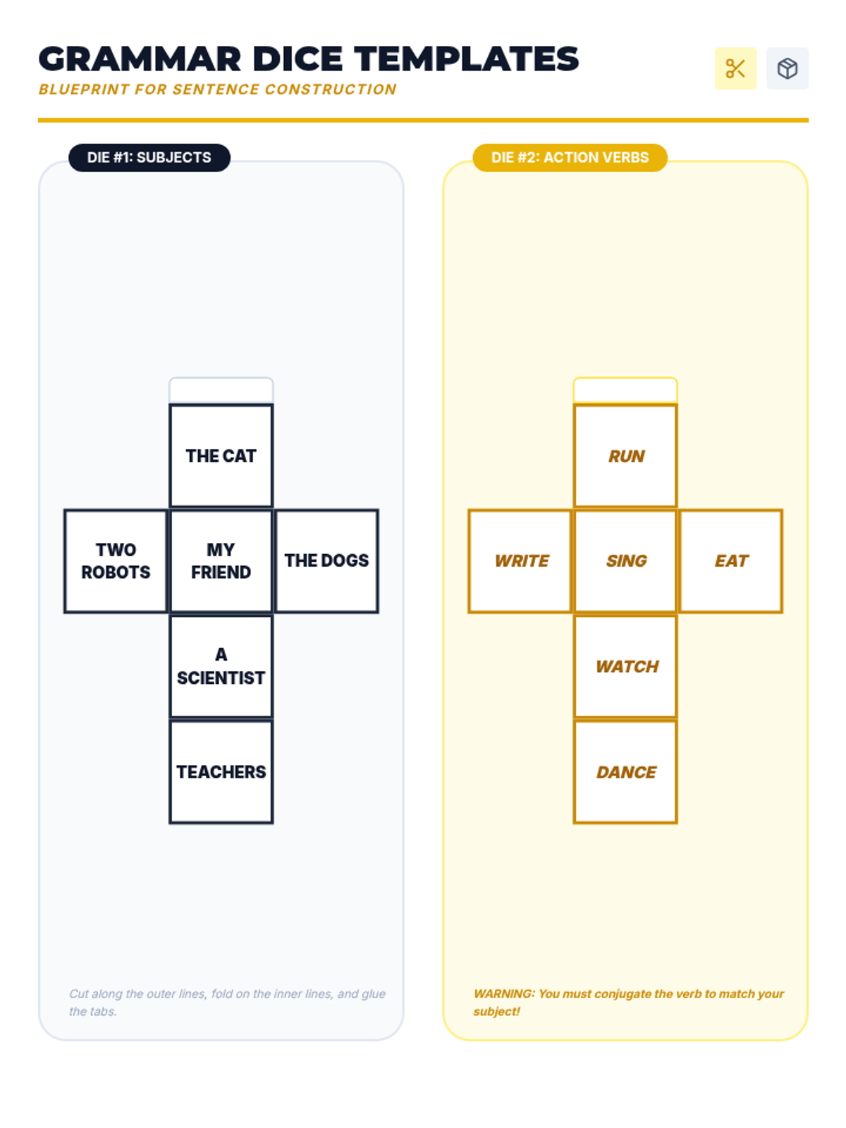 This sequence establishes the fundamental rules of subject-verb agreement for 4th graders, focusing on singular vs. plural subjects, action verb markers (the 'S-Switch'), irregular auxiliary verbs, and proofreading techniques. Students progress from simple noun categorization to complex sentence construction and error analysis.