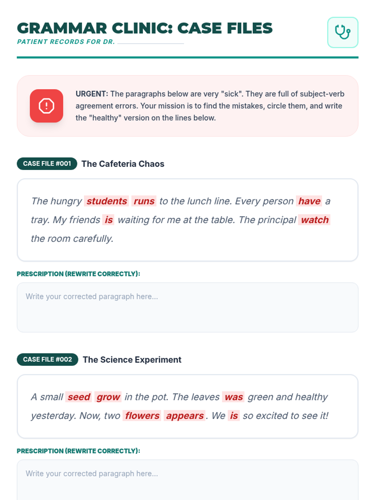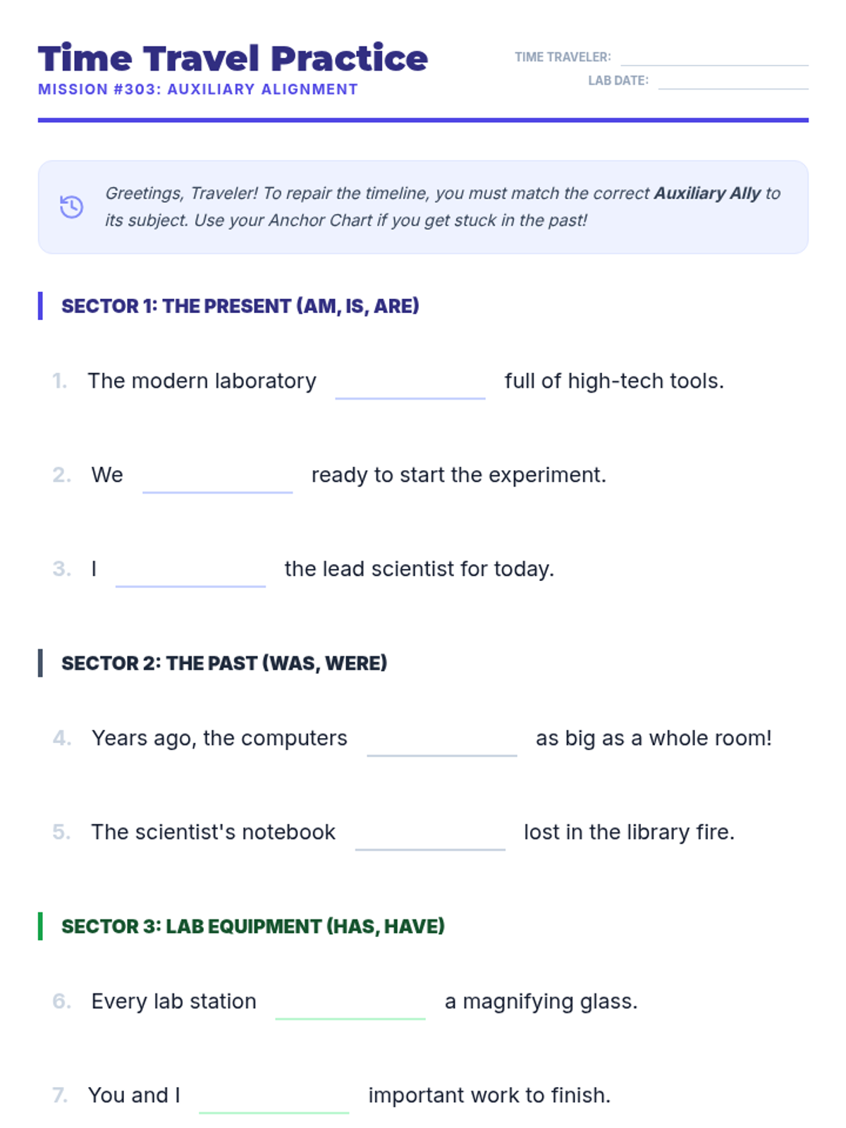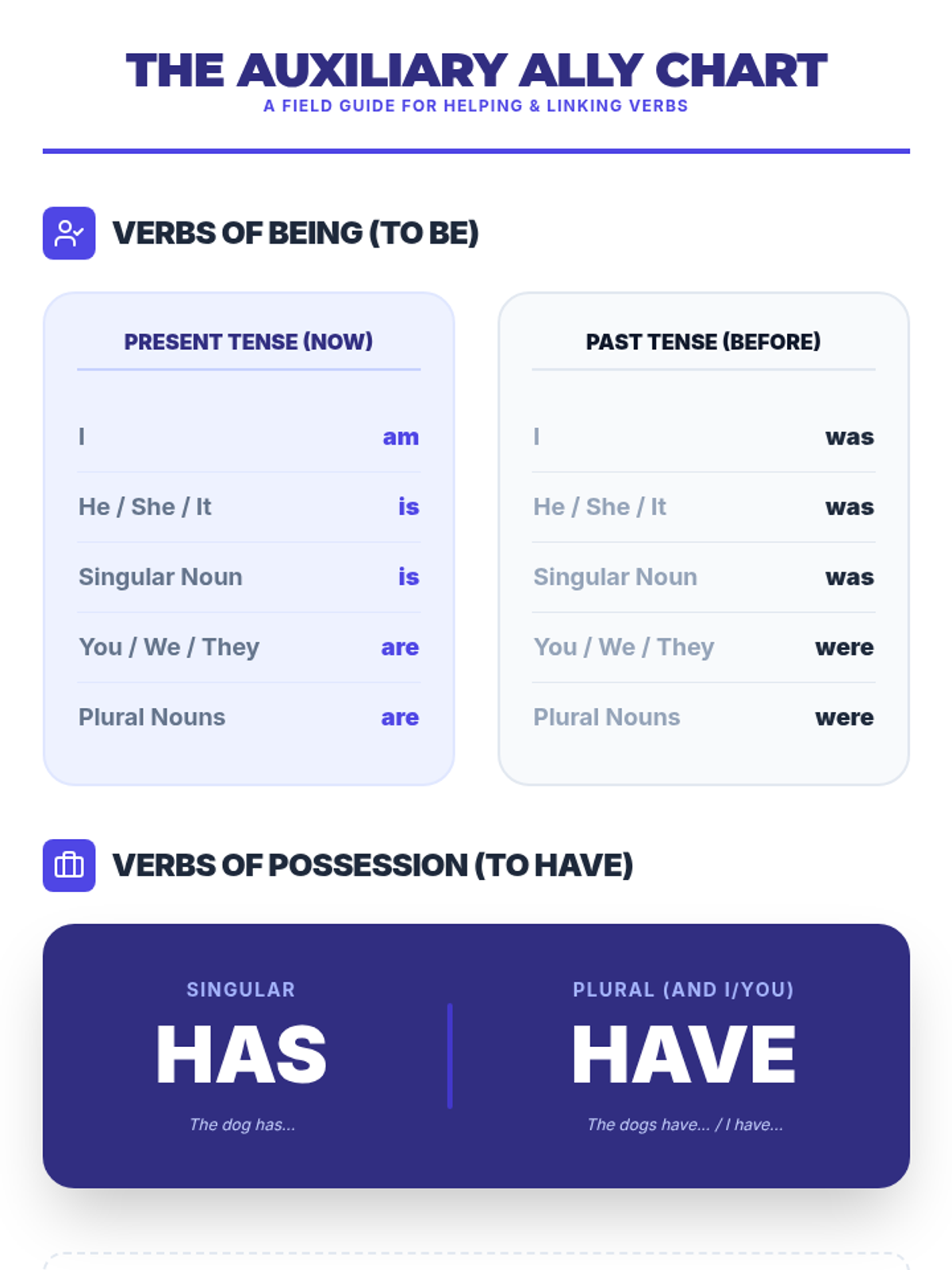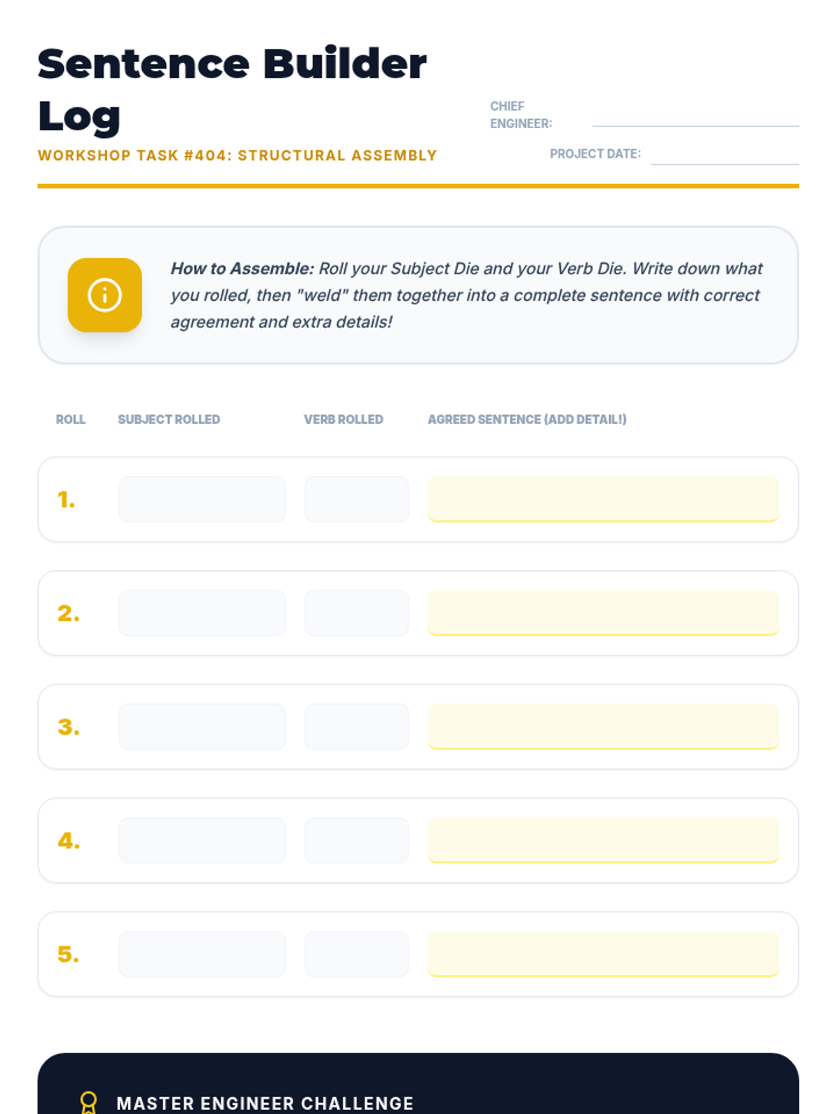 This sequence establishes the fundamental rules of subject-verb agreement for 4th graders, focusing on singular vs. plural subjects, action verb markers (the 'S-Switch'), irregular auxiliary verbs, and proofreading techniques. Students progress from simple noun categorization to complex sentence construction and error analysis.