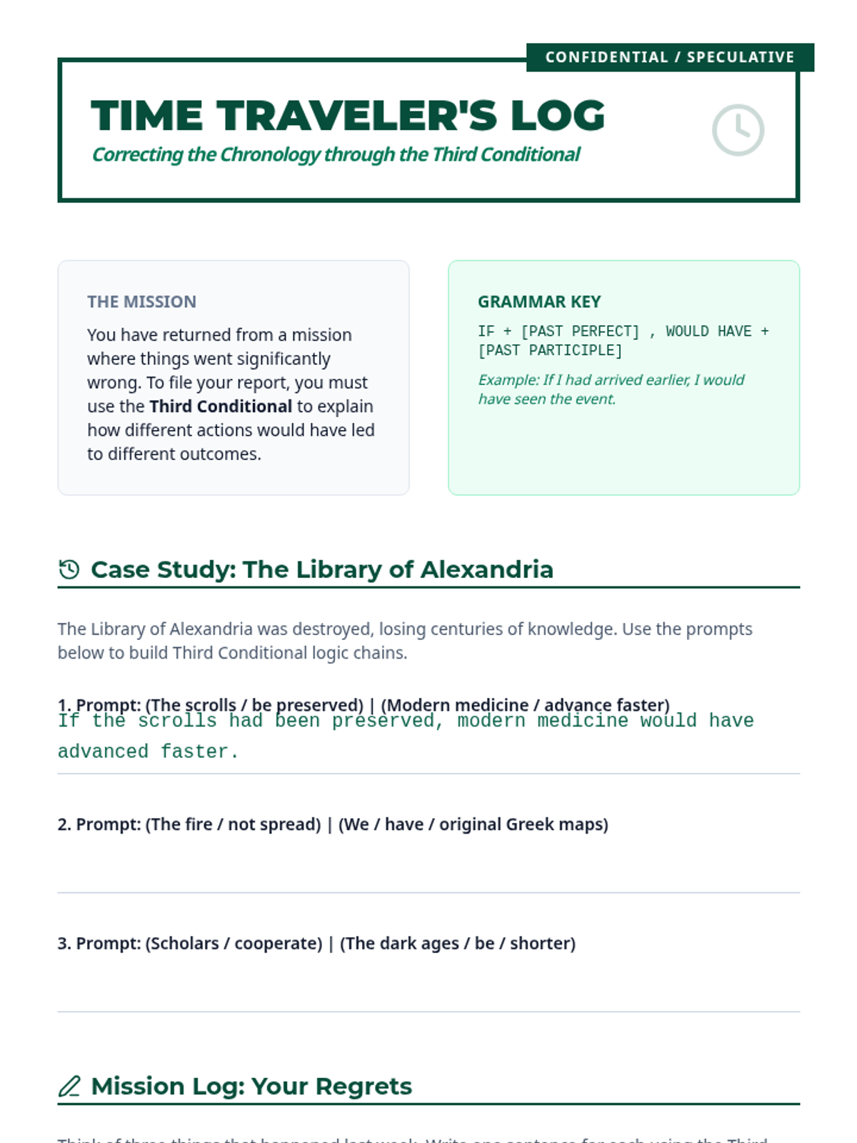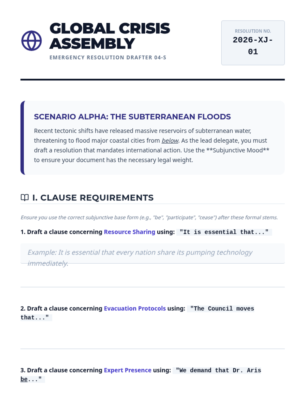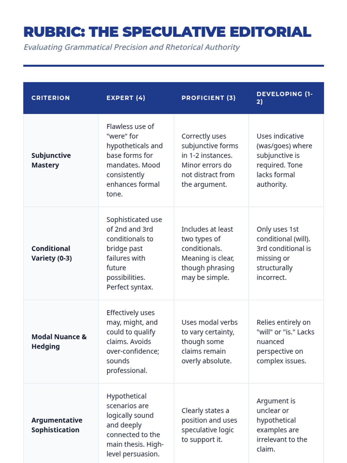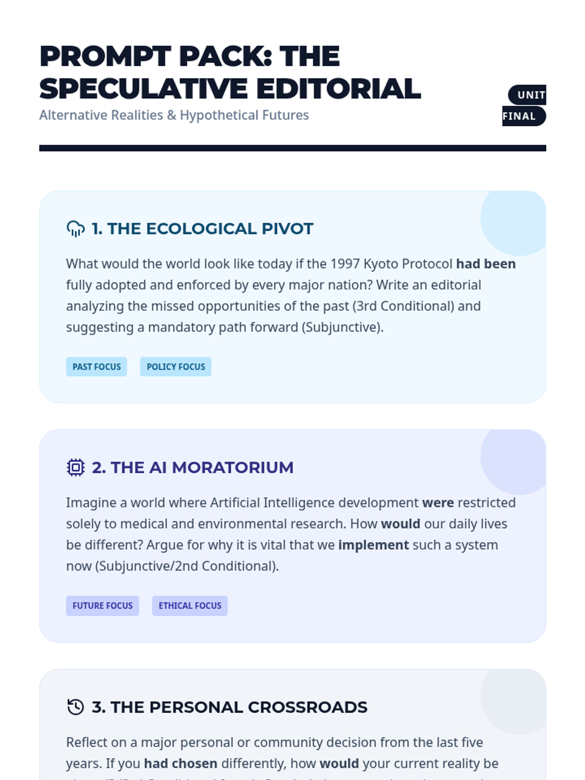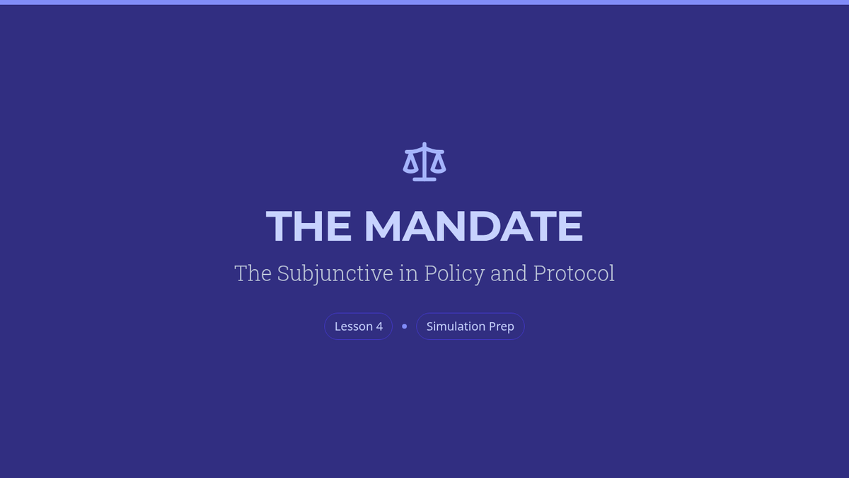 A comprehensive sequence for 12th-grade students focused on mastering the subjunctive mood and conditional tenses. Students progress from foundational grammatical structures to complex speculative argumentation and formal policy drafting.