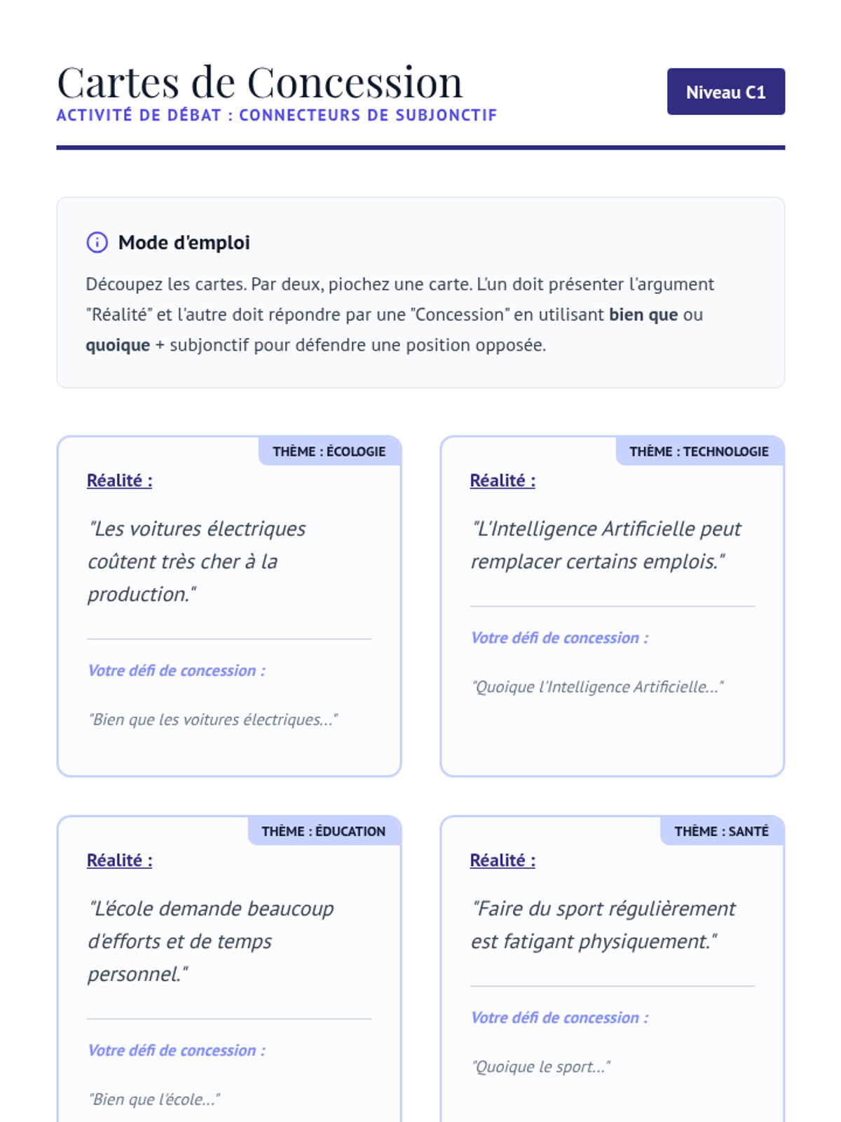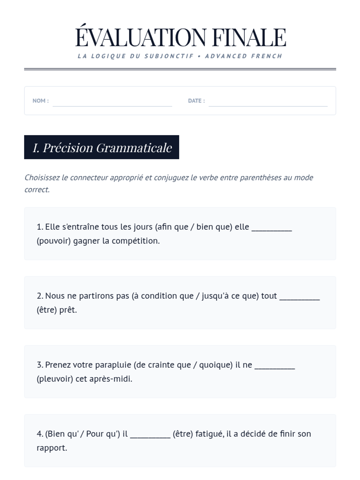 A comprehensive sequence for 11th Grade Advanced French focusing on conjunctions that trigger the subjunctive mood, emphasizing logical relationships in analytical writing.