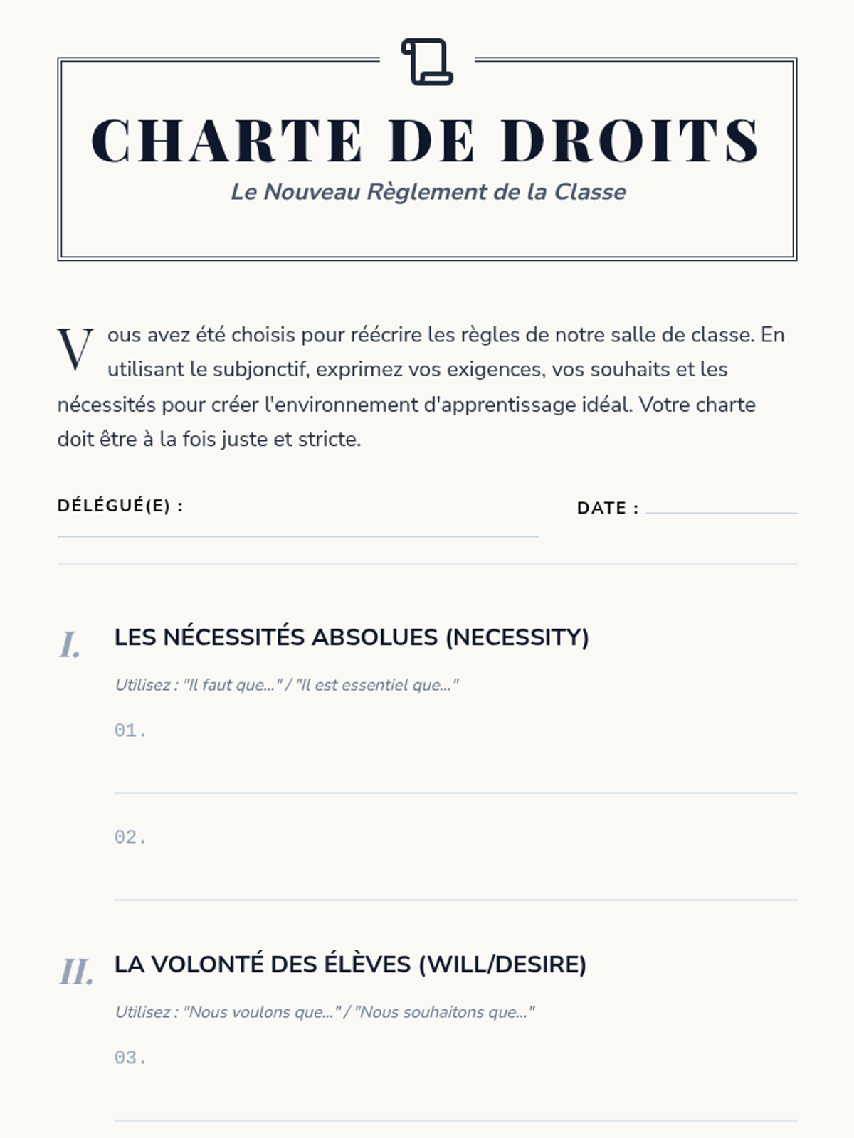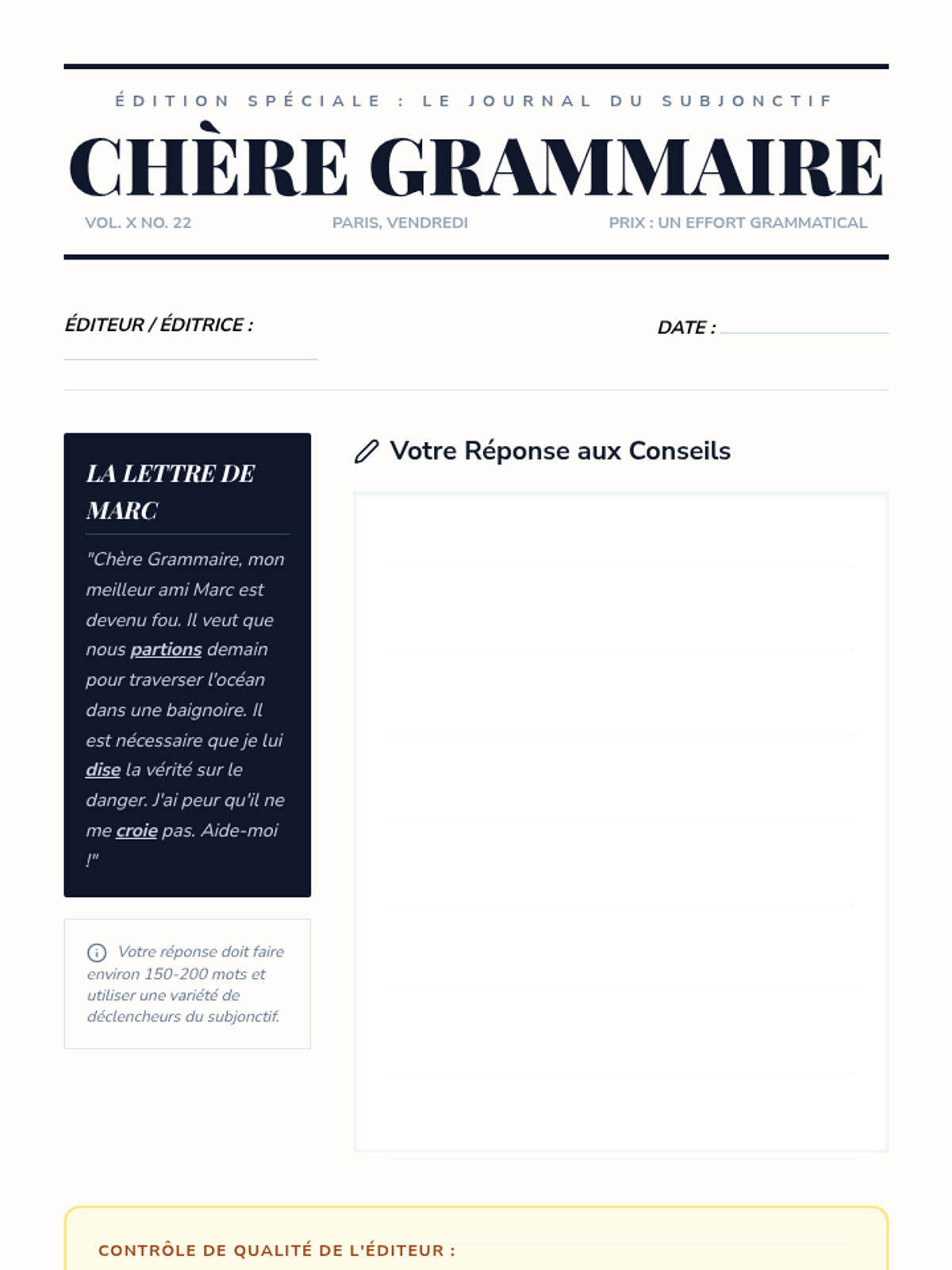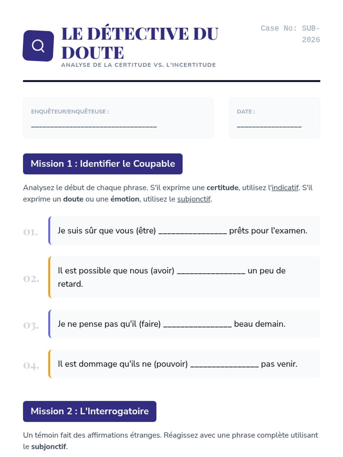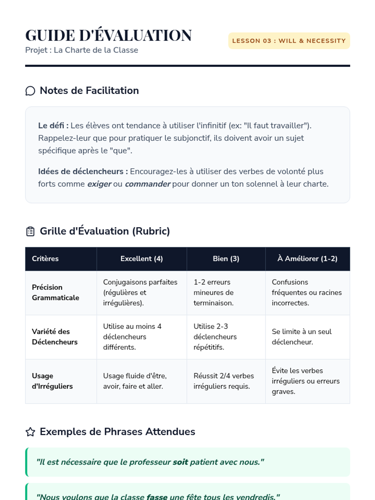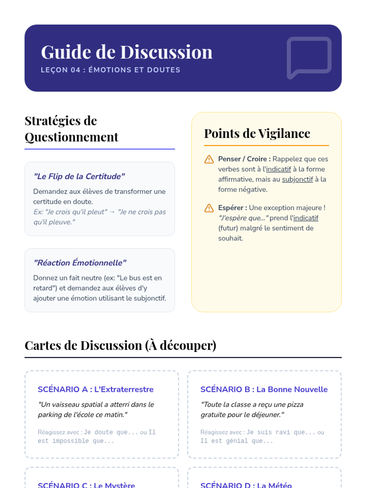 A comprehensive unit for 10th Grade French students exploring the subjunctive mood. Students transition from the indicative 'reality' to the subjunctive 'subjectivity' through the lenses of will, emotion, necessity, and doubt, culminating in a persuasive writing assessment.