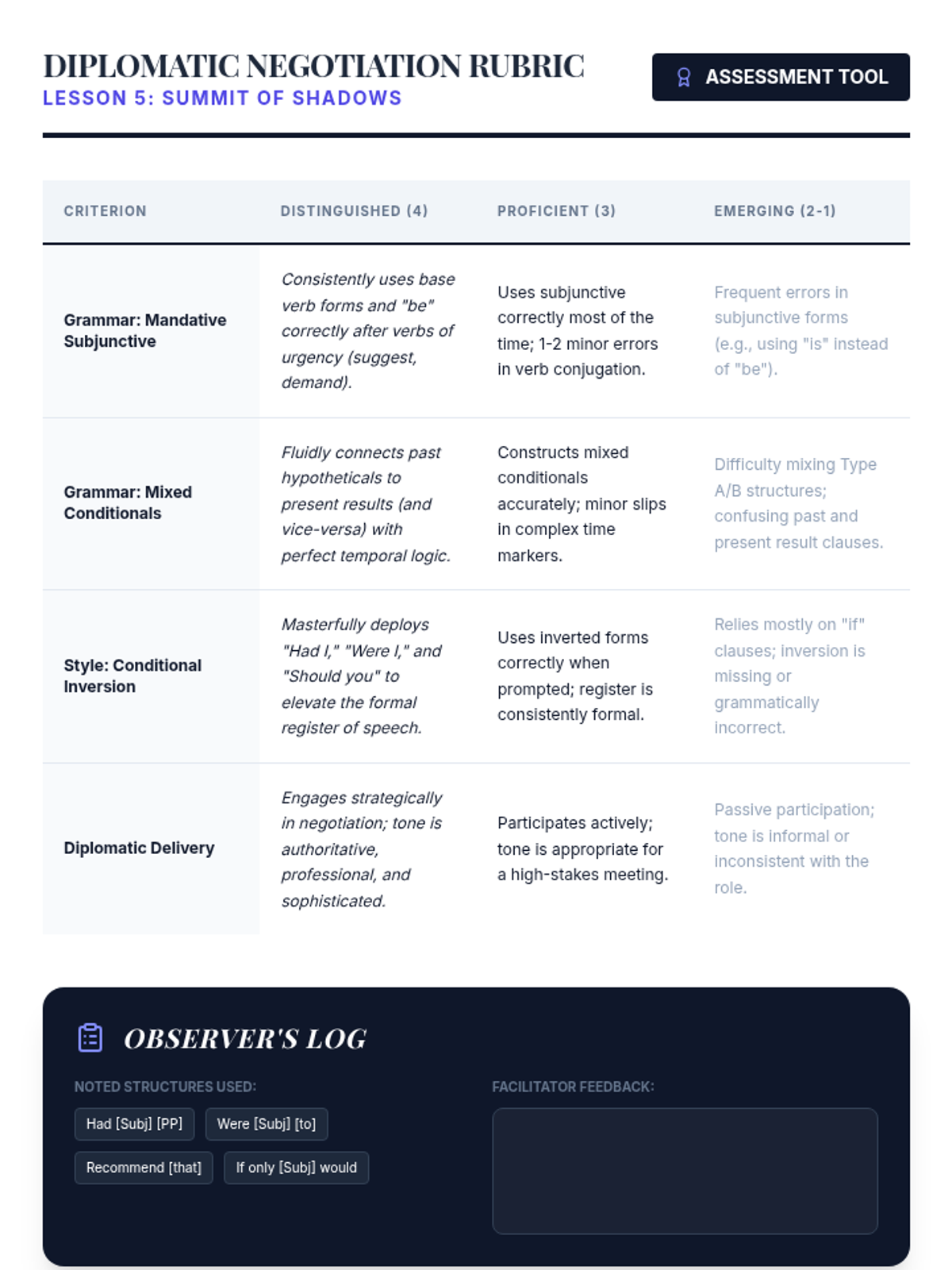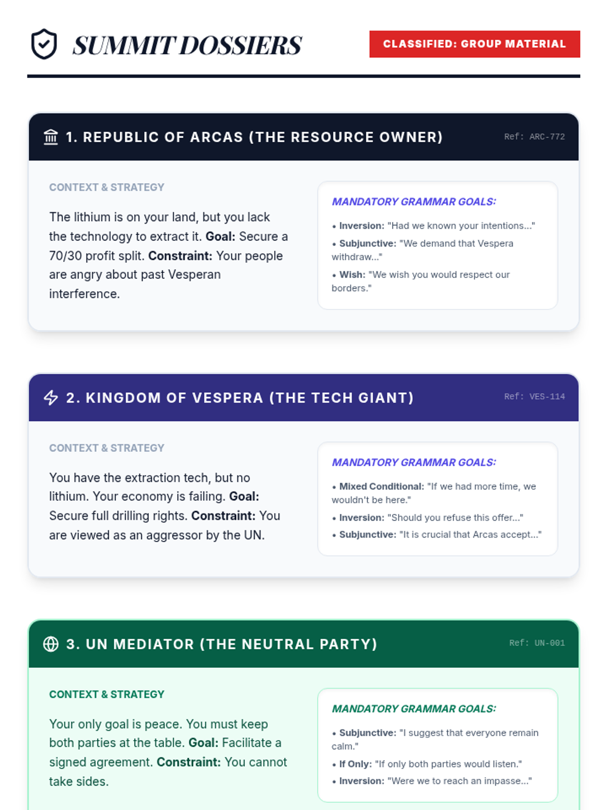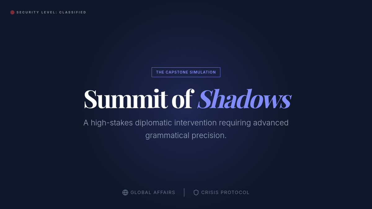 This advanced grammar sequence guides students through the complexities of the subjunctive mood and advanced conditionals. Moving from formal corporate recommendations to literary inversions and diplomatic negotiations, students master how to express hypotheticals, desires, and formal proposals with precision and sophistication.