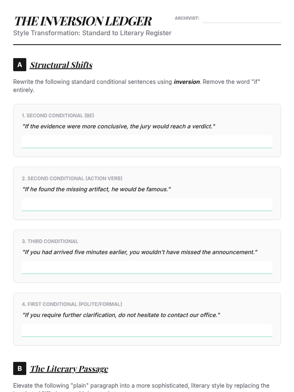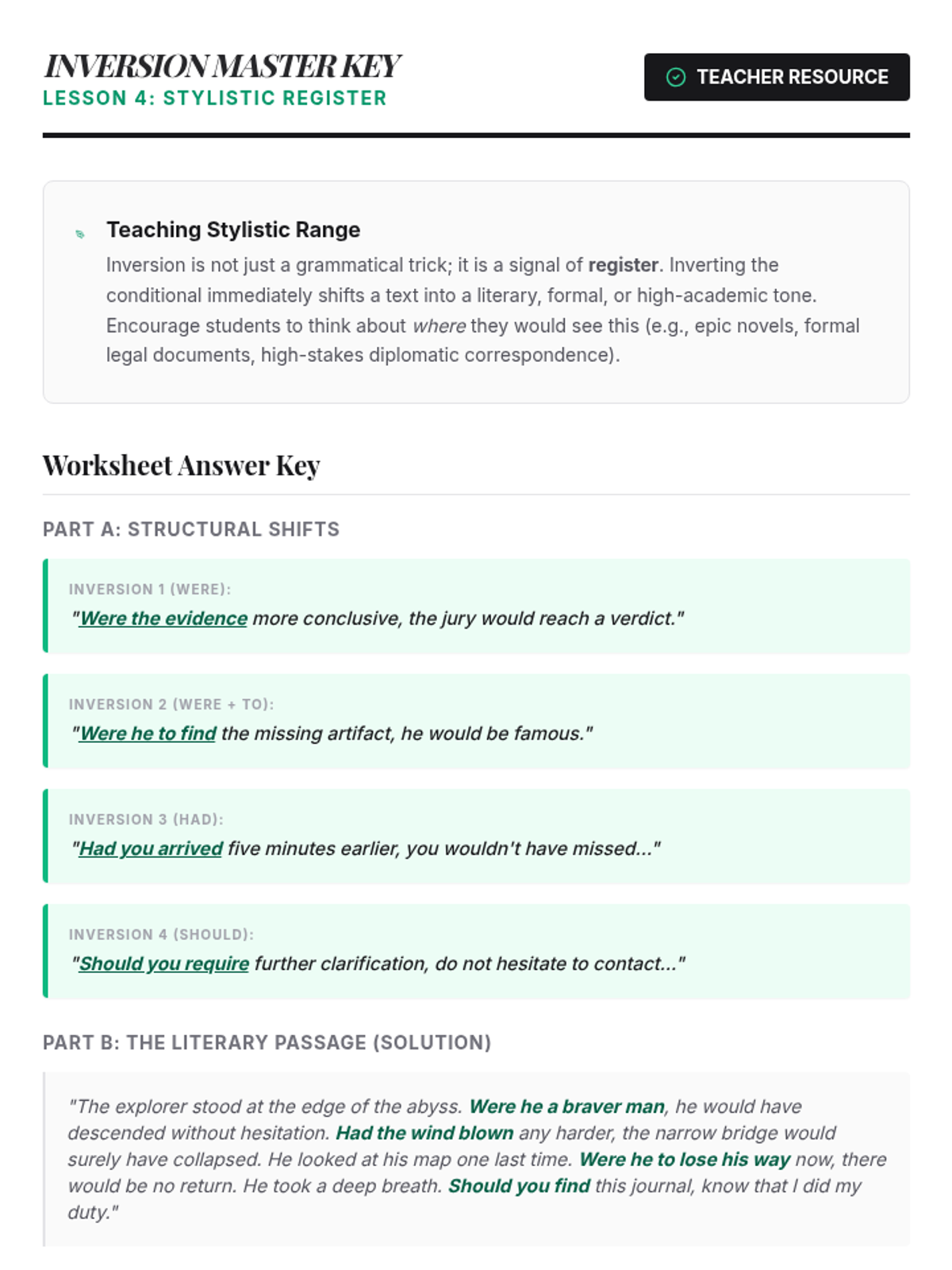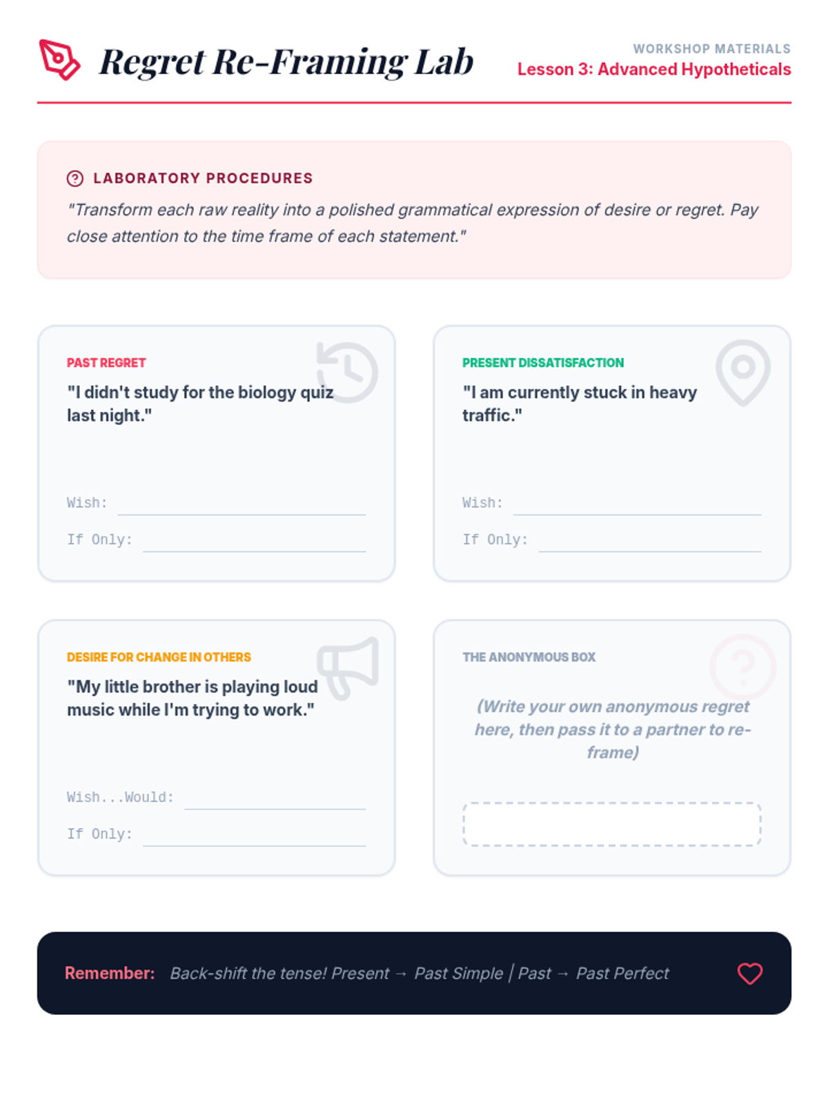 This advanced grammar sequence guides students through the complexities of the subjunctive mood and advanced conditionals. Moving from formal corporate recommendations to literary inversions and diplomatic negotiations, students master how to express hypotheticals, desires, and formal proposals with precision and sophistication.
