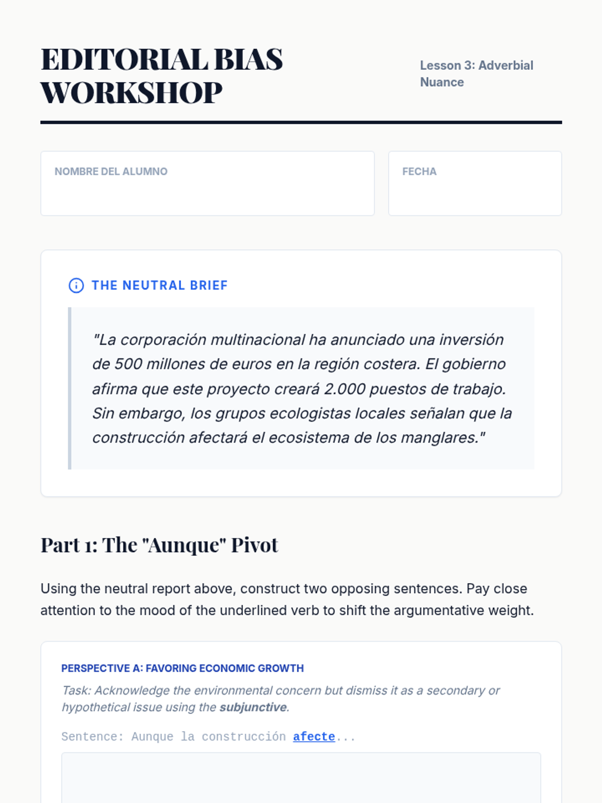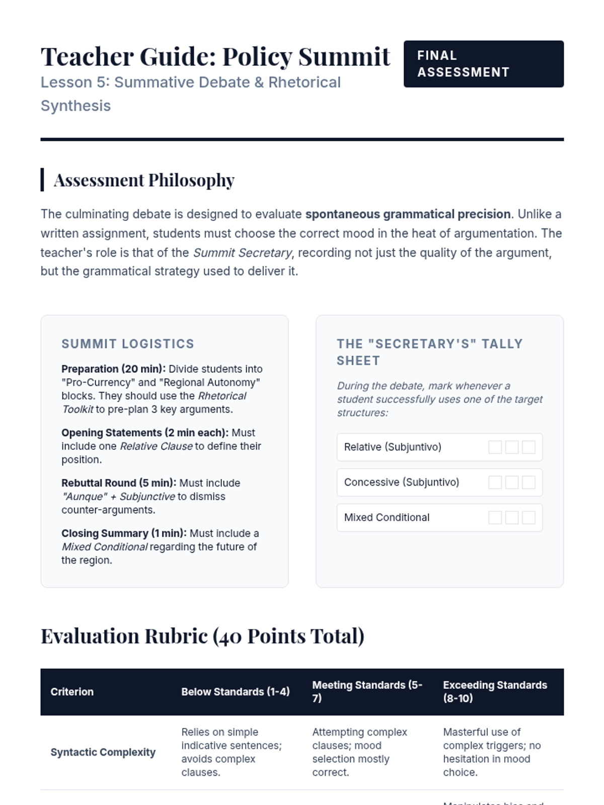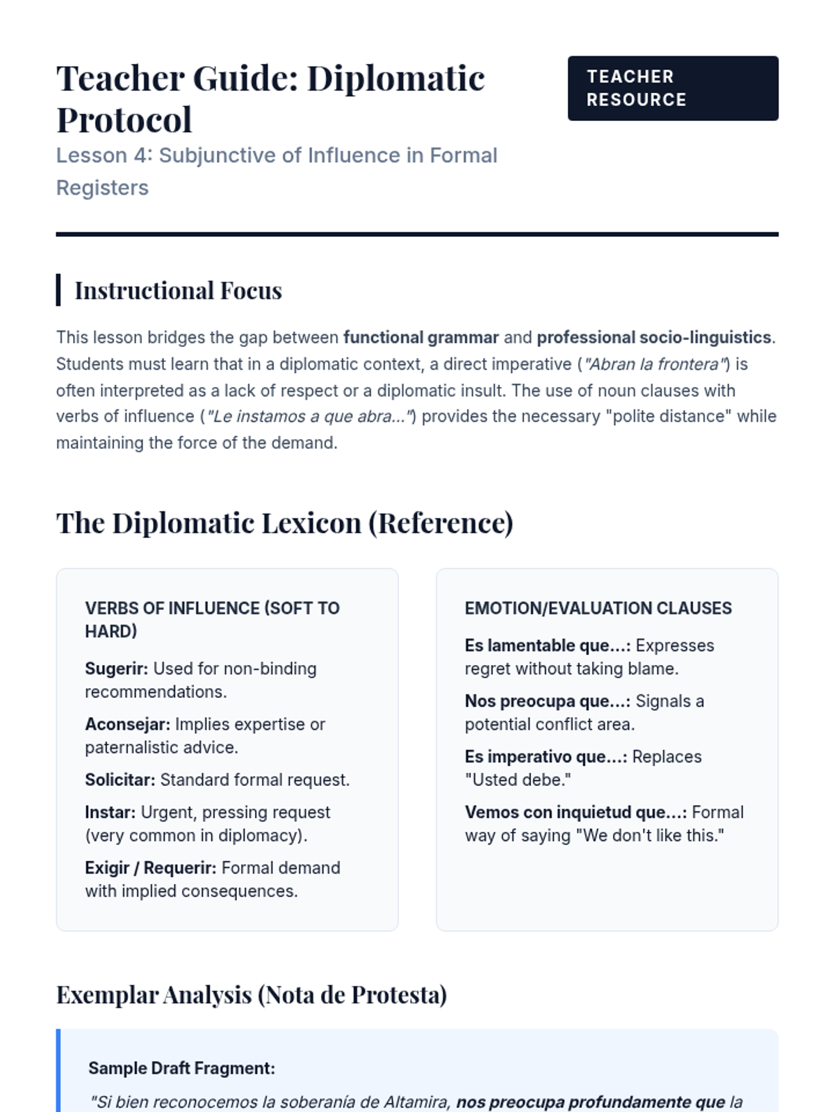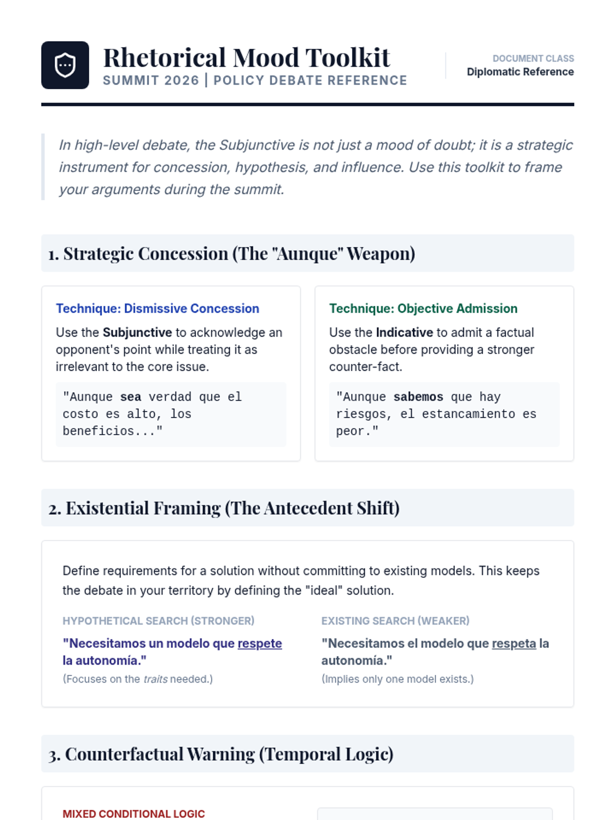 This advanced Spanish grammar sequence for graduate students explores the semantic nuances and rhetorical power of the subjunctive mood in professional and academic contexts. Students progress from analyzing subtle shifts in meaning in relative and adverbial clauses to mastering the strategic use of mood in formal diplomatic and policy discourse.