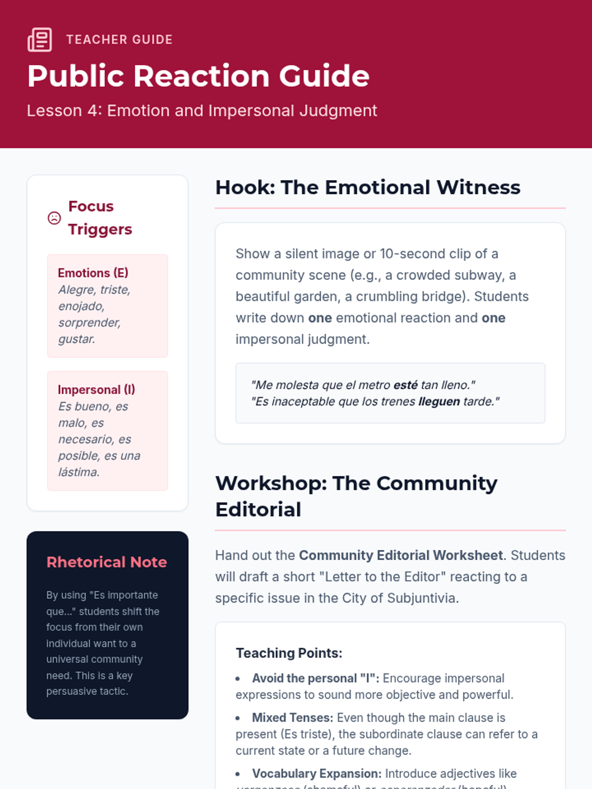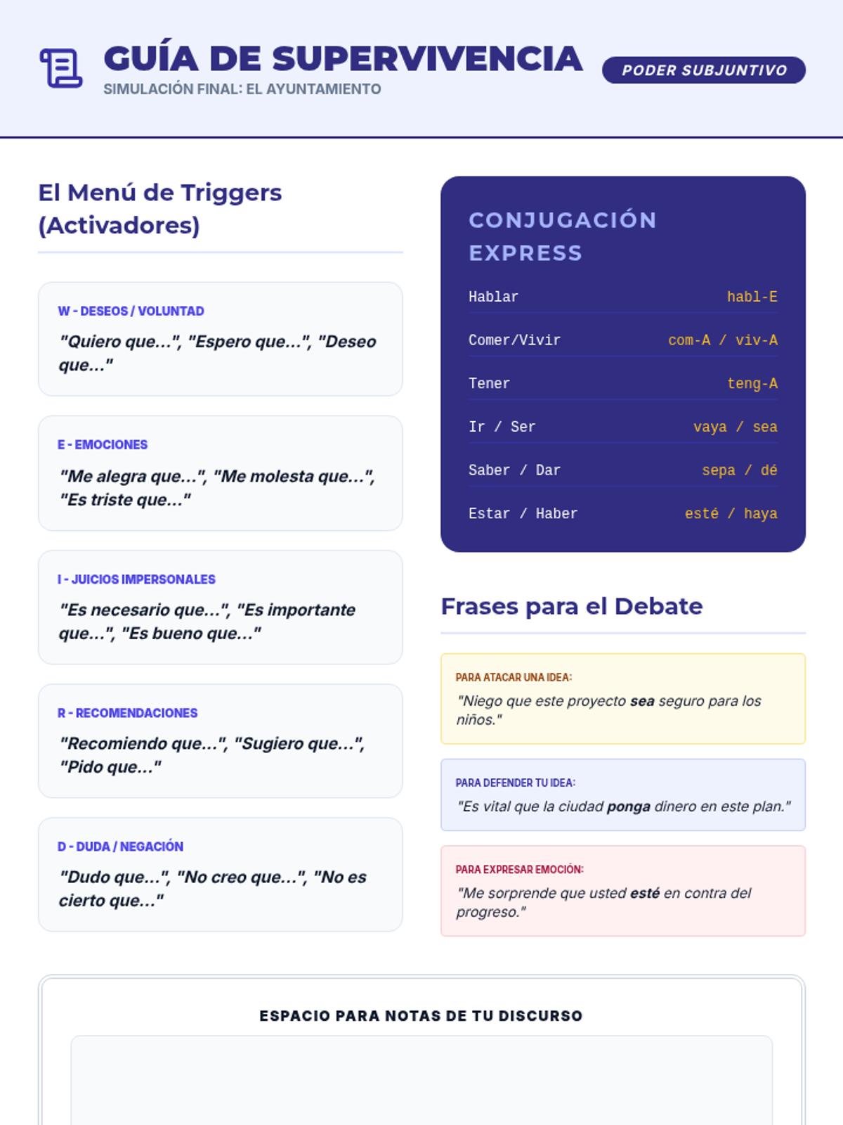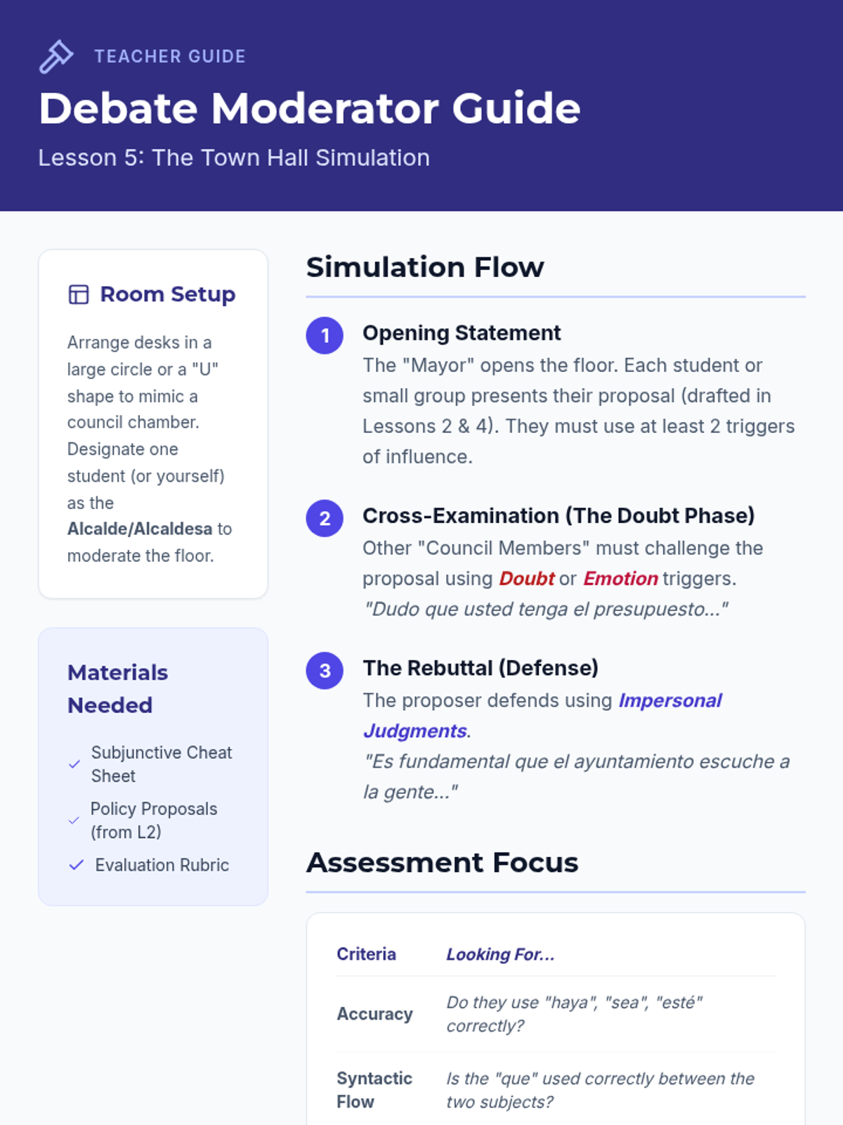 A simulation-based sequence where 9th-grade students act as community leaders to master the subjunctive mood in Spanish. Students move from identifying reality versus desire to persuading and debating in a mock town hall, focusing on influence, doubt, and emotion.