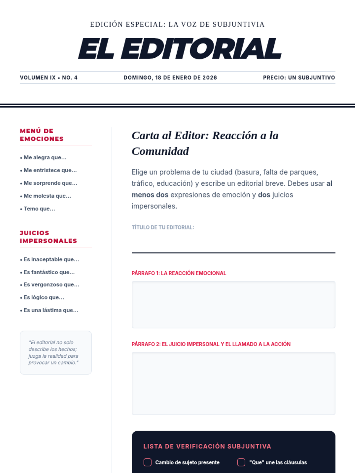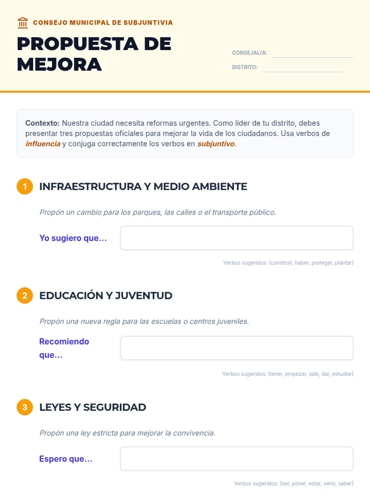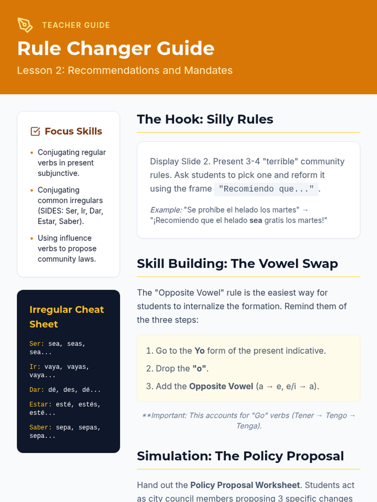 A simulation-based sequence where 9th-grade students act as community leaders to master the subjunctive mood in Spanish. Students move from identifying reality versus desire to persuading and debating in a mock town hall, focusing on influence, doubt, and emotion.