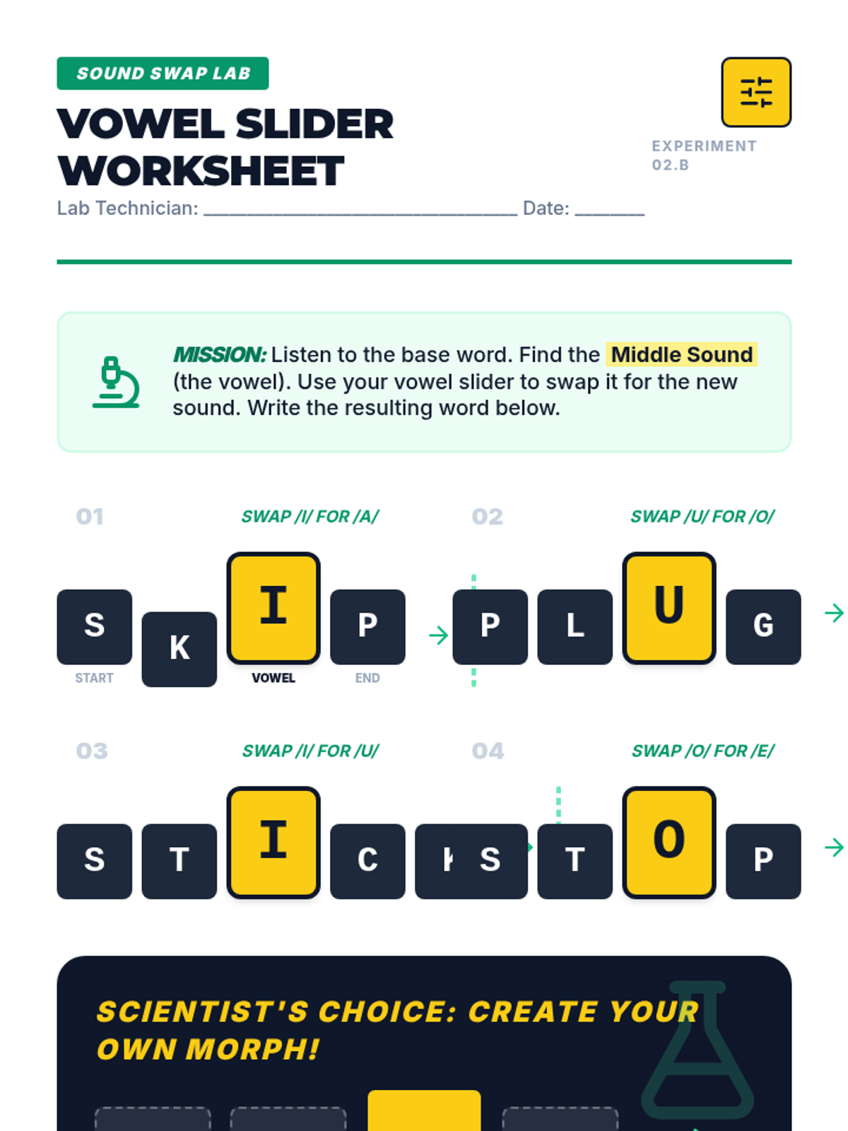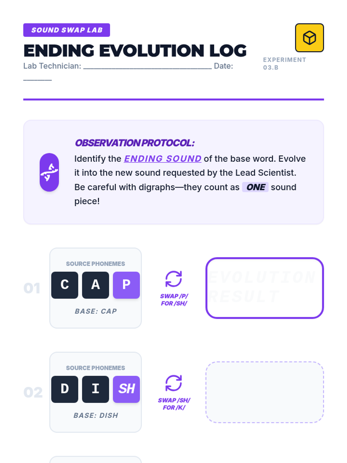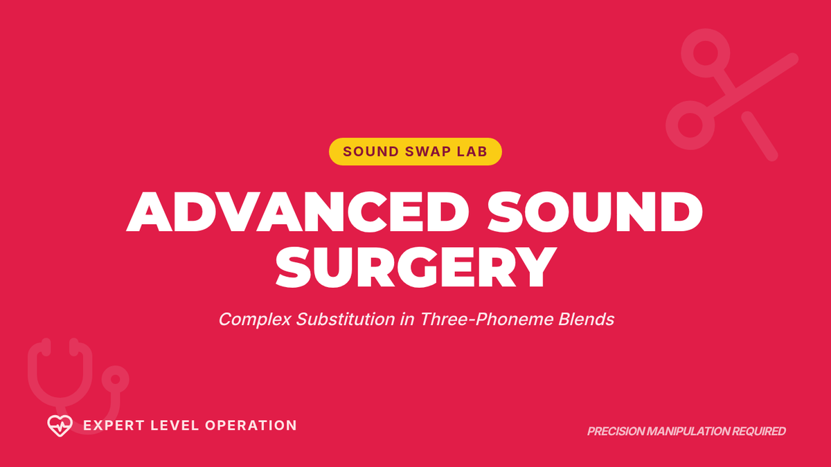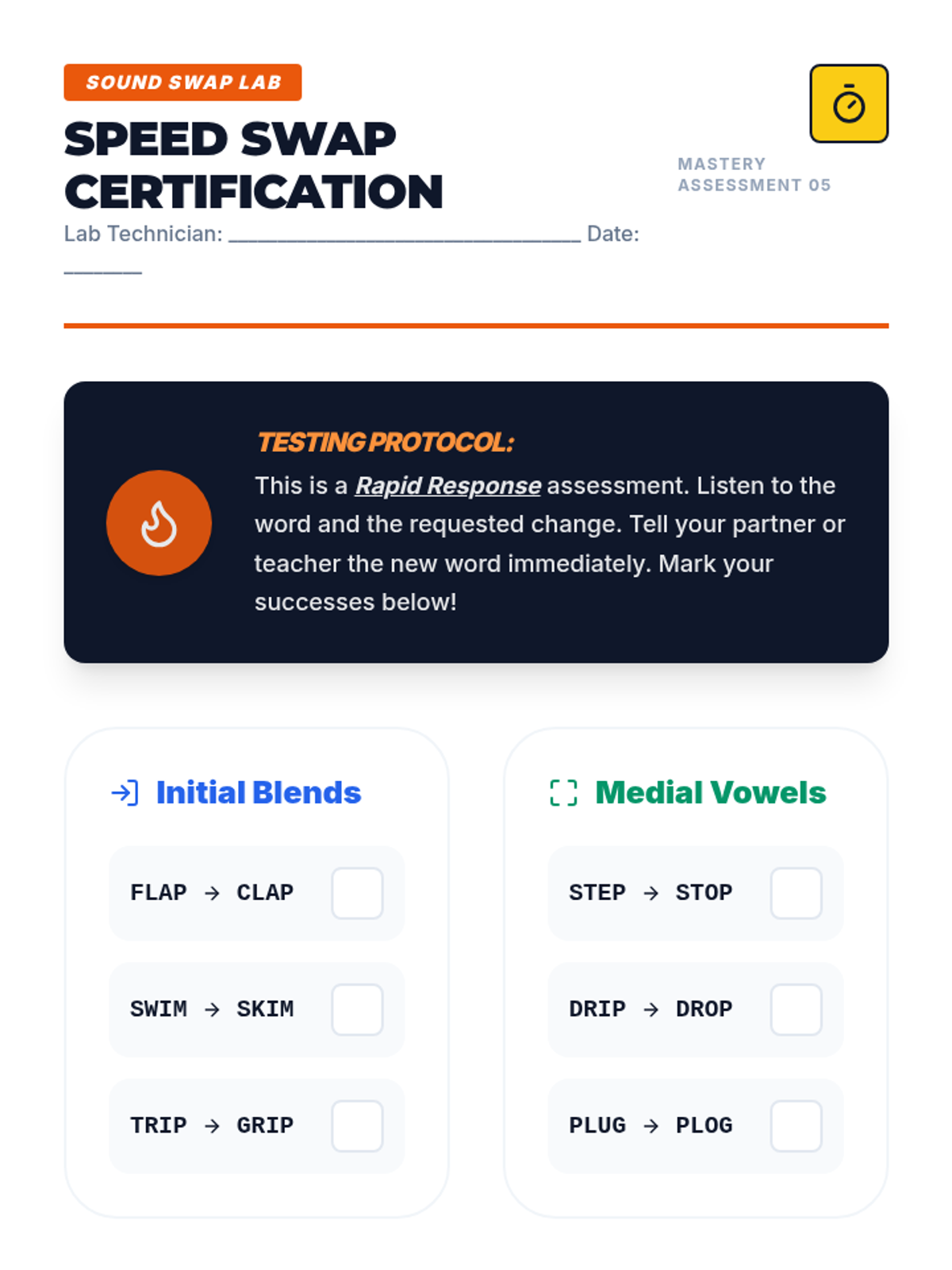 A comprehensive 2nd Grade phonics sequence focusing on substituting phonemes in consonant blends and digraphs. Students progress from initial sound changes to complex three-phoneme blends through interactive lab-themed activities and rapid-fire oral practice.