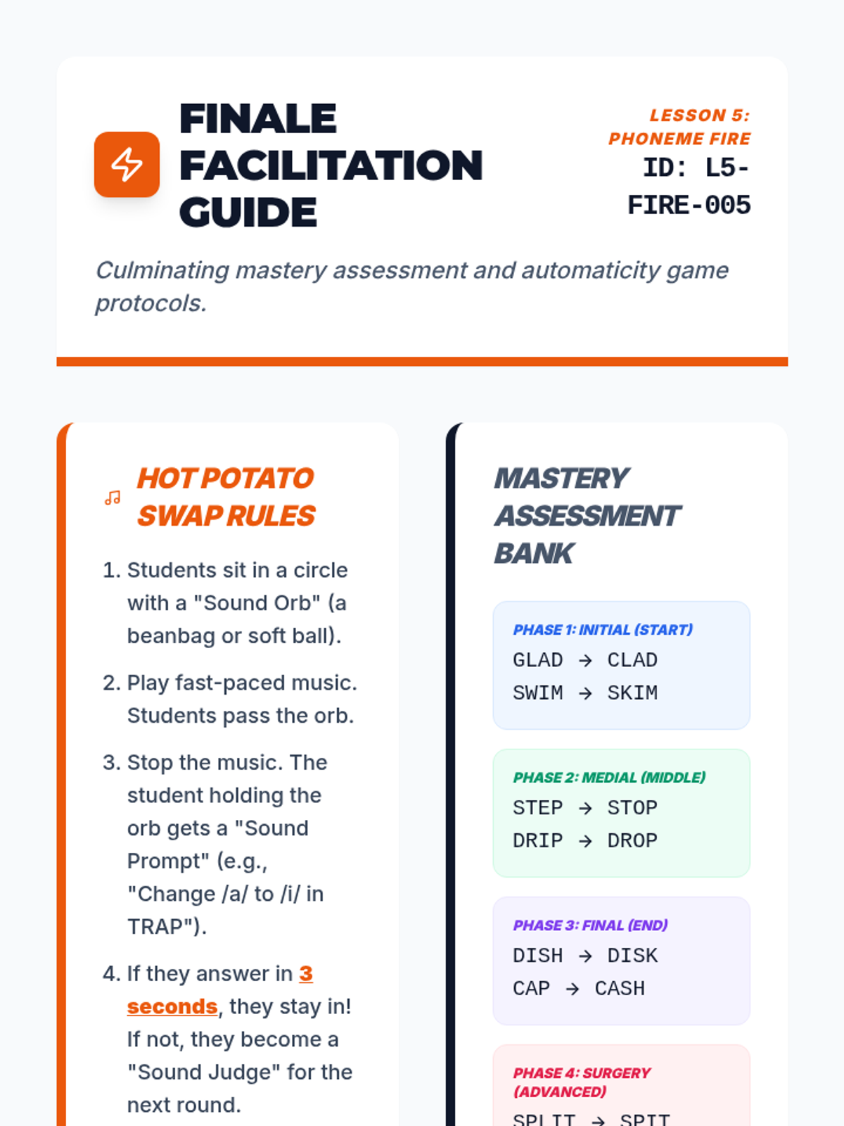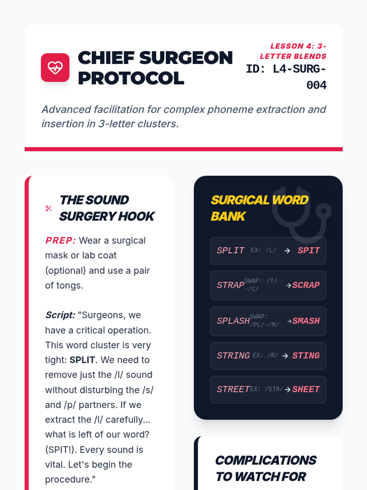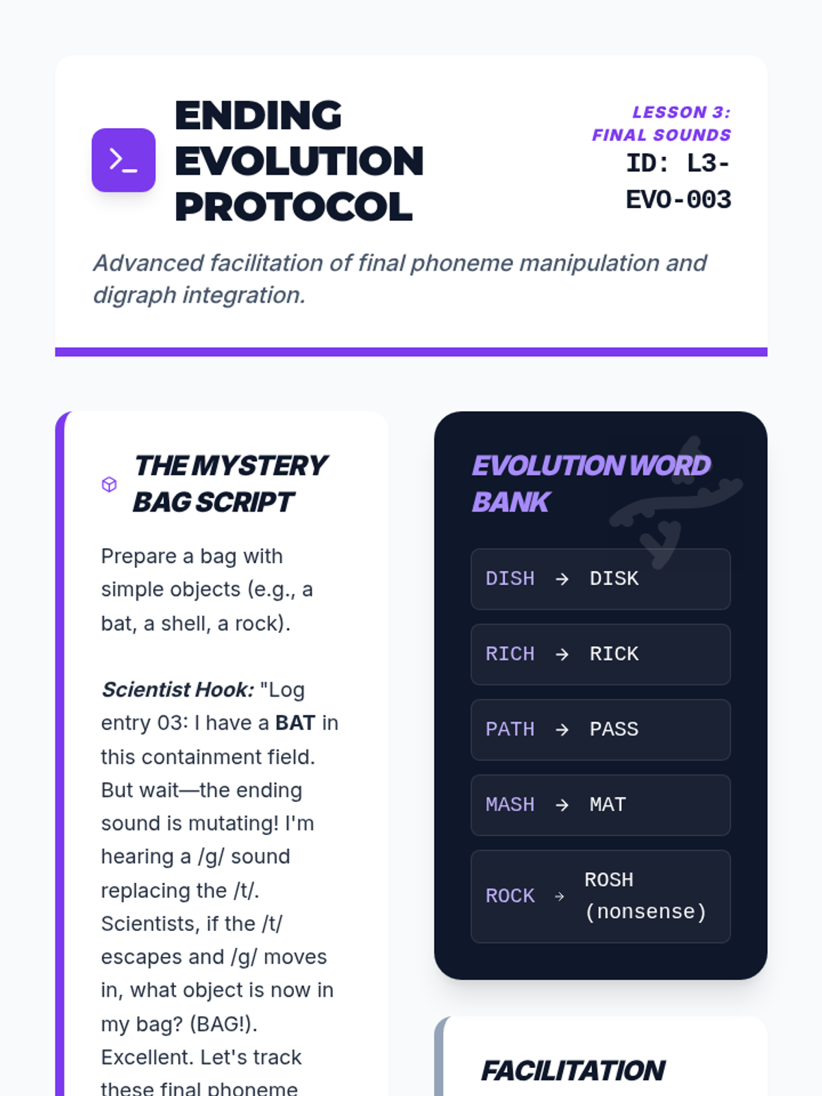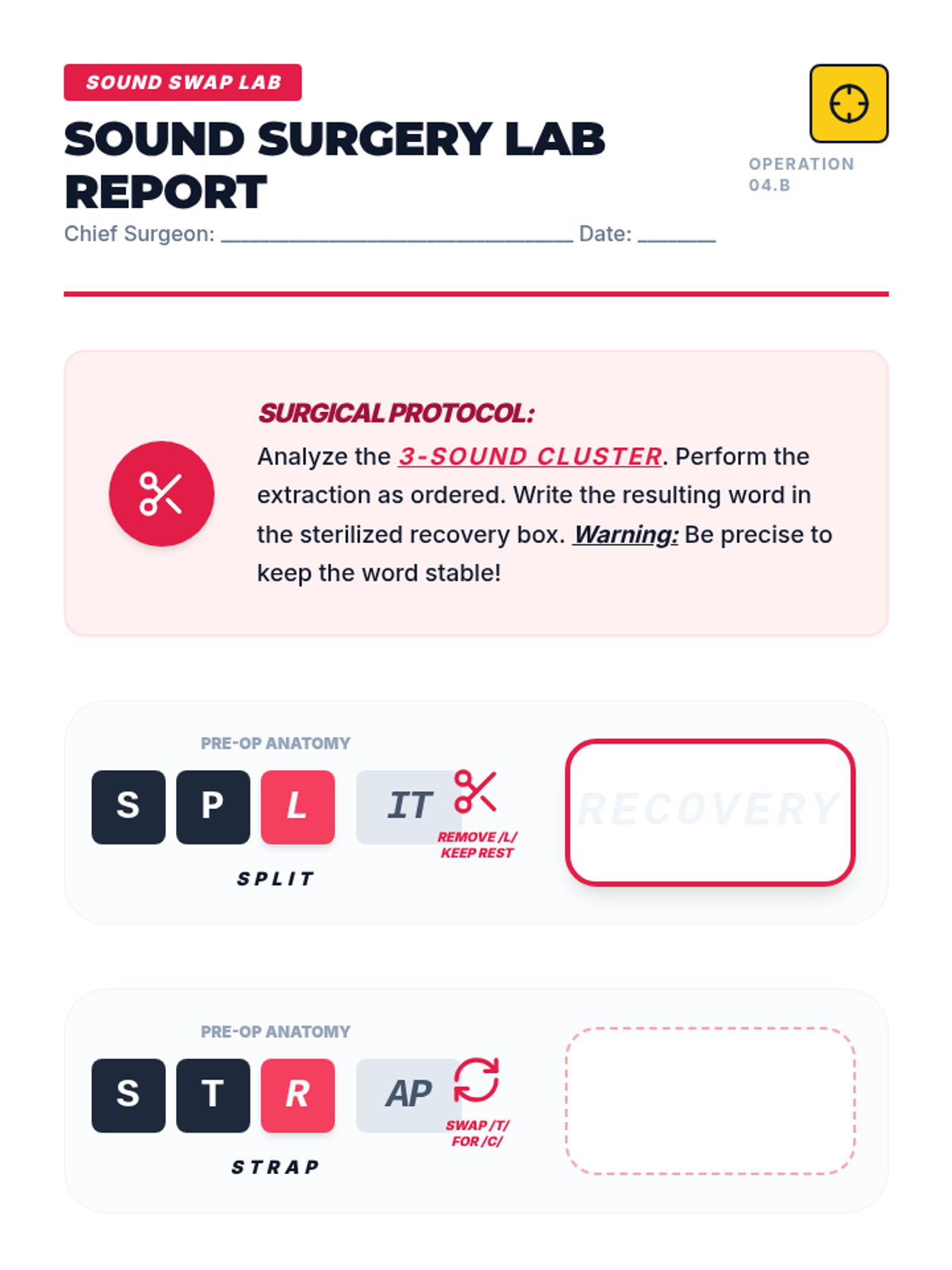 A comprehensive 2nd Grade phonics sequence focusing on substituting phonemes in consonant blends and digraphs. Students progress from initial sound changes to complex three-phoneme blends through interactive lab-themed activities and rapid-fire oral practice.