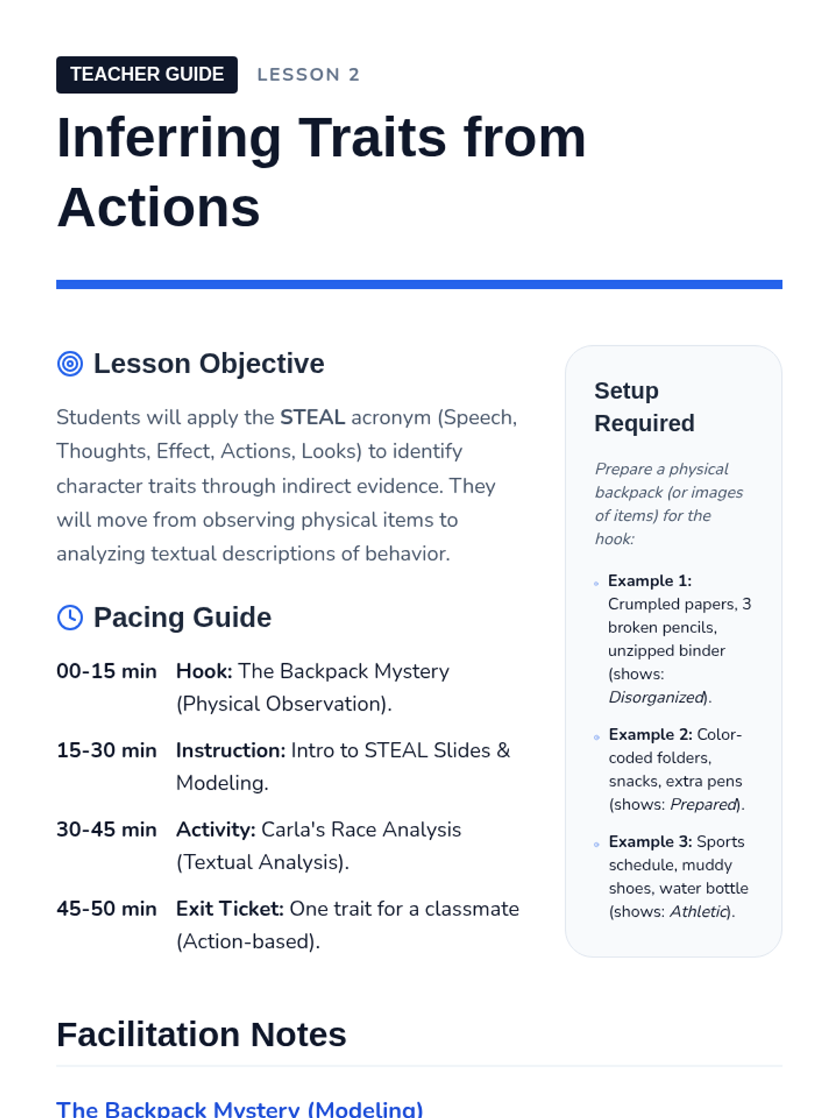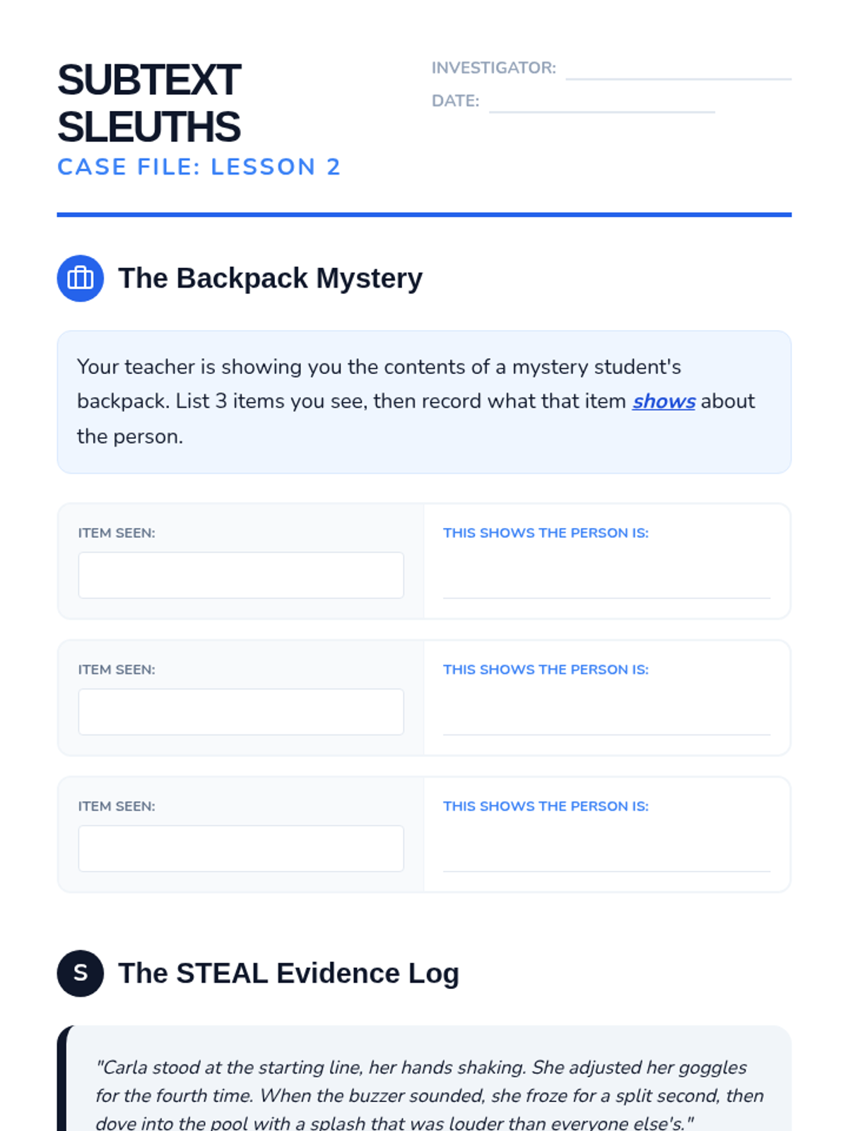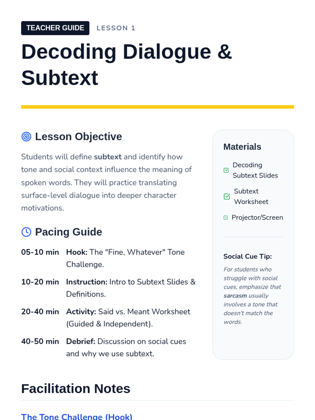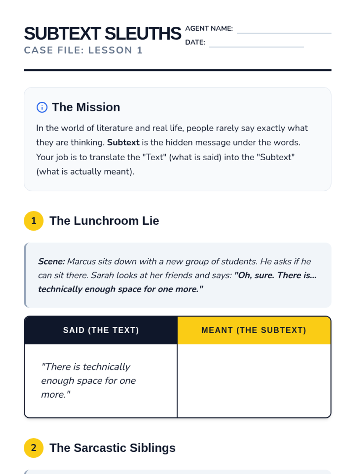 A 5-lesson unit for 9th-grade students focused on inferring character motivations, understanding subtext, and analyzing social dynamics through literature. This sequence is designed to support students in identifying unwritten social cues and predicting behavior based on textual evidence.