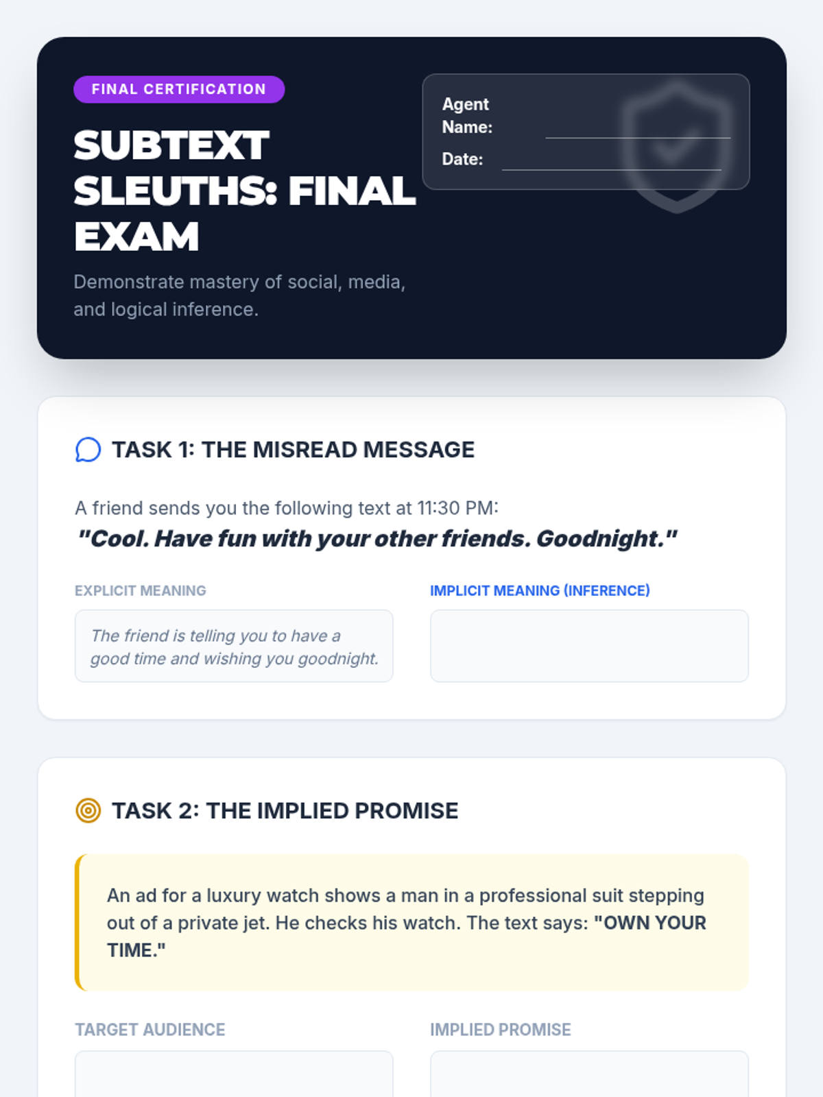 A 10th-grade academic support sequence focused on the social and pragmatic aspects of inference. Students progress from interpreting social subtext in emails and texts to analyzing bias in news and advertisements, culminating in synthesizing implied arguments.