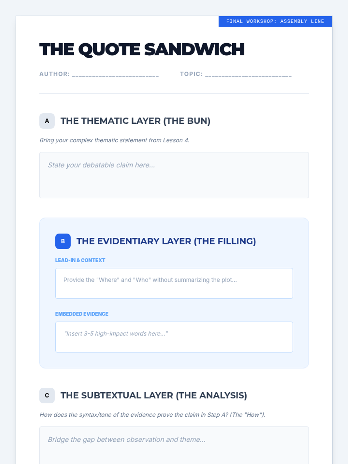An advanced workshop for undergraduate students focusing on the mechanics of close reading, subtextual analysis, and the construction of evidence-based thematic arguments. Students progress from basic inference to analyzing complex narrative voices and synthesizing evidence into scholarly writing.