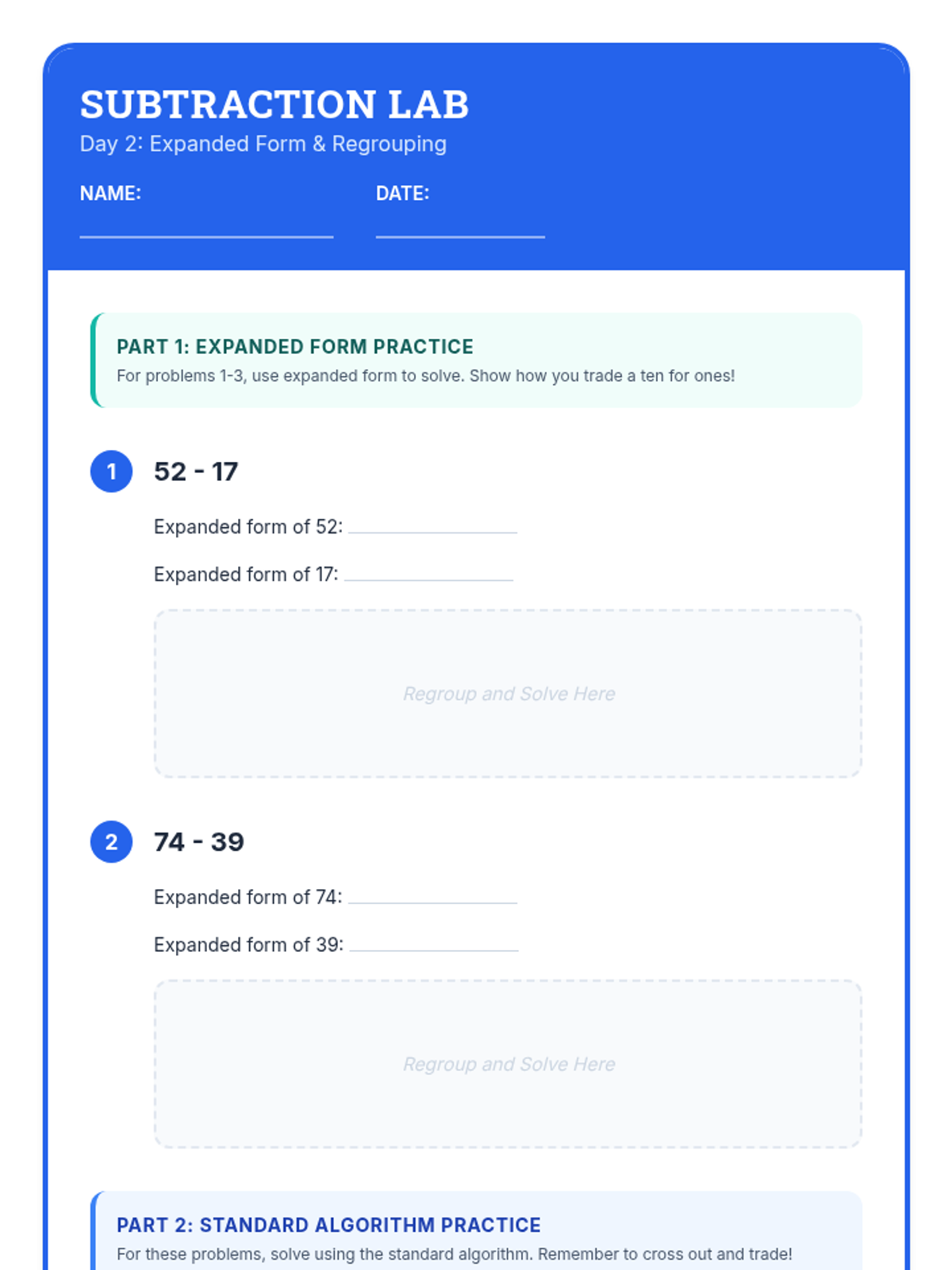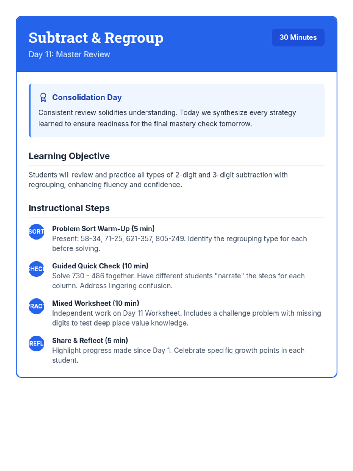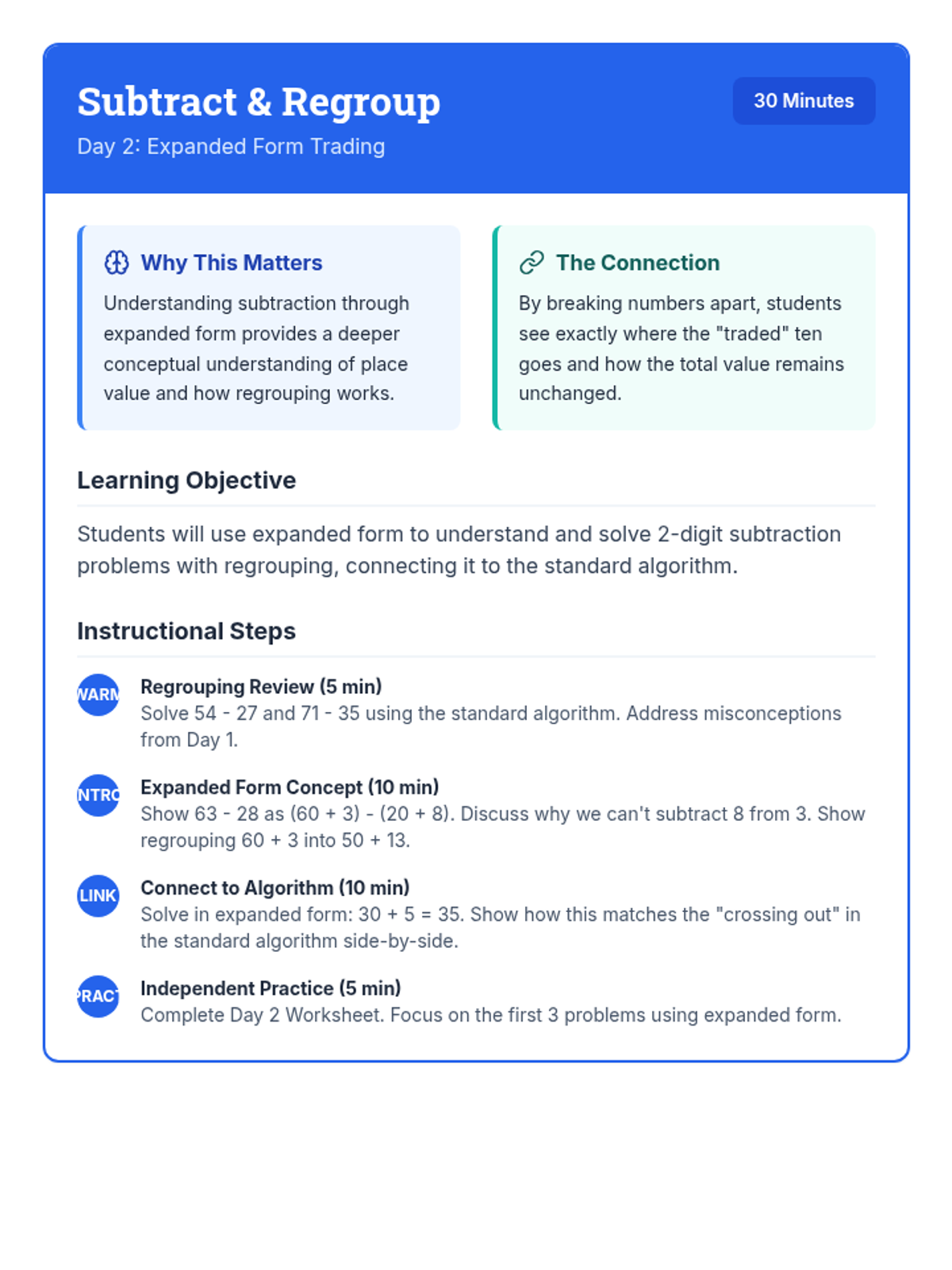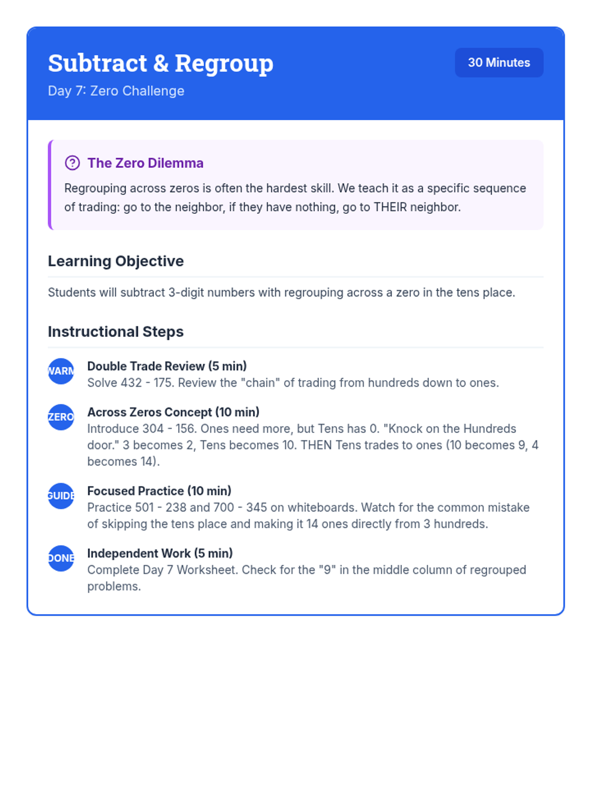 A comprehensive 12-day intervention sequence for 3rd-grade students struggling with subtraction. It covers 2 and 3-digit regrouping using expanded form and the standard algorithm, progressing from simple trades to regrouping across zeros and solving complex word problems.
