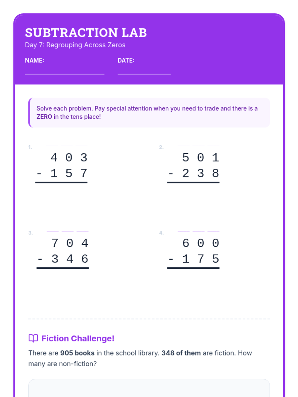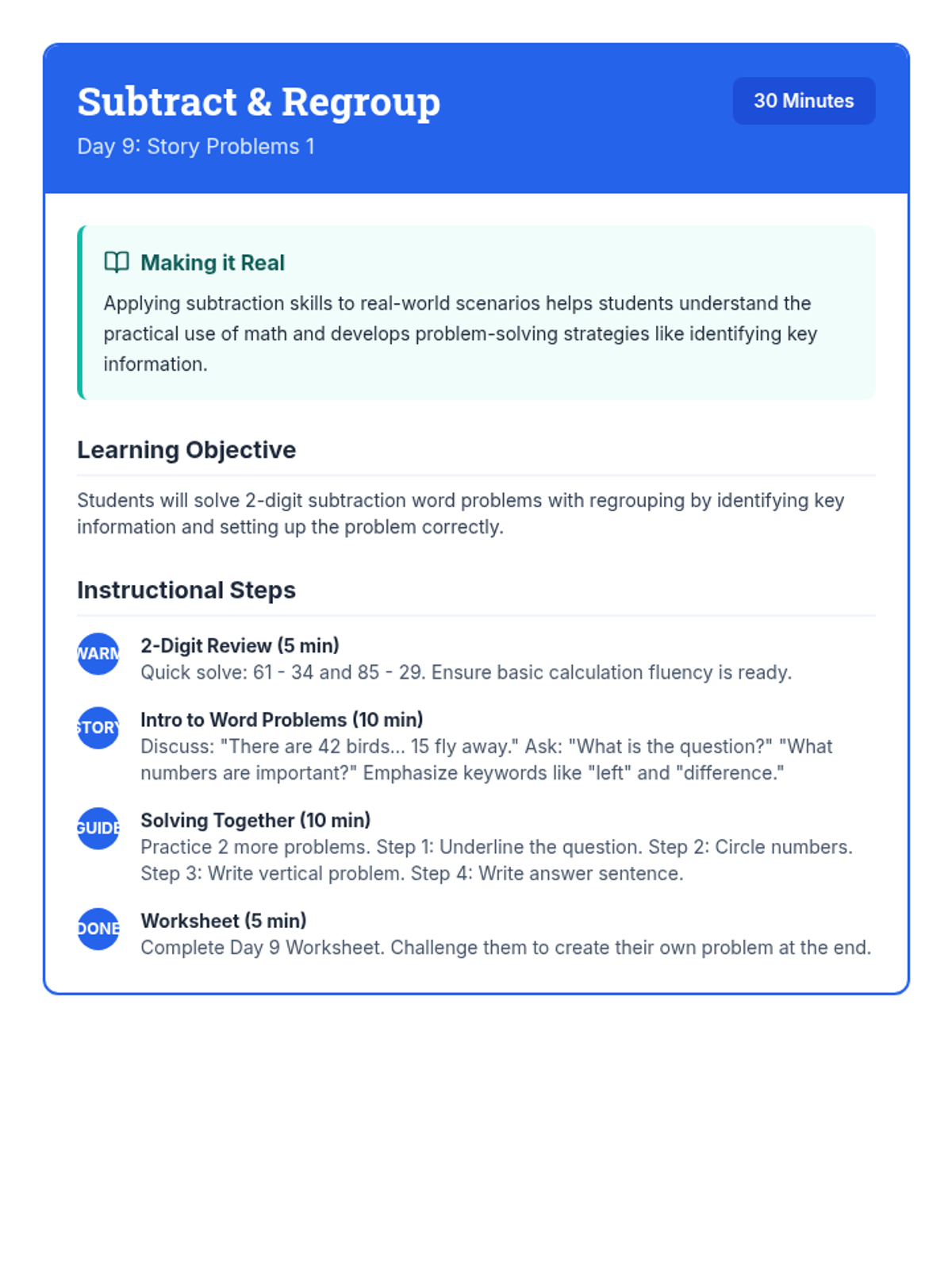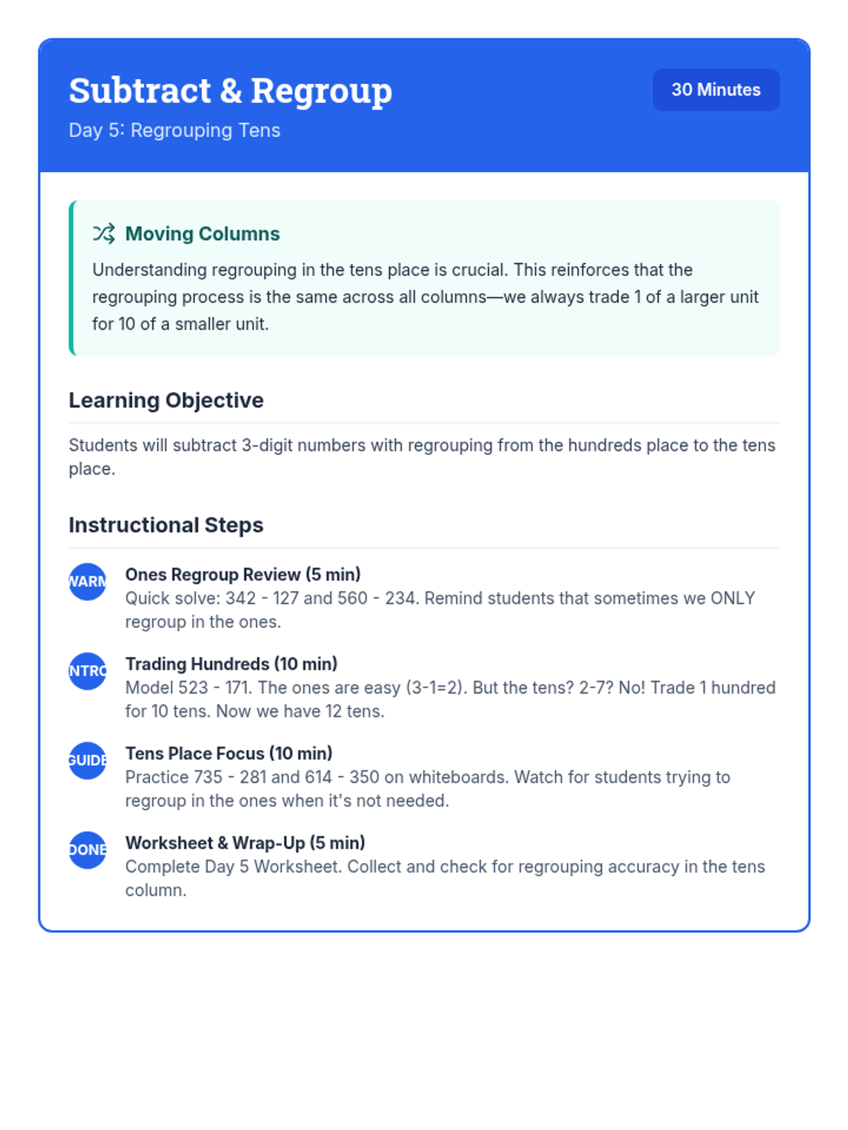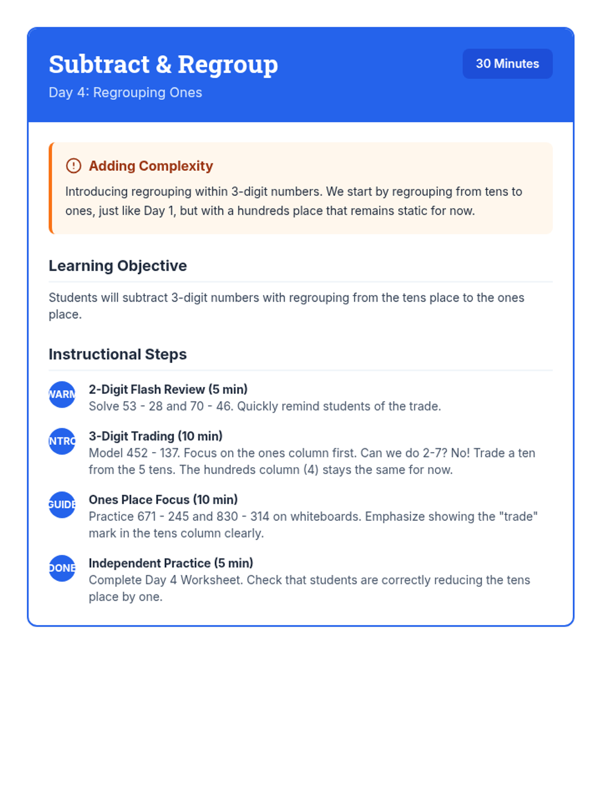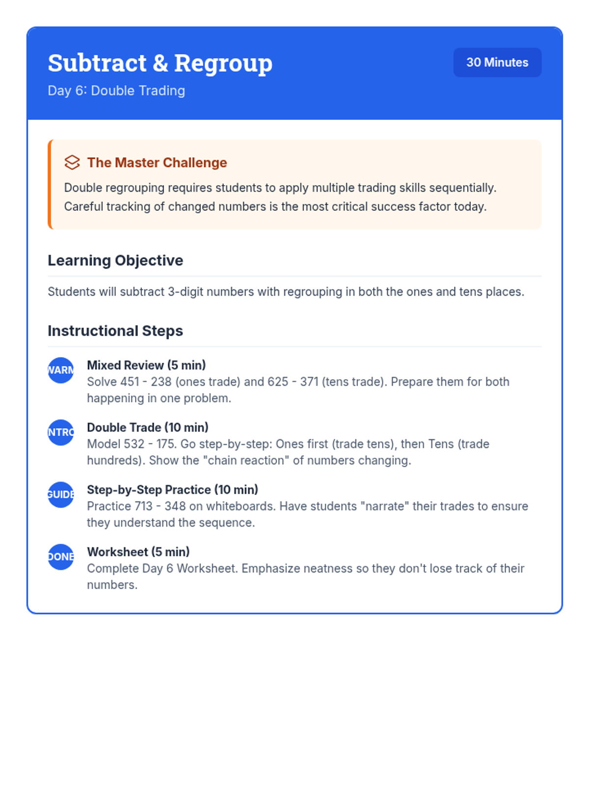 A comprehensive 12-day intervention sequence for 3rd-grade students struggling with subtraction. It covers 2 and 3-digit regrouping using expanded form and the standard algorithm, progressing from simple trades to regrouping across zeros and solving complex word problems.