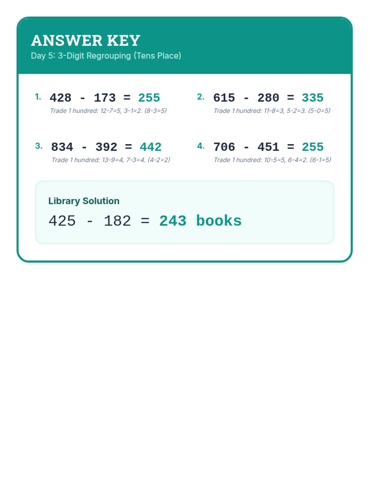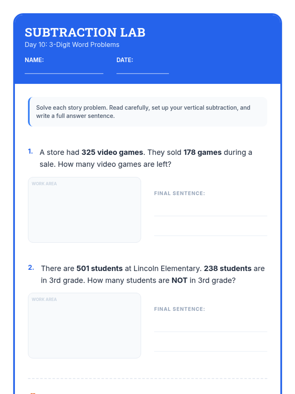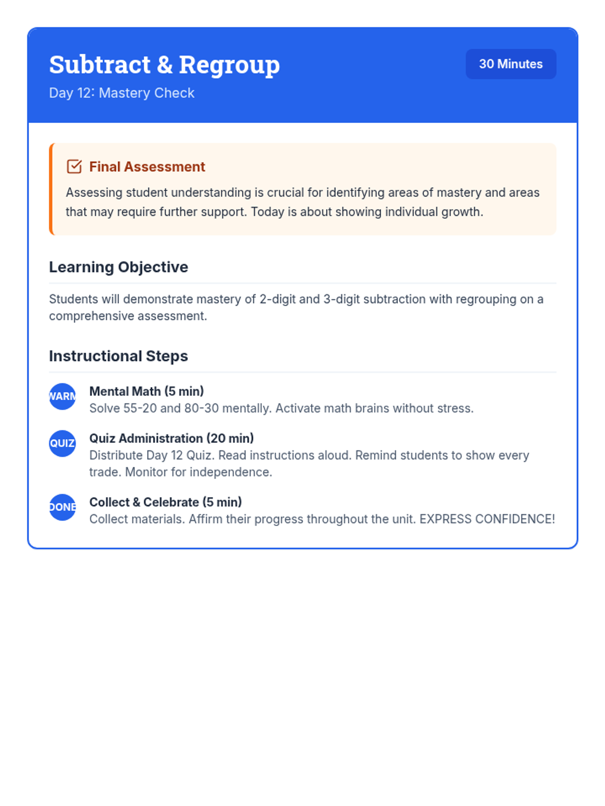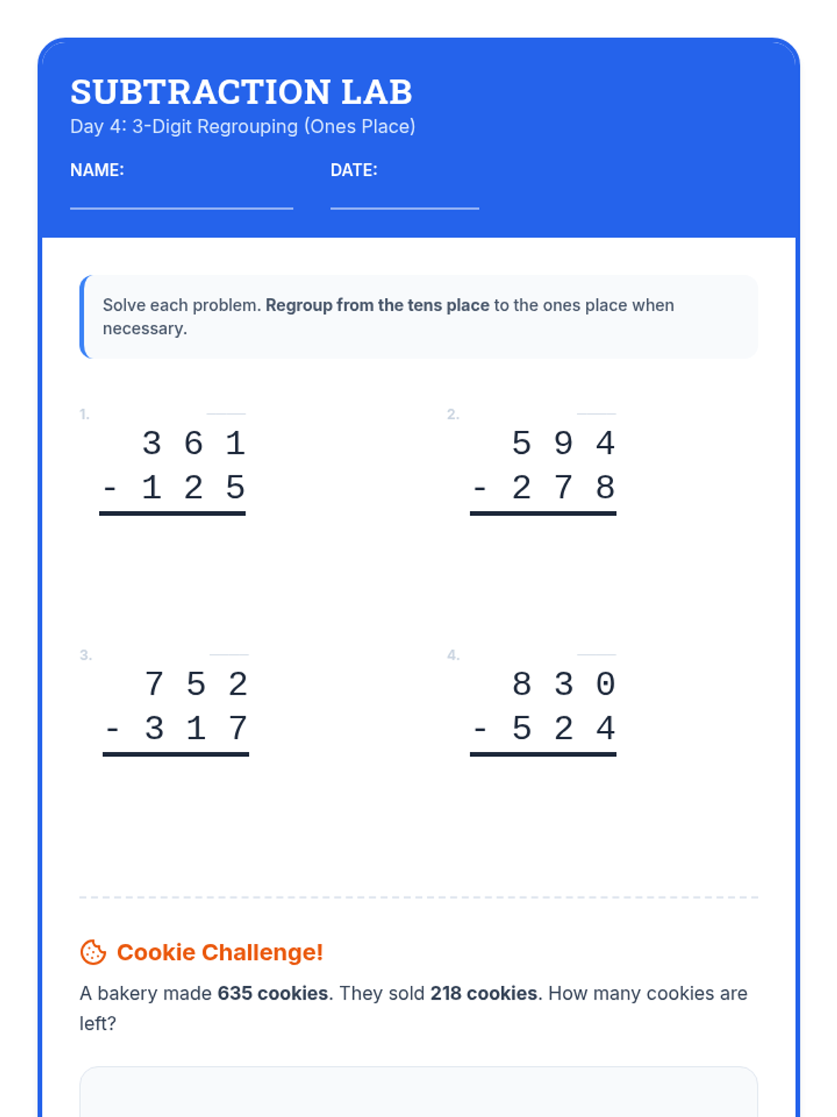 A comprehensive 12-day intervention sequence for 3rd-grade students struggling with subtraction. It covers 2 and 3-digit regrouping using expanded form and the standard algorithm, progressing from simple trades to regrouping across zeros and solving complex word problems.