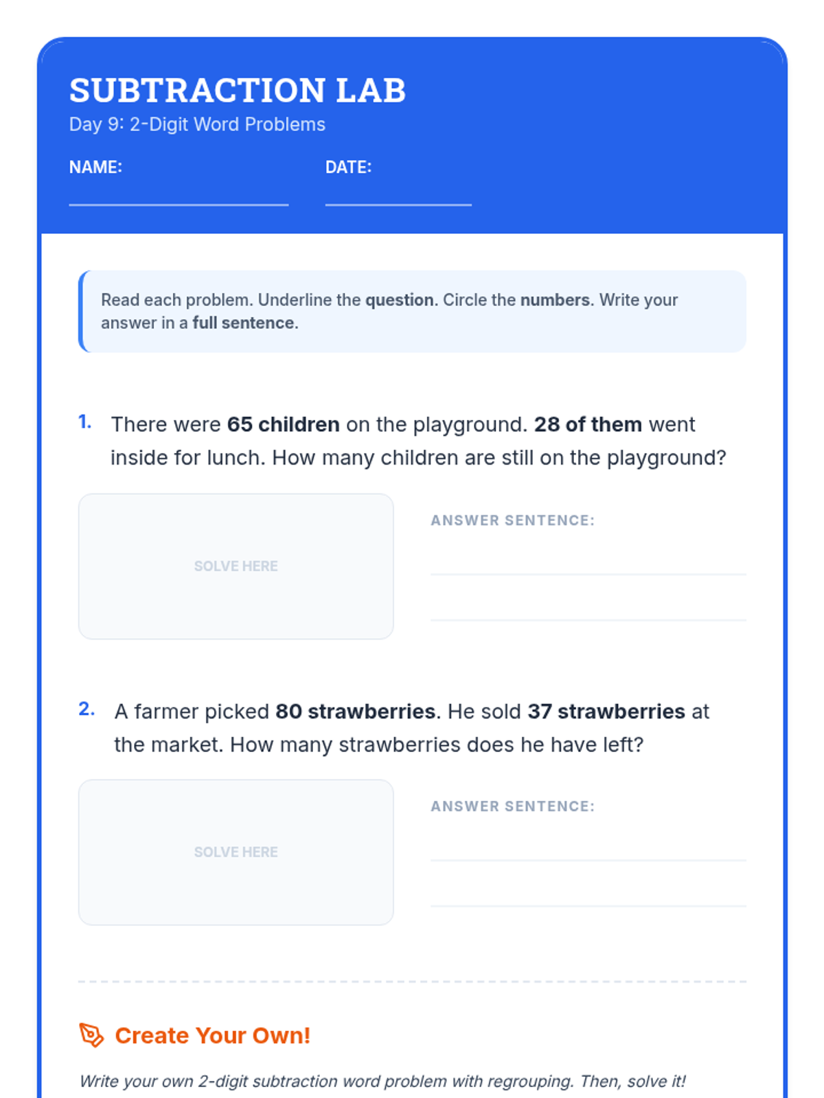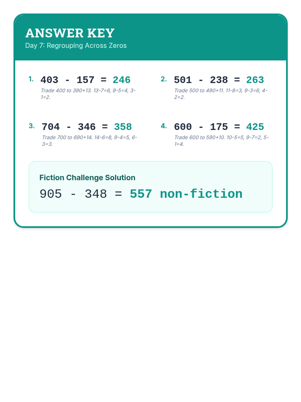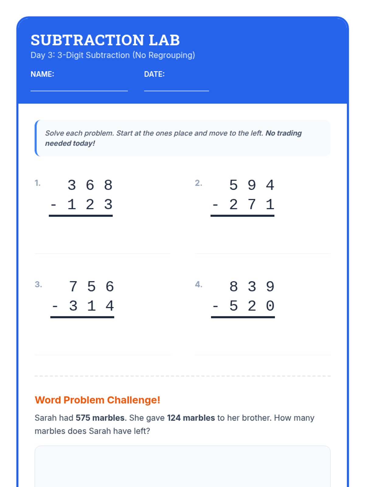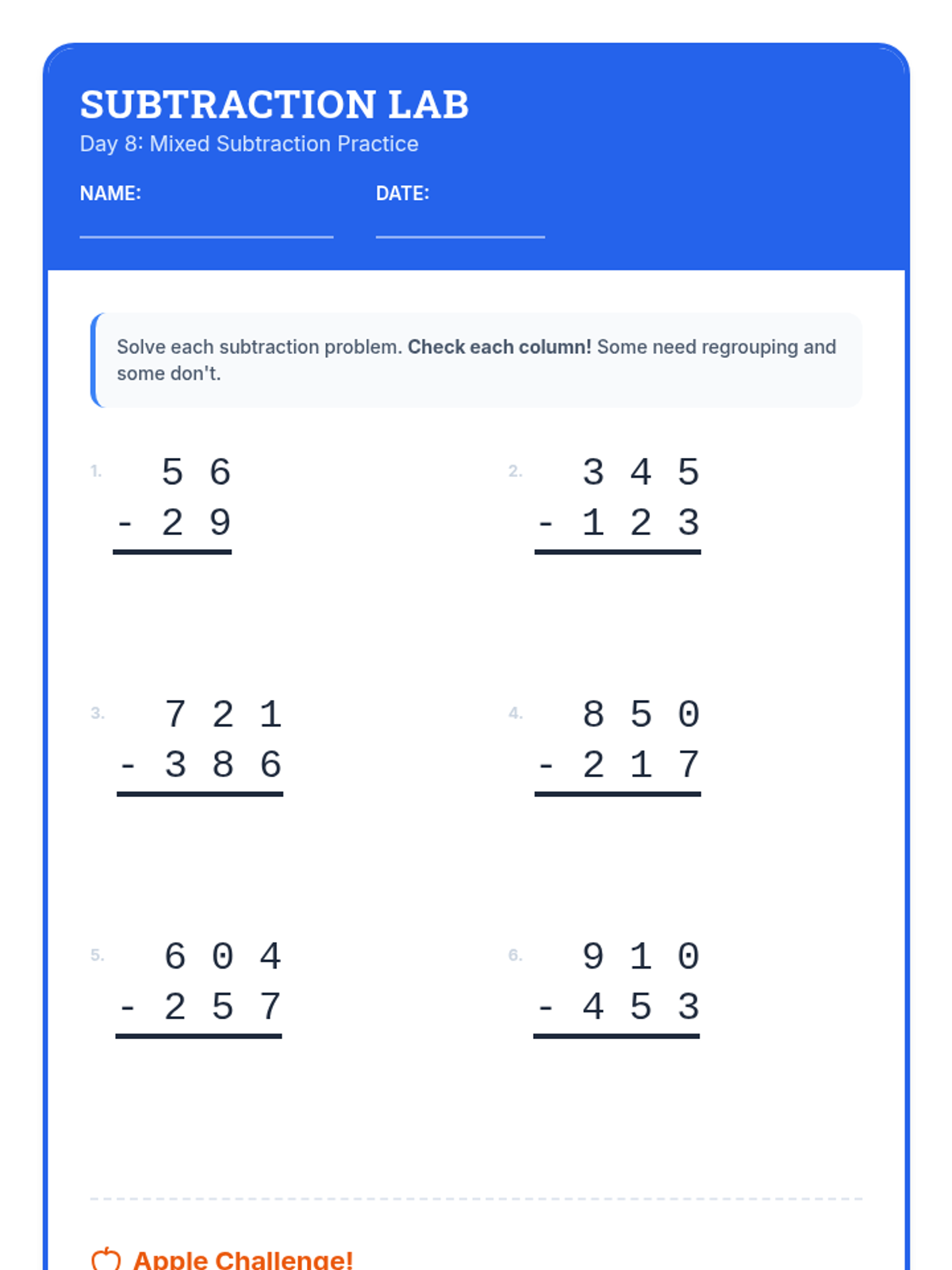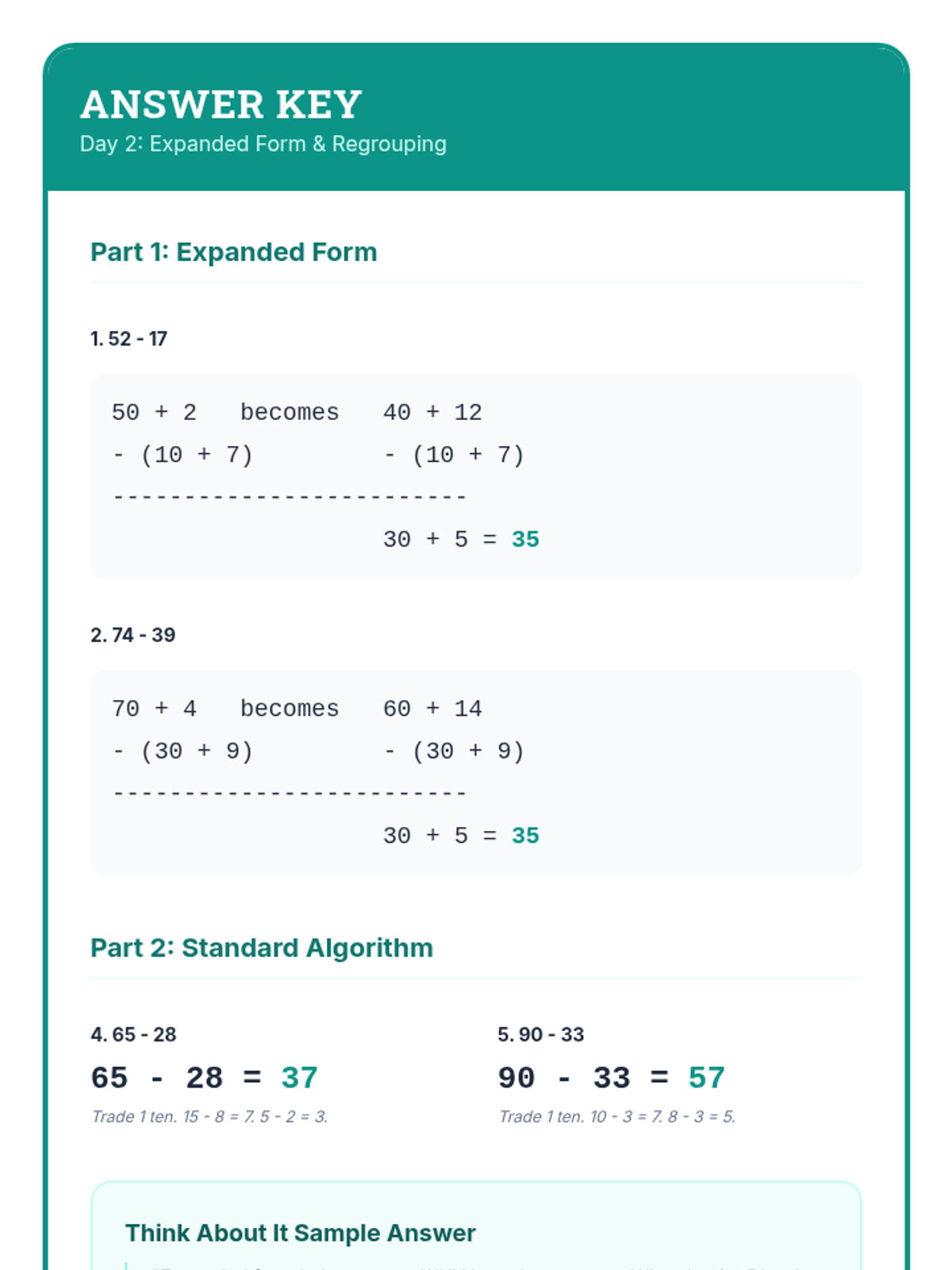 A comprehensive 12-day intervention sequence for 3rd-grade students struggling with subtraction. It covers 2 and 3-digit regrouping using expanded form and the standard algorithm, progressing from simple trades to regrouping across zeros and solving complex word problems.