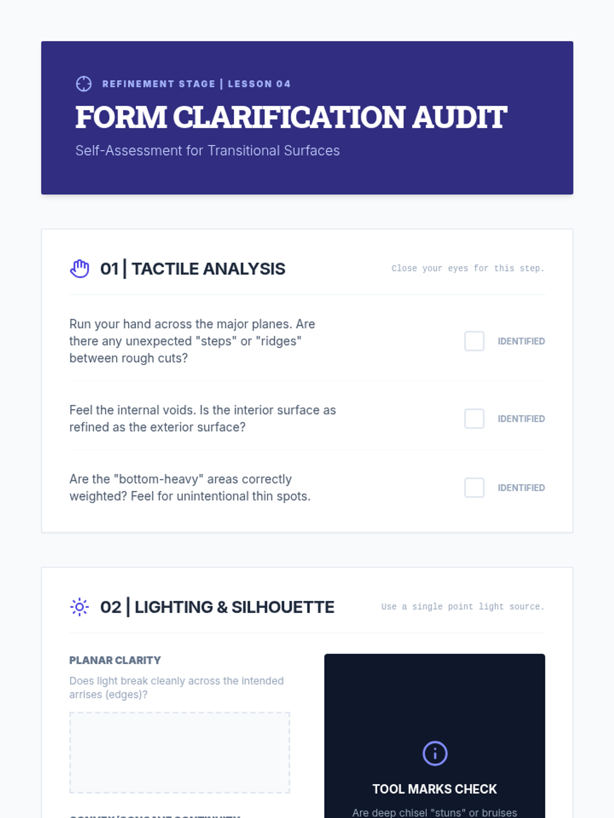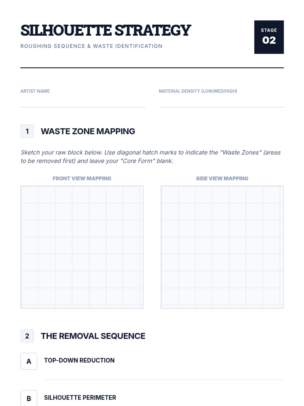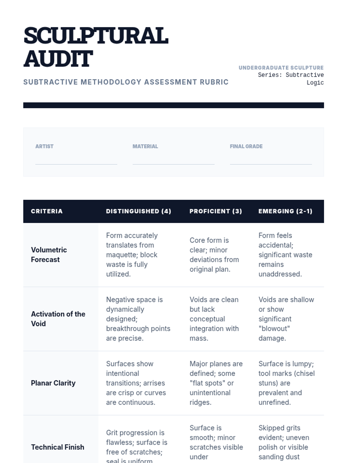 A comprehensive sequence for undergraduate sculpture students focusing on subtractive methodologies. Students learn to navigate the irreversible process of carving, moving from clay maquettes to roughing out forms, activating negative space, and achieving professional surface finishes.