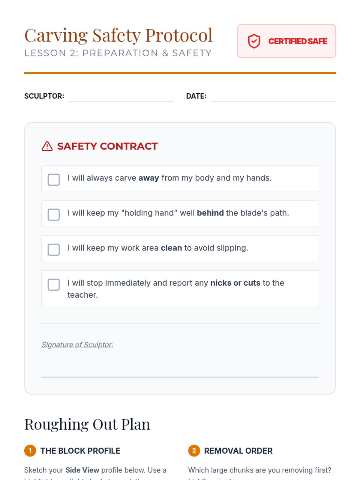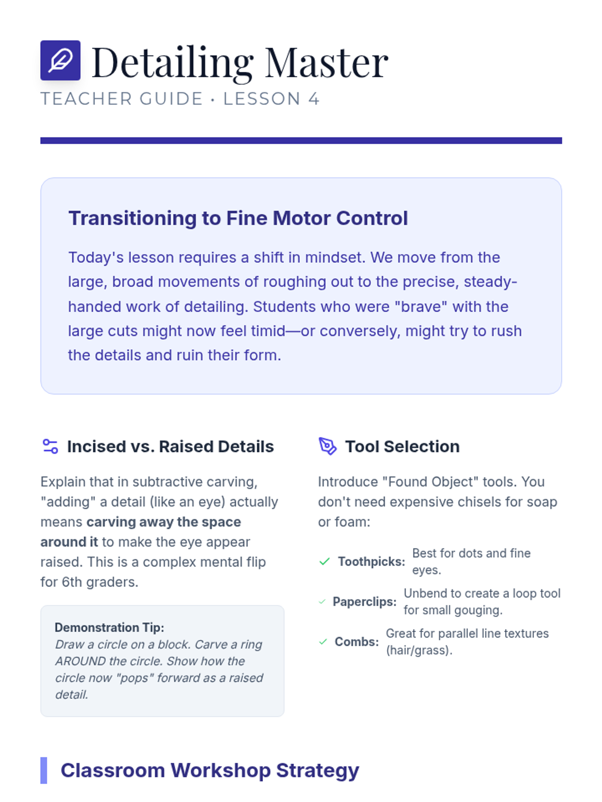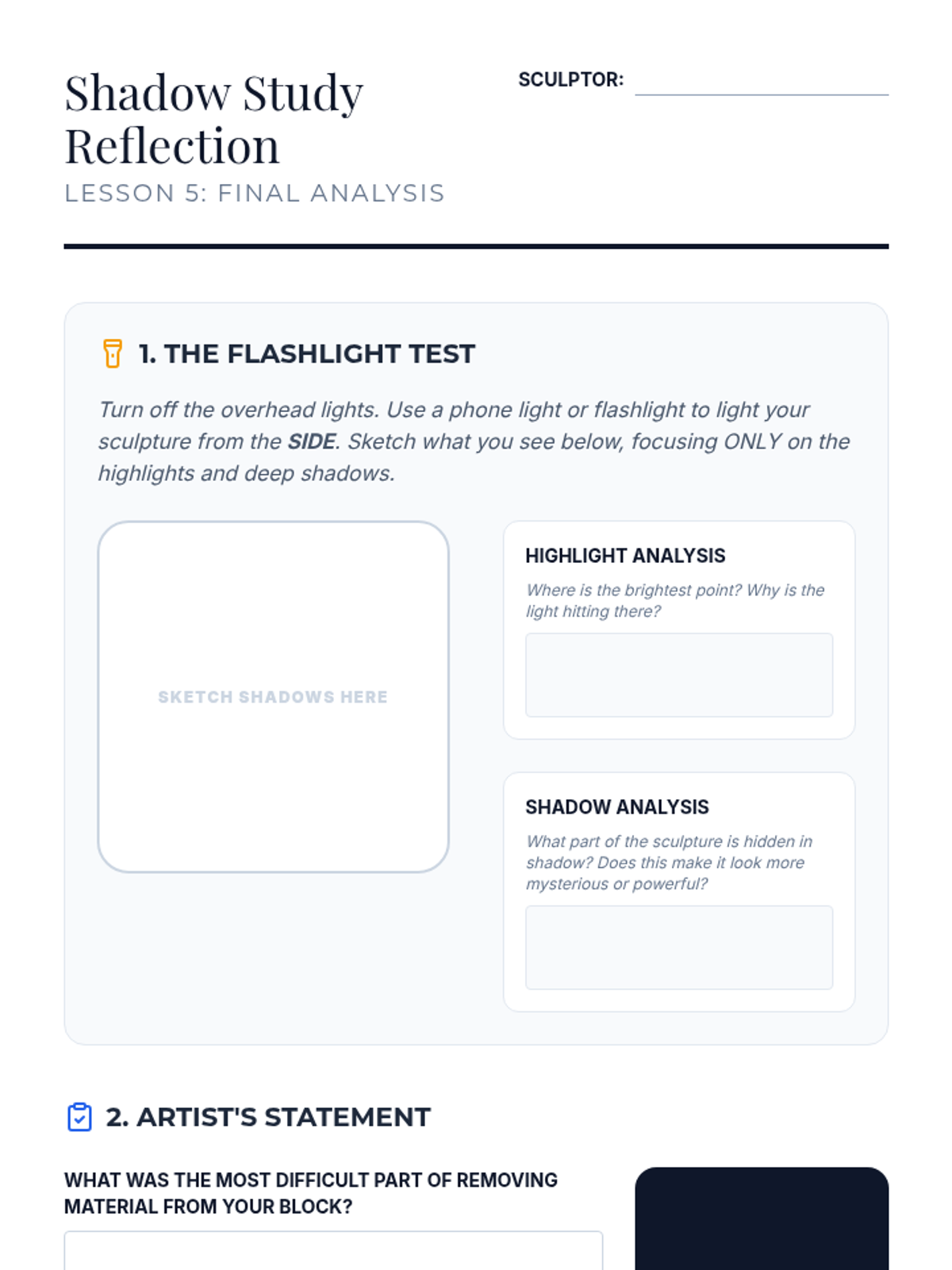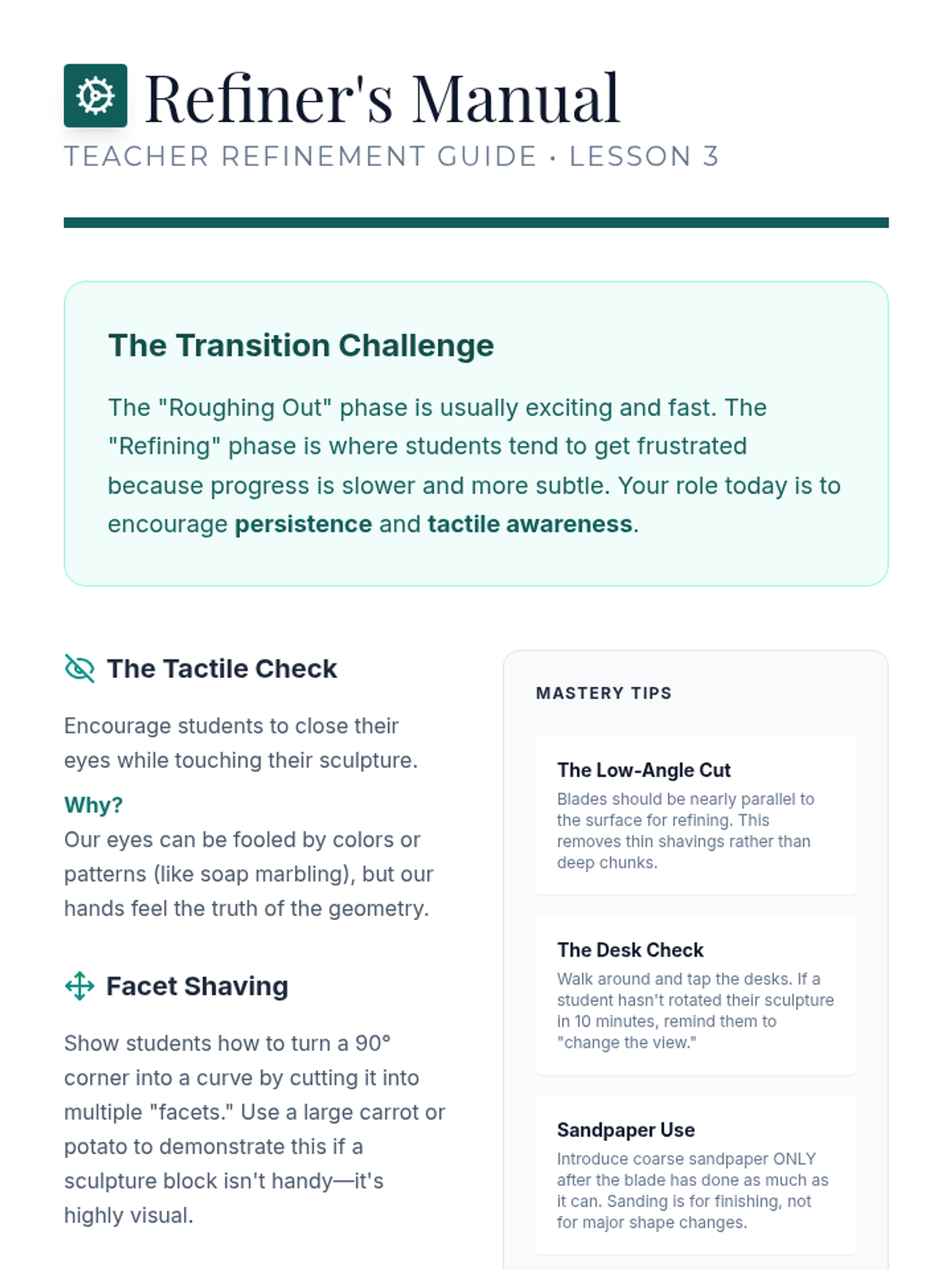 A 5-lesson unit on subtractive sculpting where students learn to 'find the form' within a solid block. They cover visualization, safety, roughing out, refining curves, and final polishing with a focus on negative space and lighting.