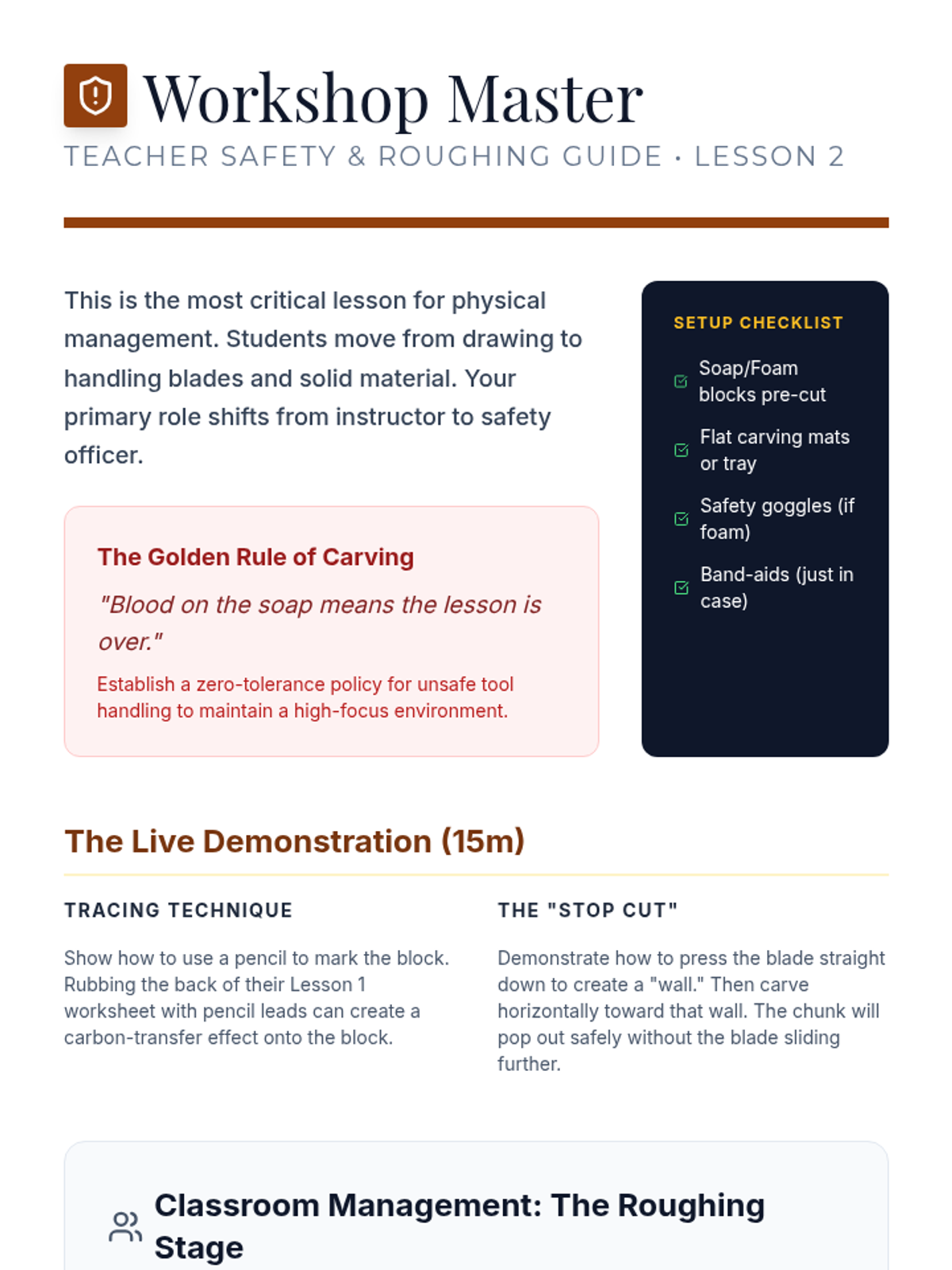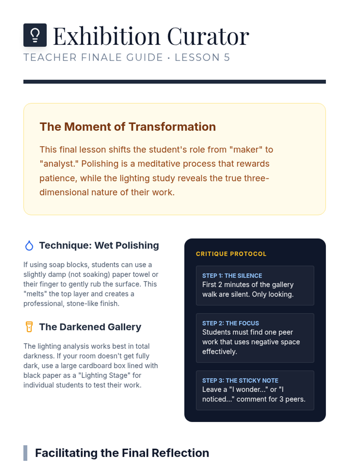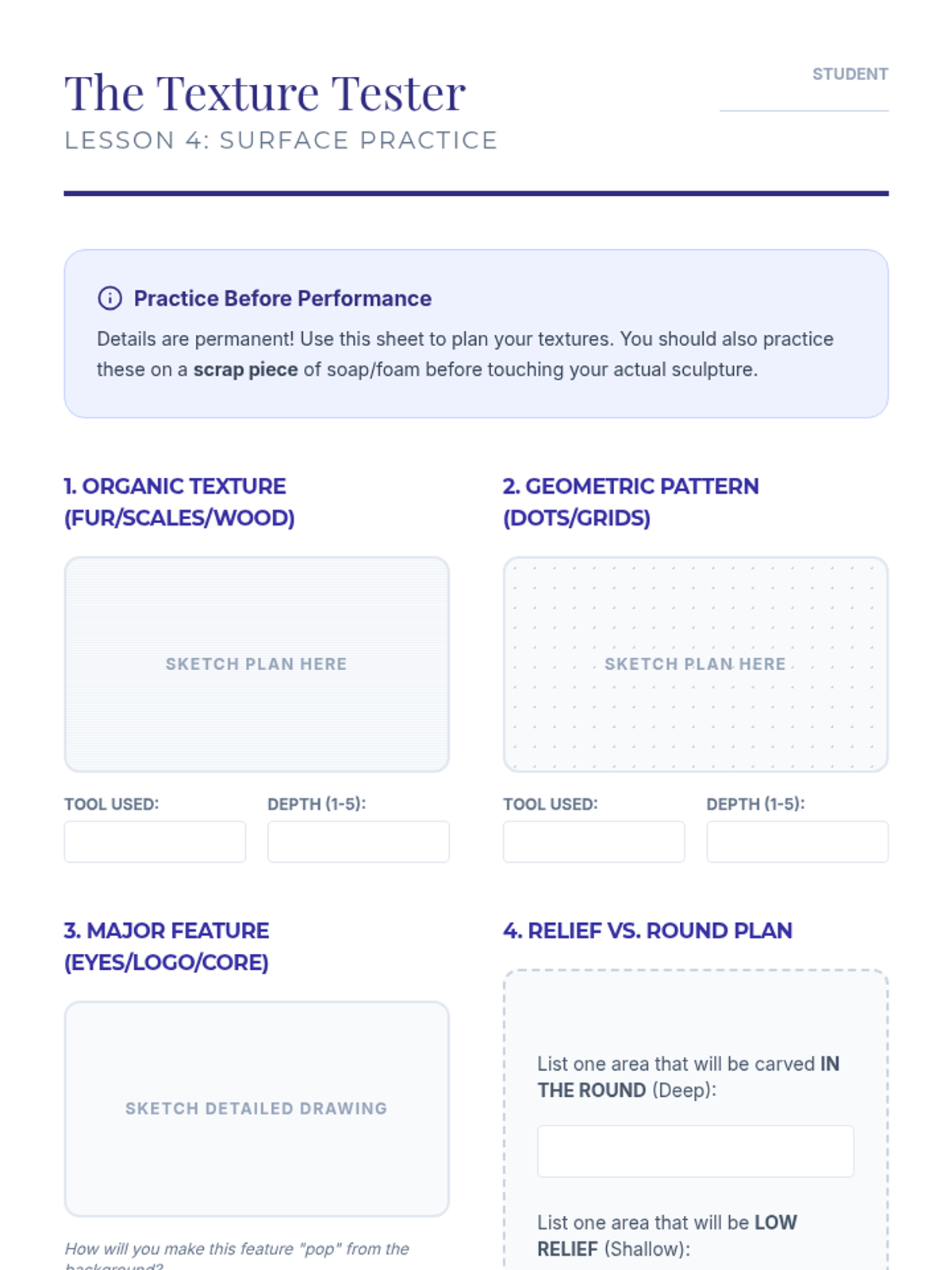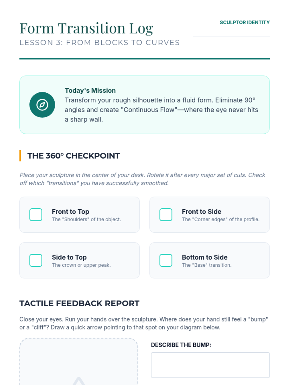 A 5-lesson unit on subtractive sculpting where students learn to 'find the form' within a solid block. They cover visualization, safety, roughing out, refining curves, and final polishing with a focus on negative space and lighting.