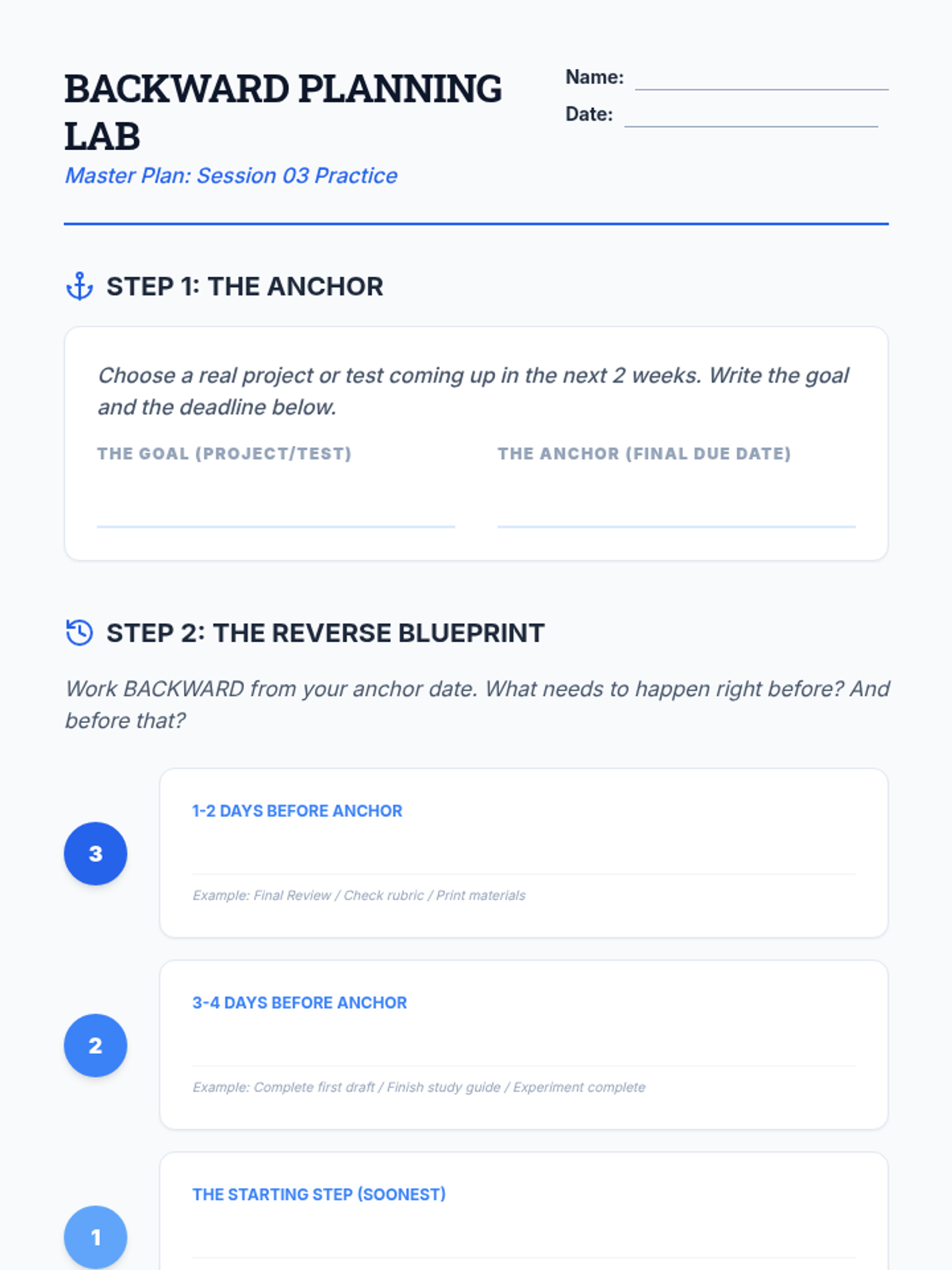 A 4-week small group curriculum for 8th graders focused on identifying study habits, prioritizing schoolwork, and implementing effective organizational systems. The sequence uses a 'Success Blueprint' theme to engage students in 'designing' their academic life.