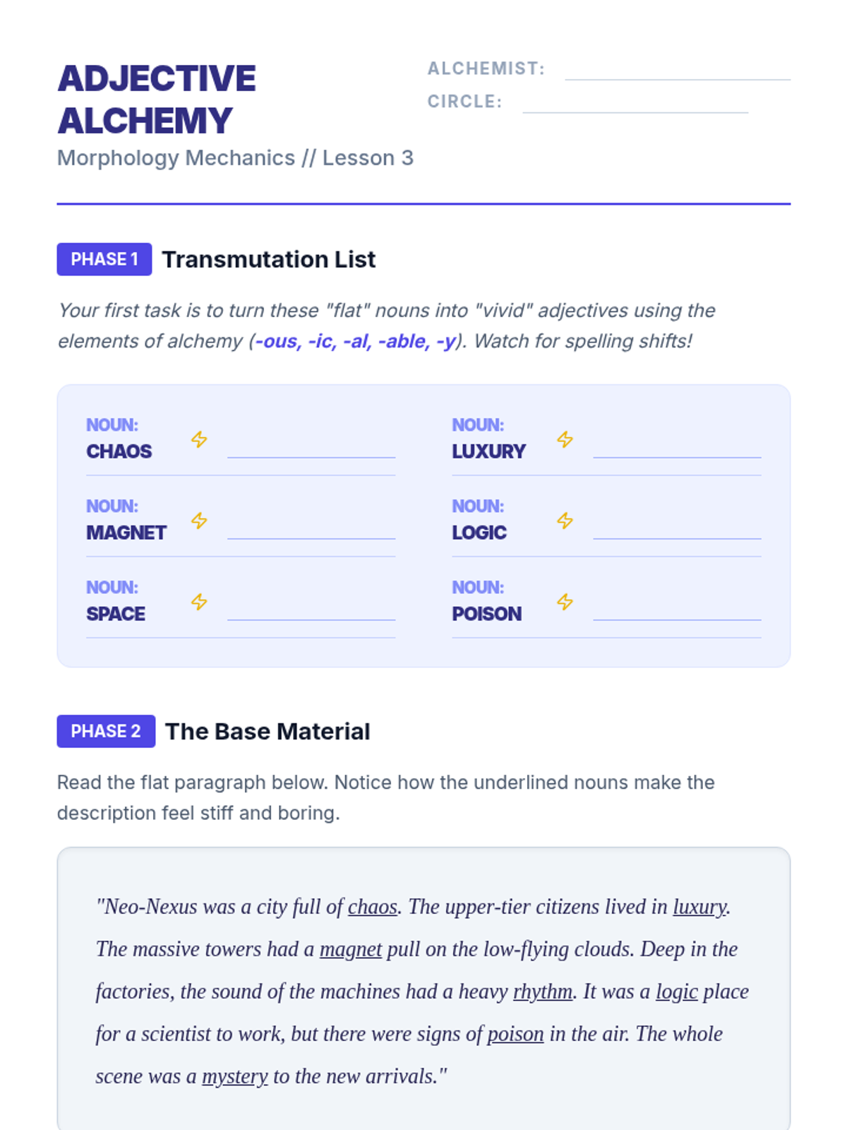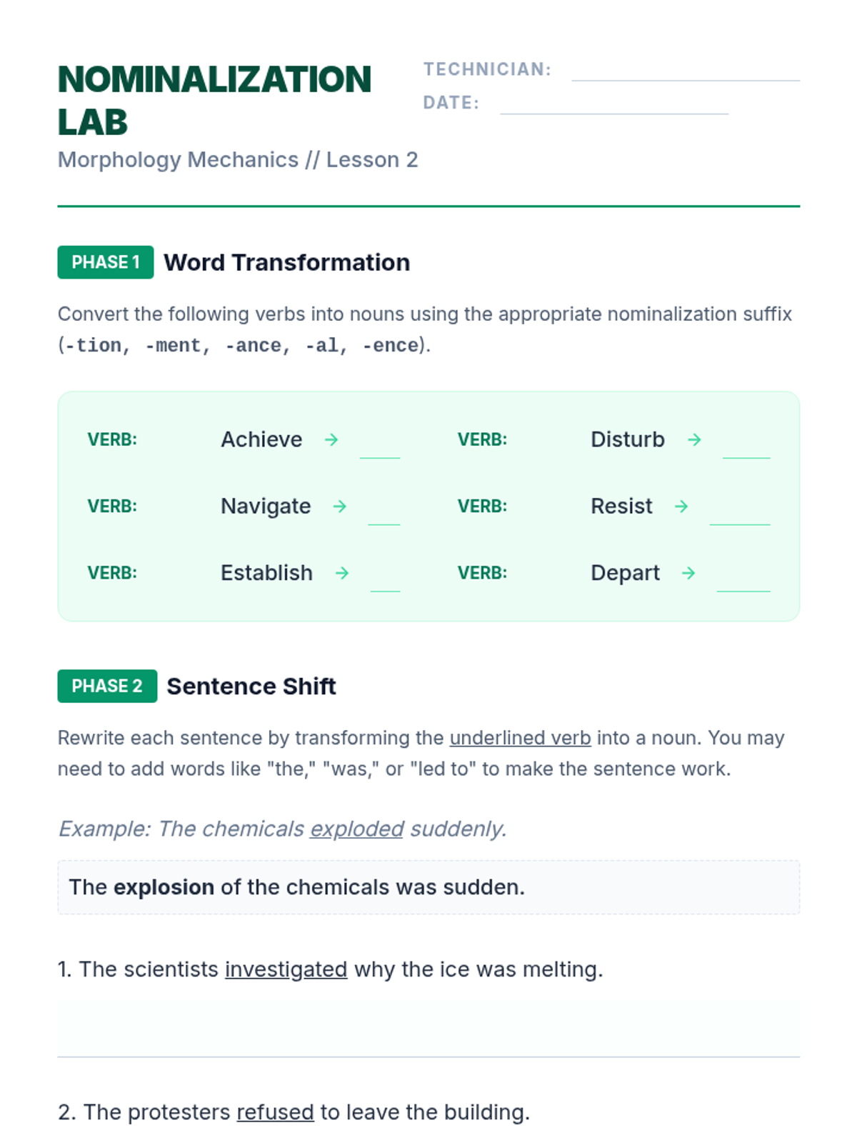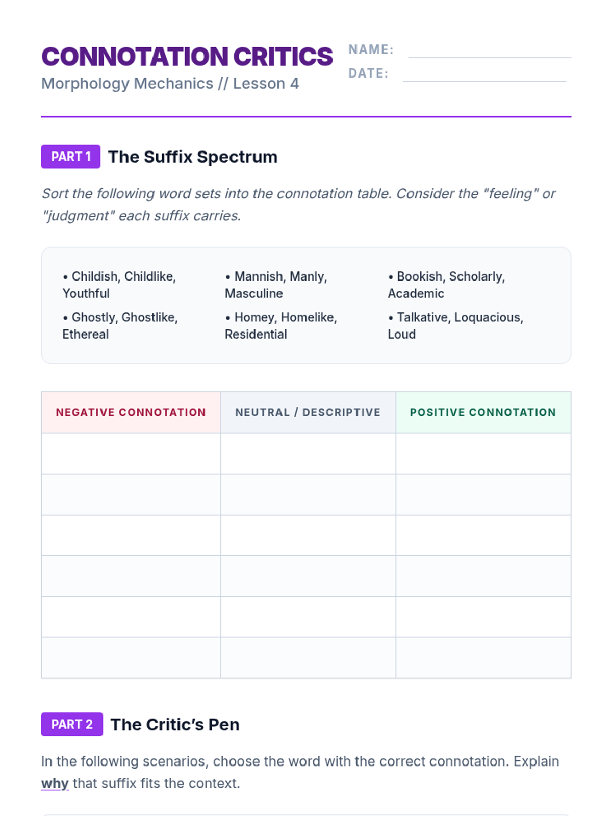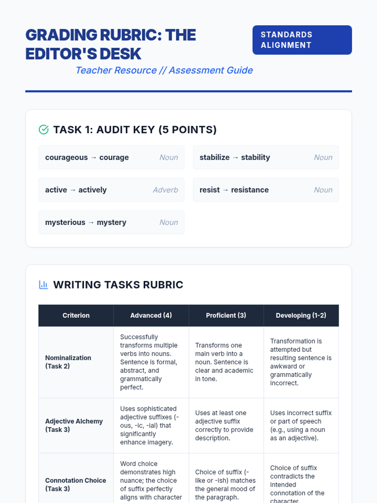 A comprehensive 8th-grade sequence exploring how suffixes transform words across parts of speech, focusing on nominalization, adjectival shifts, and connotative nuances. Students learn to manipulate word forms to improve sentence variety and precision in their writing.