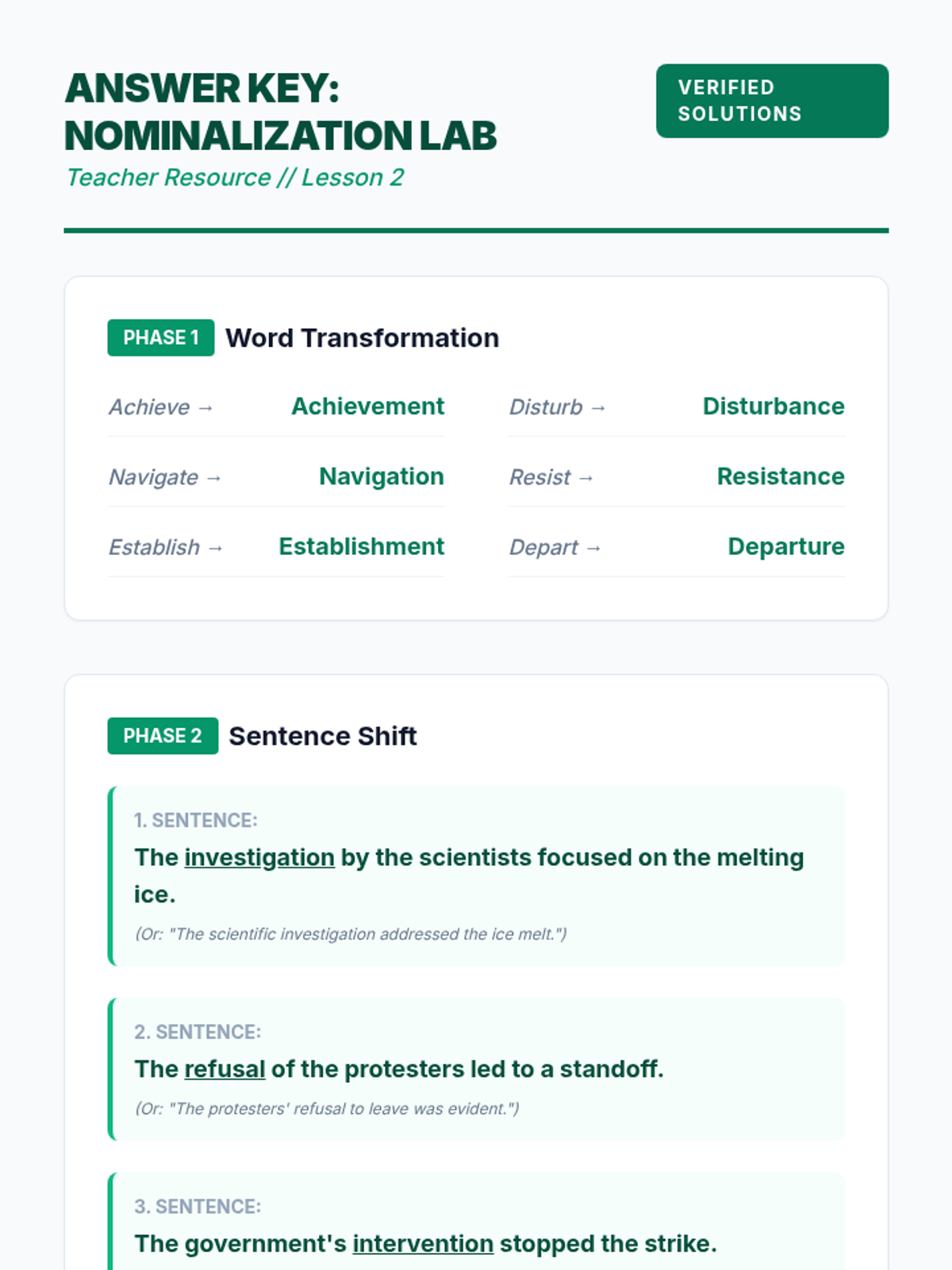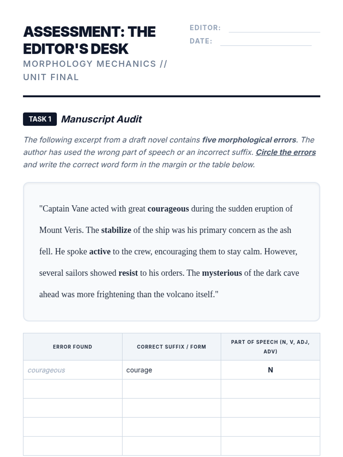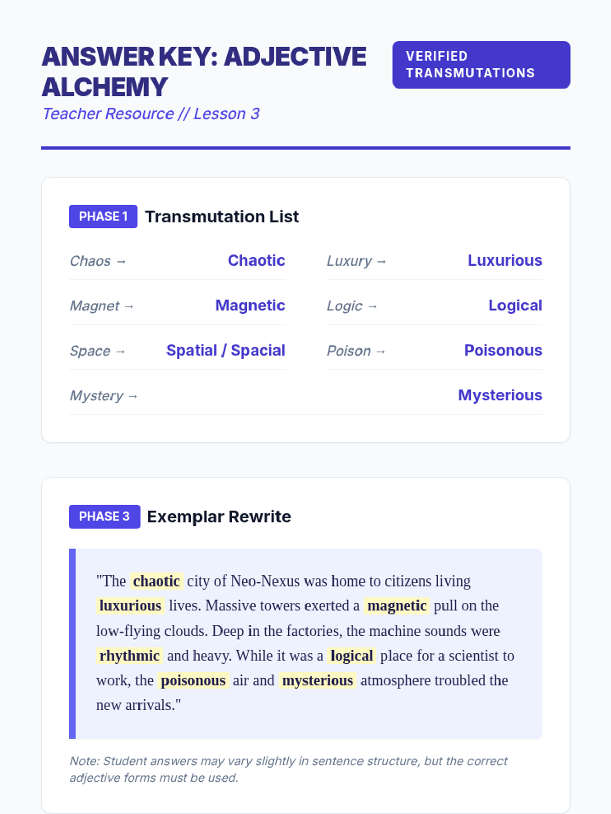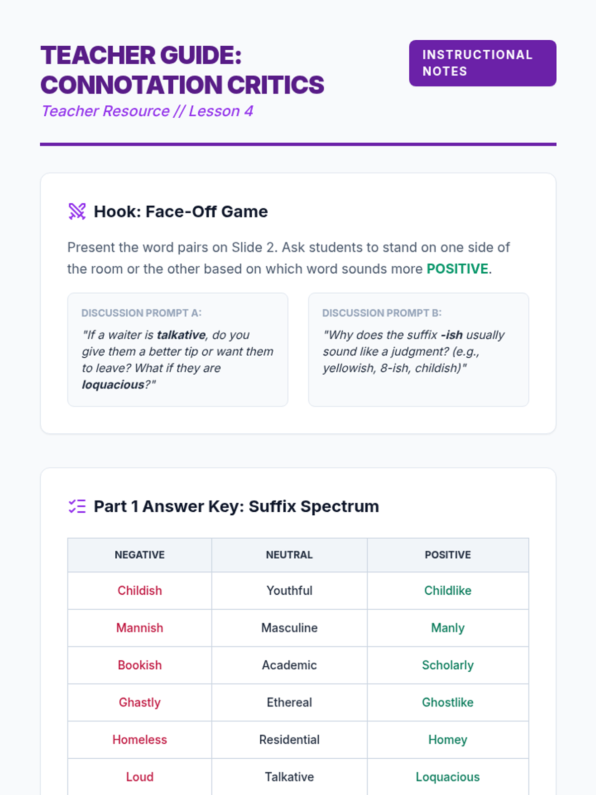 A comprehensive 8th-grade sequence exploring how suffixes transform words across parts of speech, focusing on nominalization, adjectival shifts, and connotative nuances. Students learn to manipulate word forms to improve sentence variety and precision in their writing.