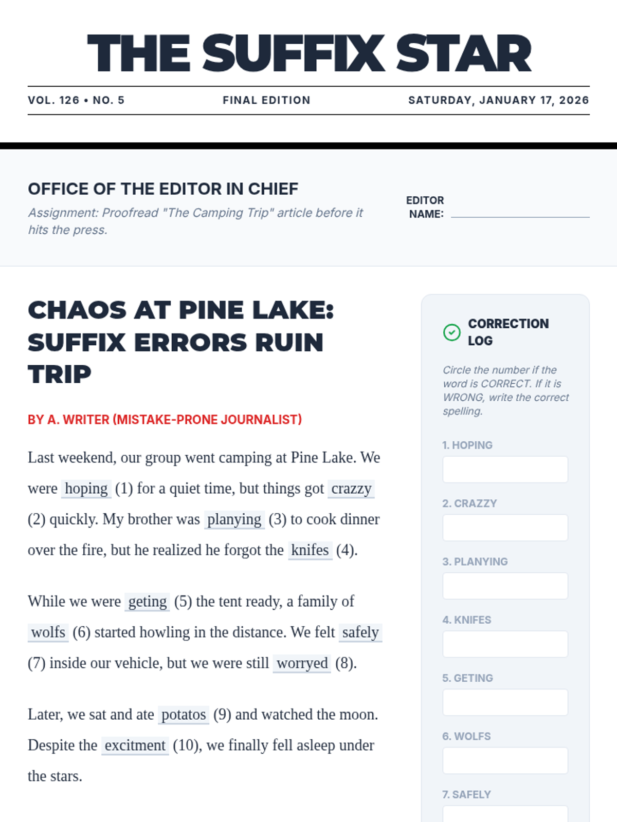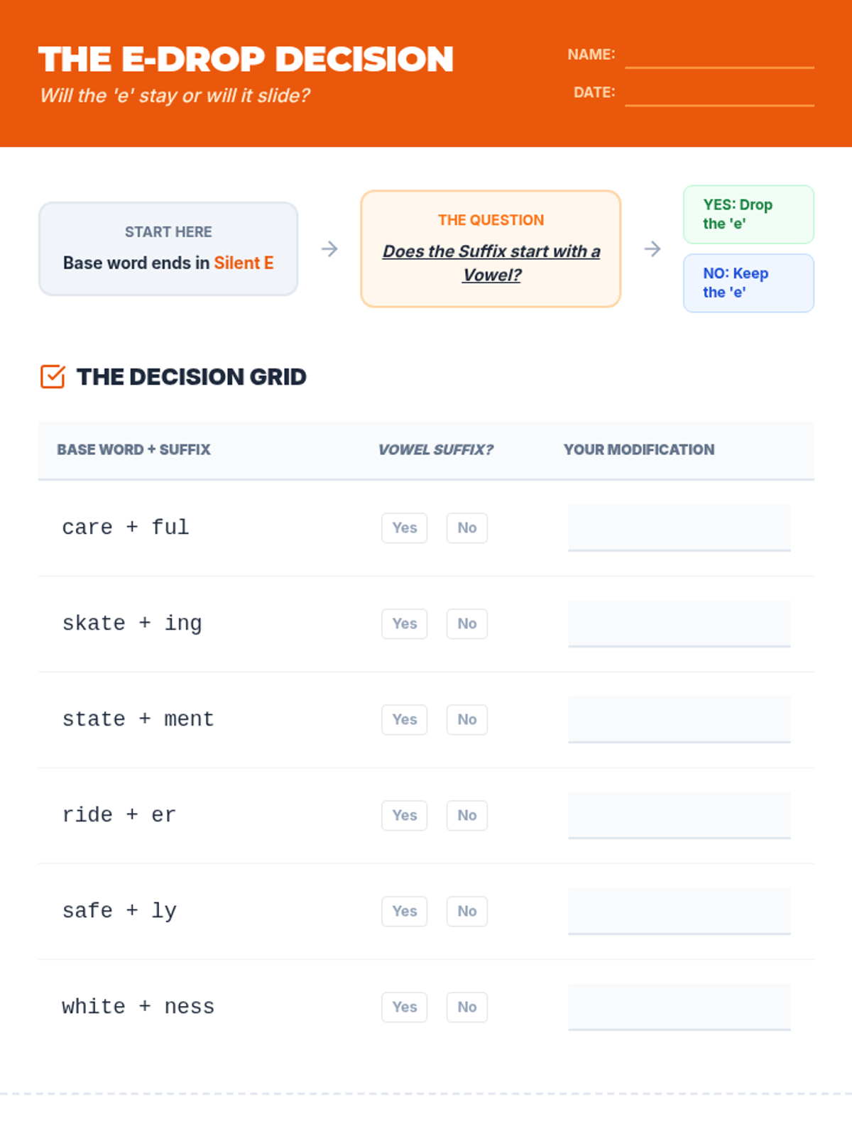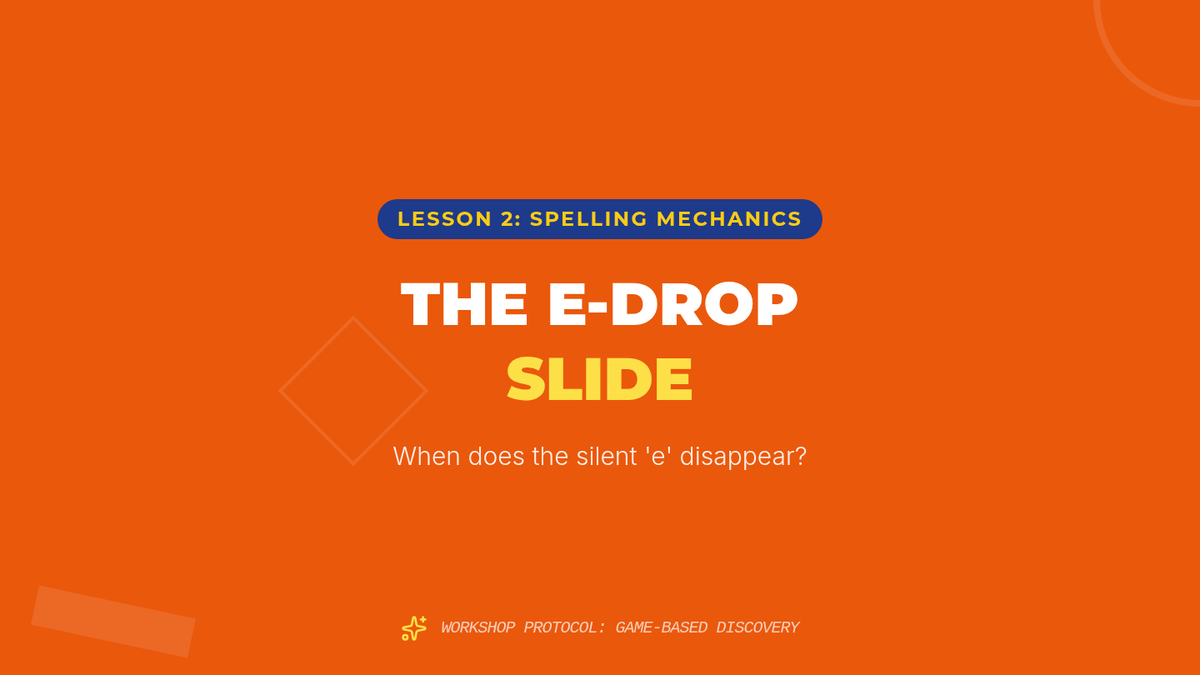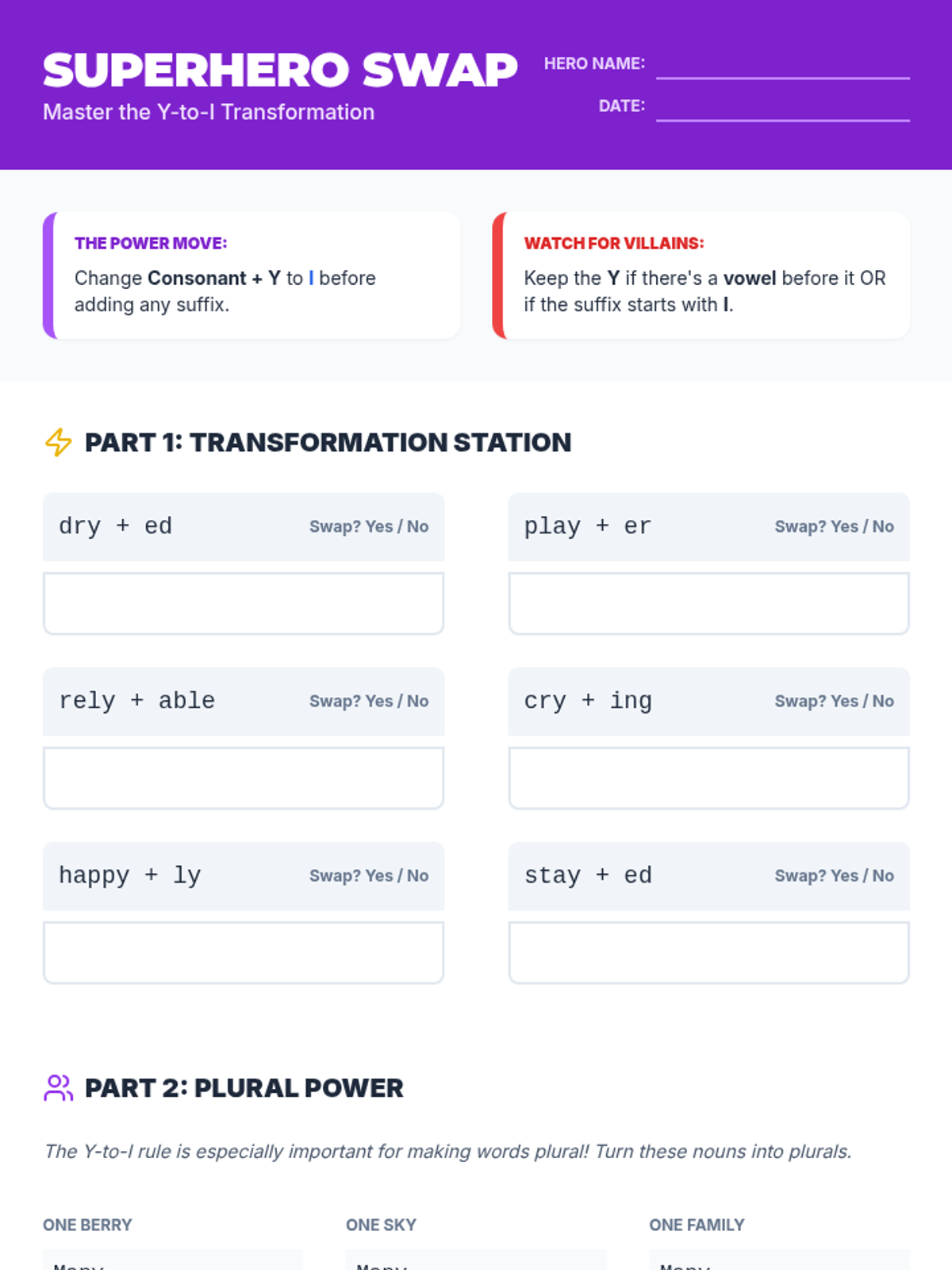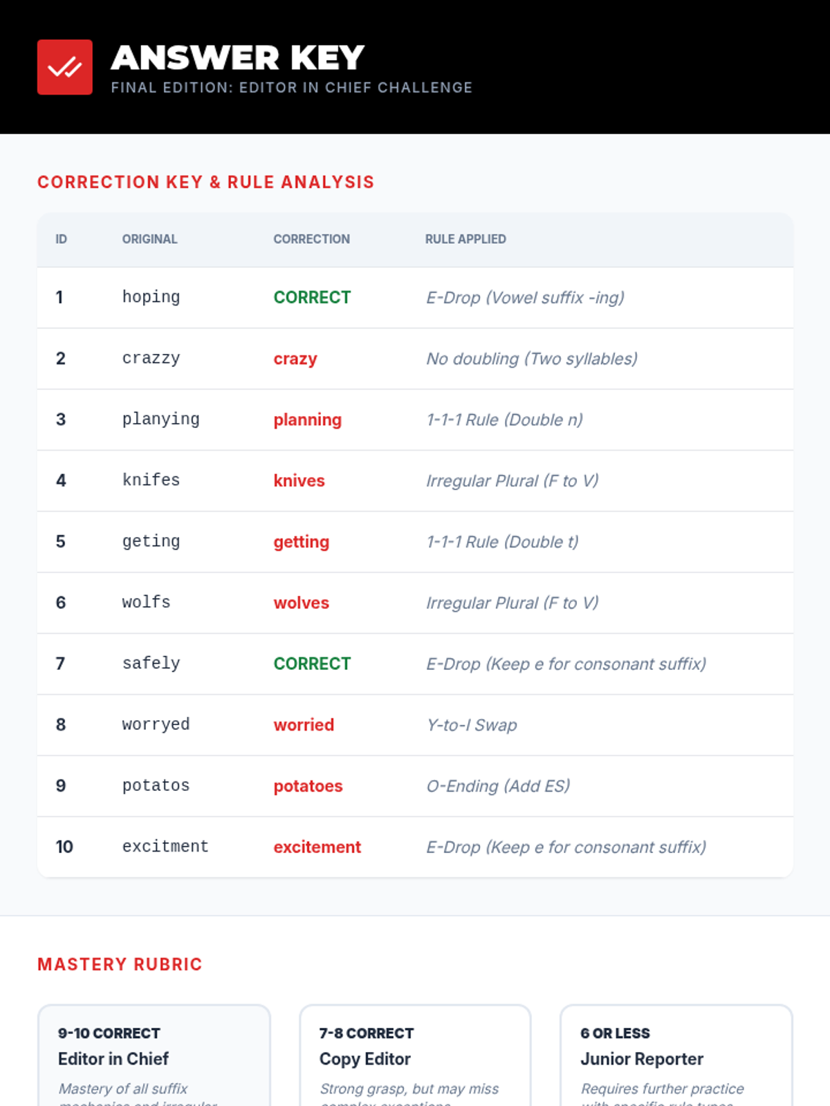 A 5th-grade spelling workshop focusing on base word modifications when adding suffixes. Students master the 1-1-1 doubling rule, silent e removal, y-to-i changes, and irregular plurals through blueprint-themed lessons.