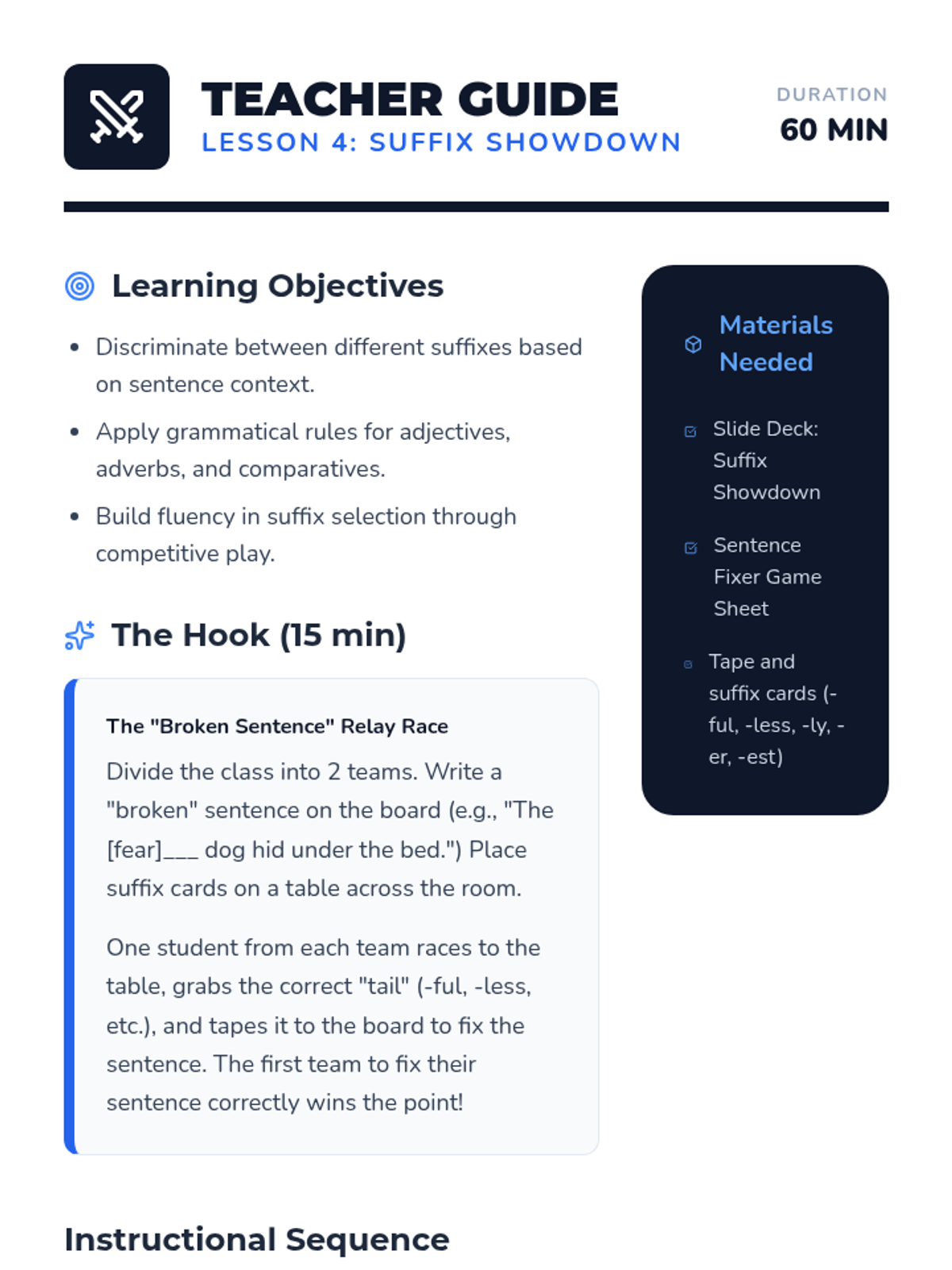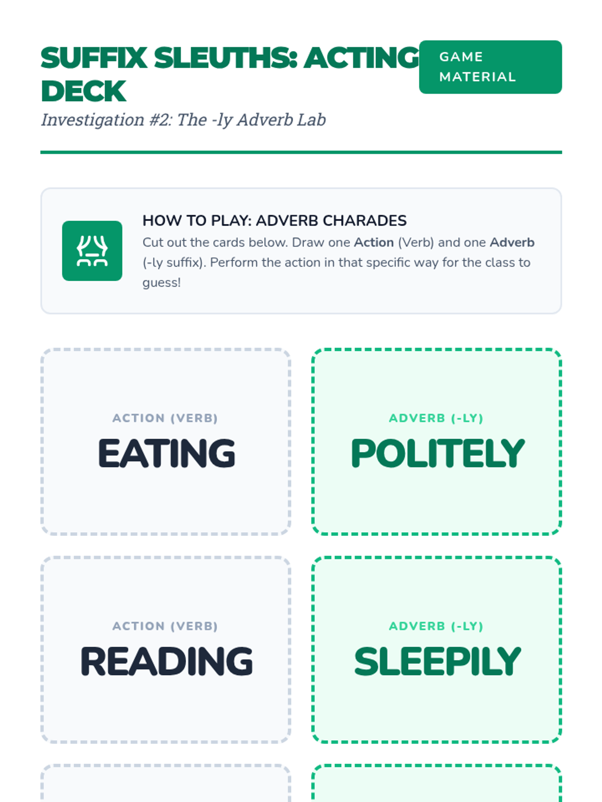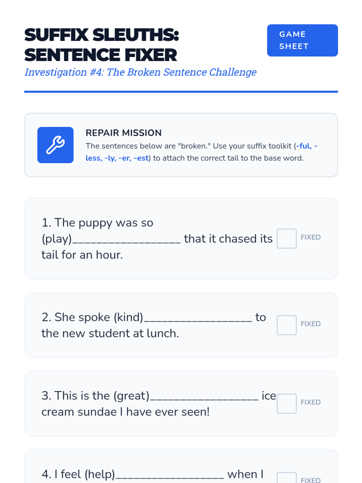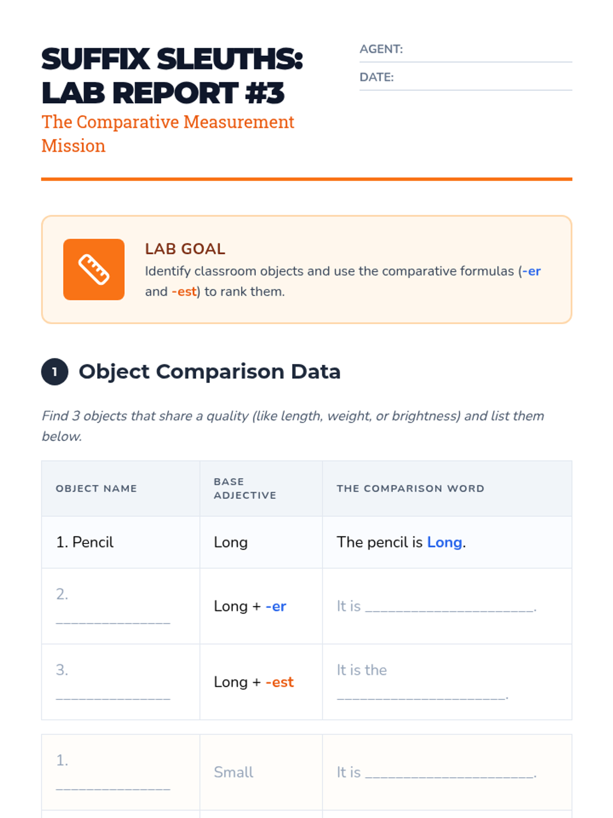 Students investigate how suffixes (-ful, -less, -ly, -er, -est) change word meanings and parts of speech. Using a 'Word Lab' detective theme, students analyze patterns, play games, and master spelling rules for word modification.