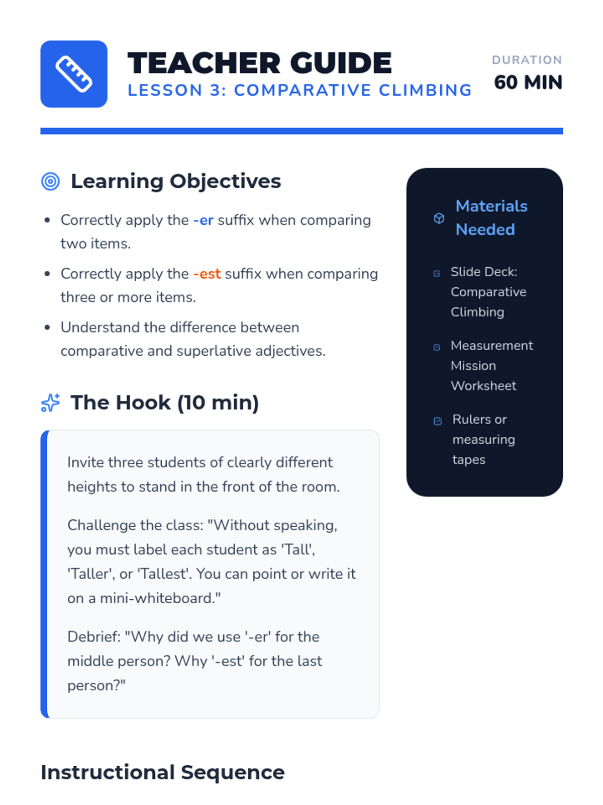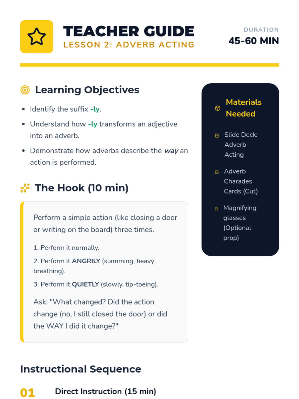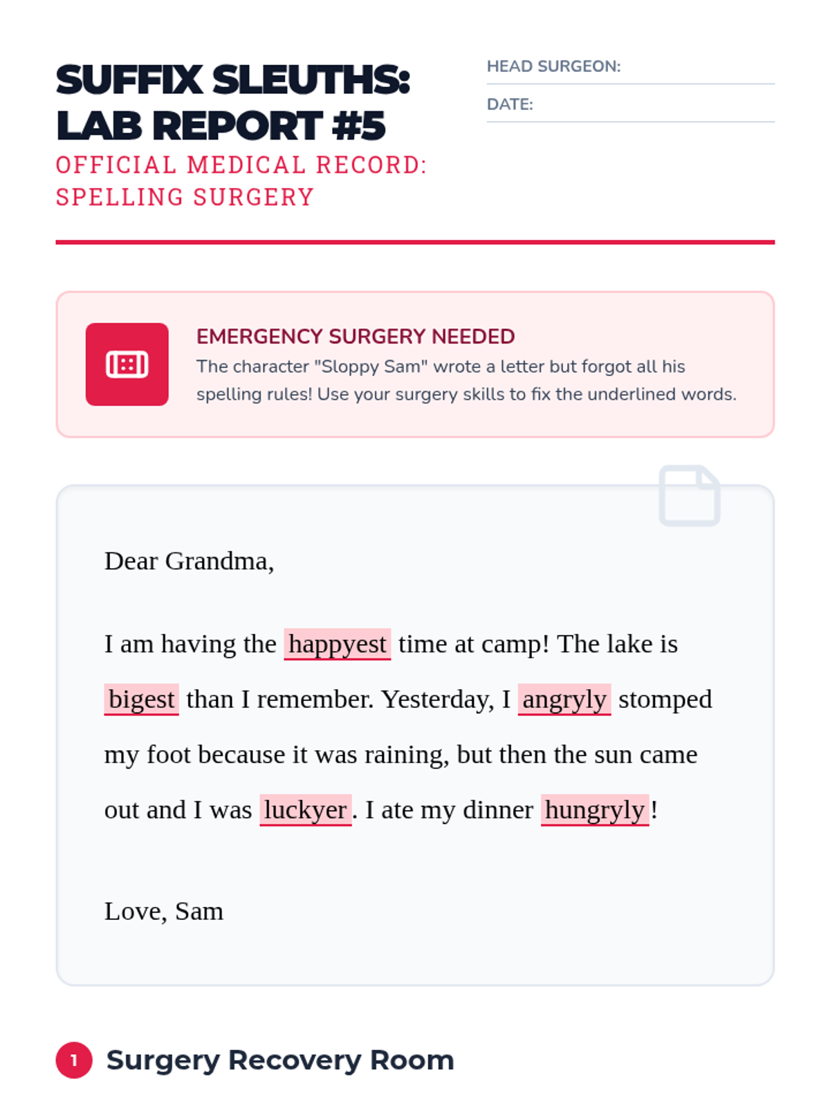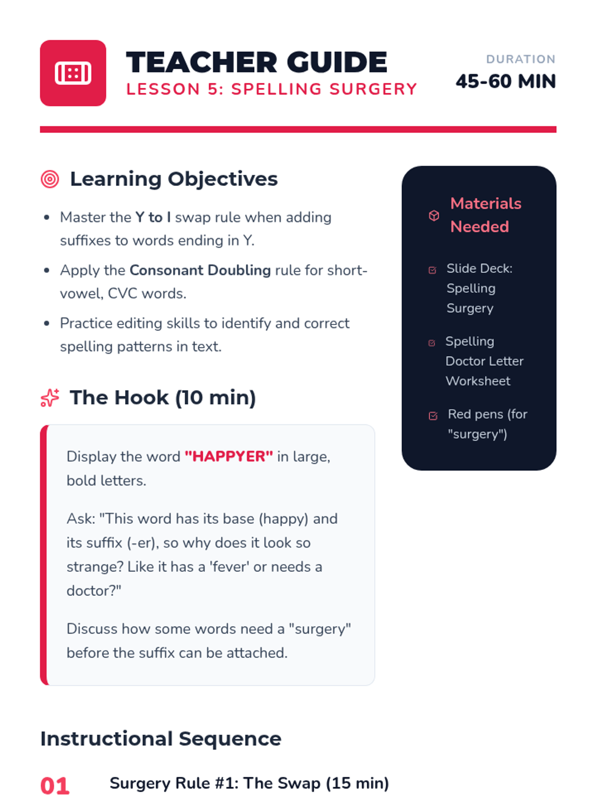 Students investigate how suffixes (-ful, -less, -ly, -er, -est) change word meanings and parts of speech. Using a 'Word Lab' detective theme, students analyze patterns, play games, and master spelling rules for word modification.