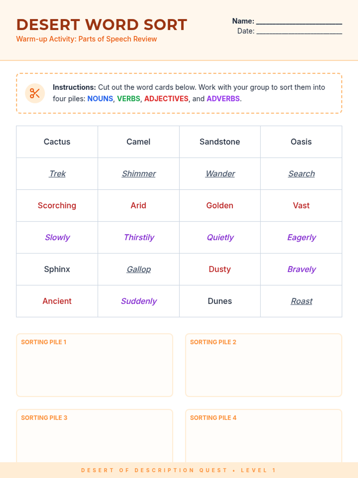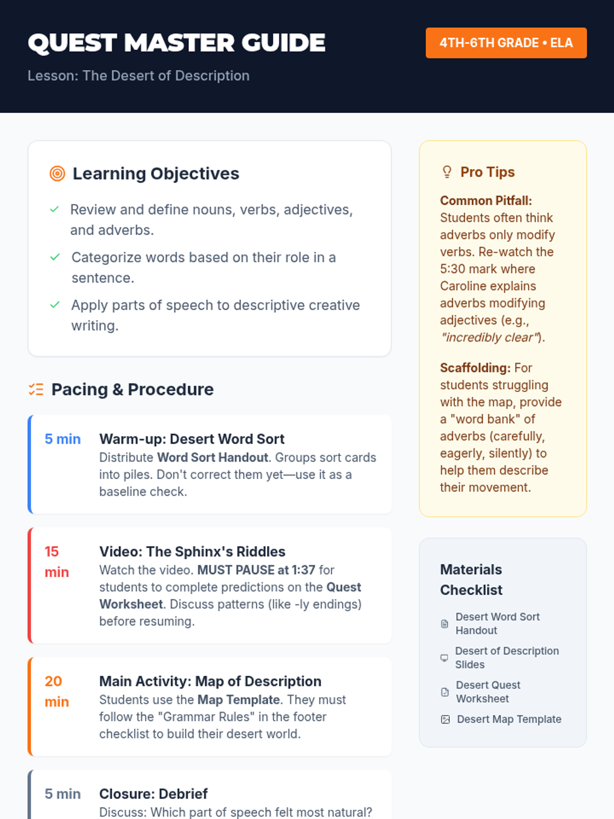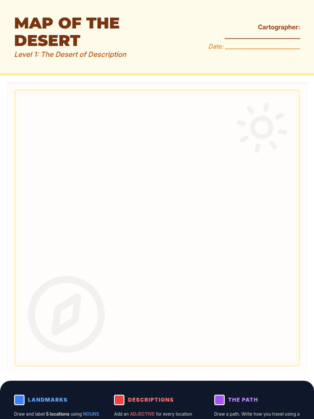 A remedial/review sequence for 4th-6th grade students focusing on parts of speech through a desert-themed adventure quest. Students identify and apply nouns, verbs, adjectives, and adverbs while building a descriptive map.