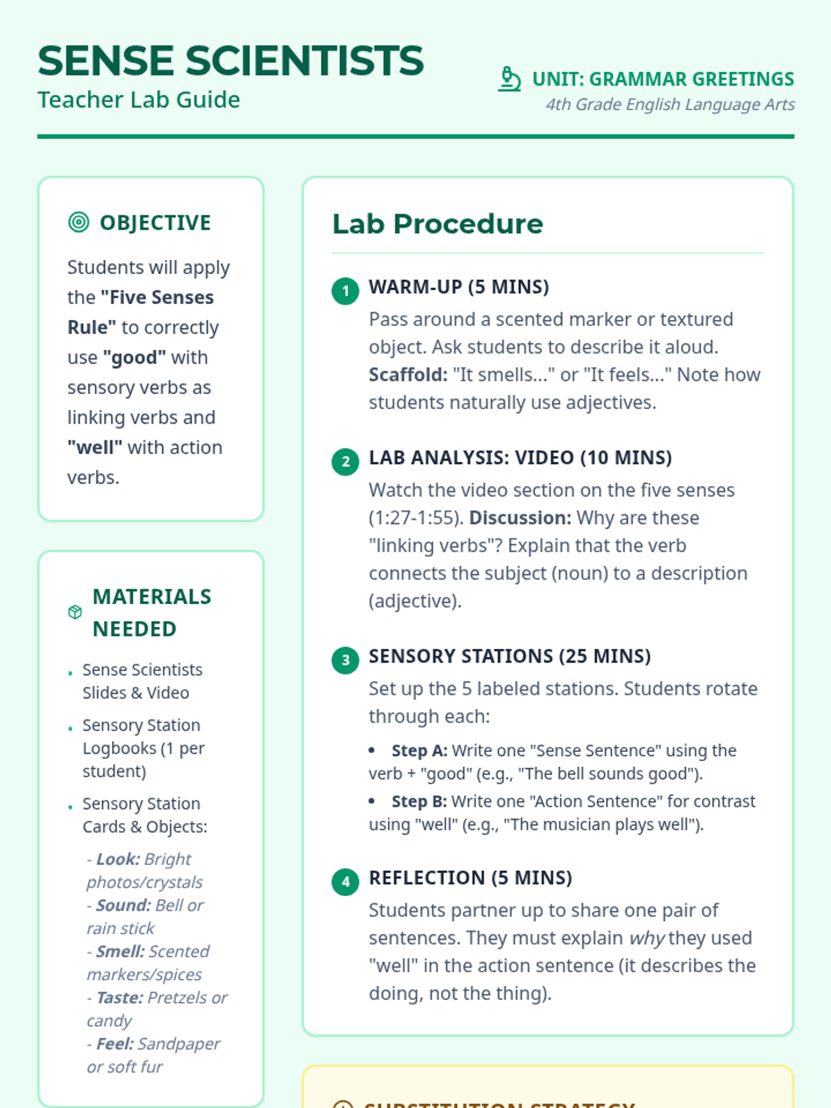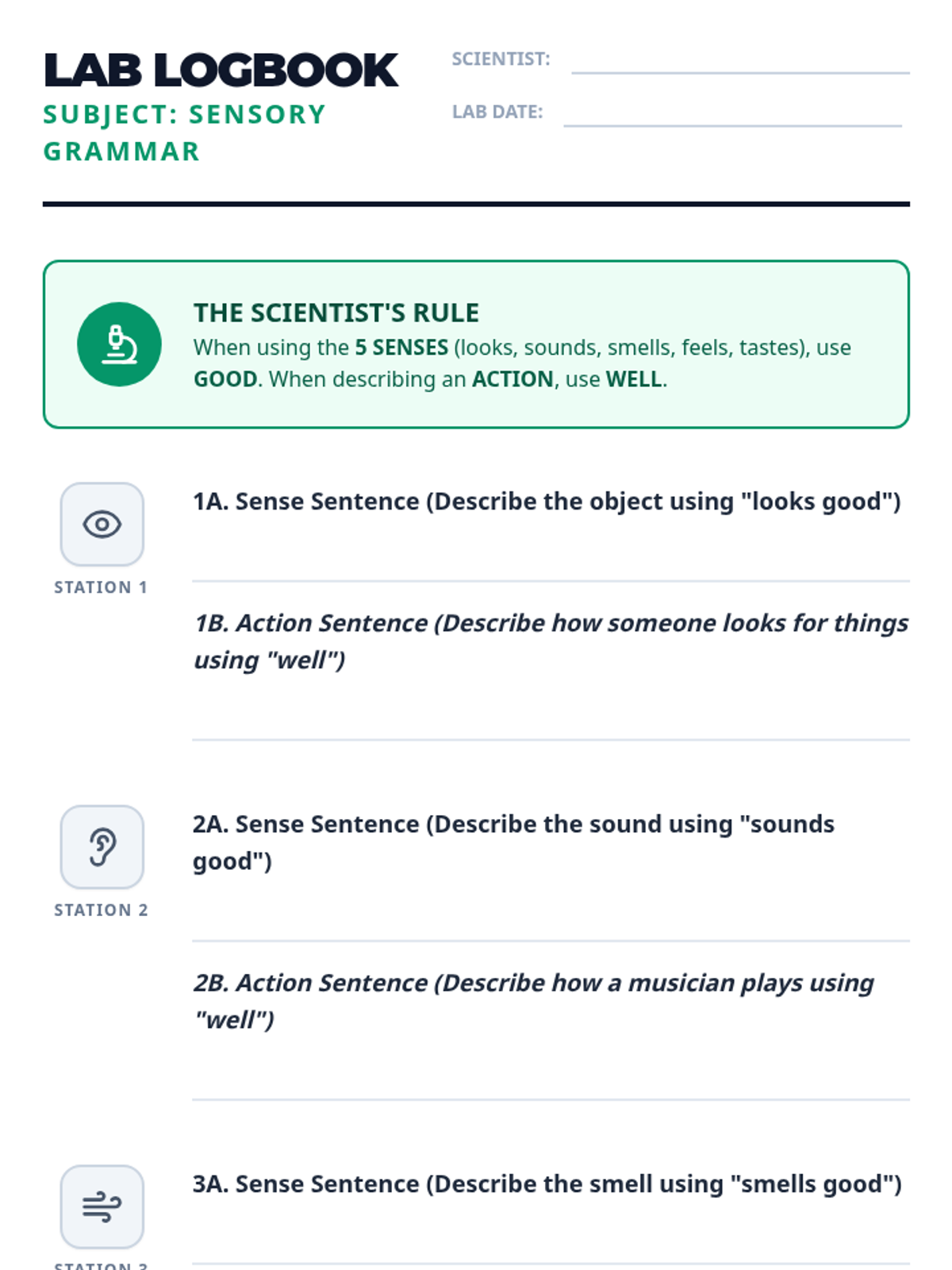 A lesson sequence focusing on the nuances of grammar, specifically the distinction between the adjective 'good' and the adverb 'well', with a focus on sensory verbs.