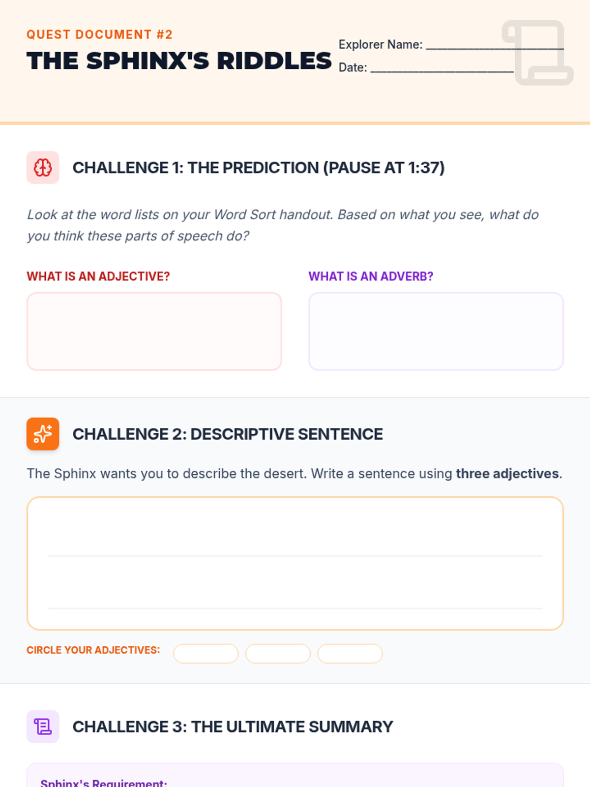 A comprehensive 4th-grade grammar unit focusing on the four primary parts of speech: nouns, verbs, adjectives, and adverbs. Through an adventure-themed quest, students master identifying and using these word classes in their writing.