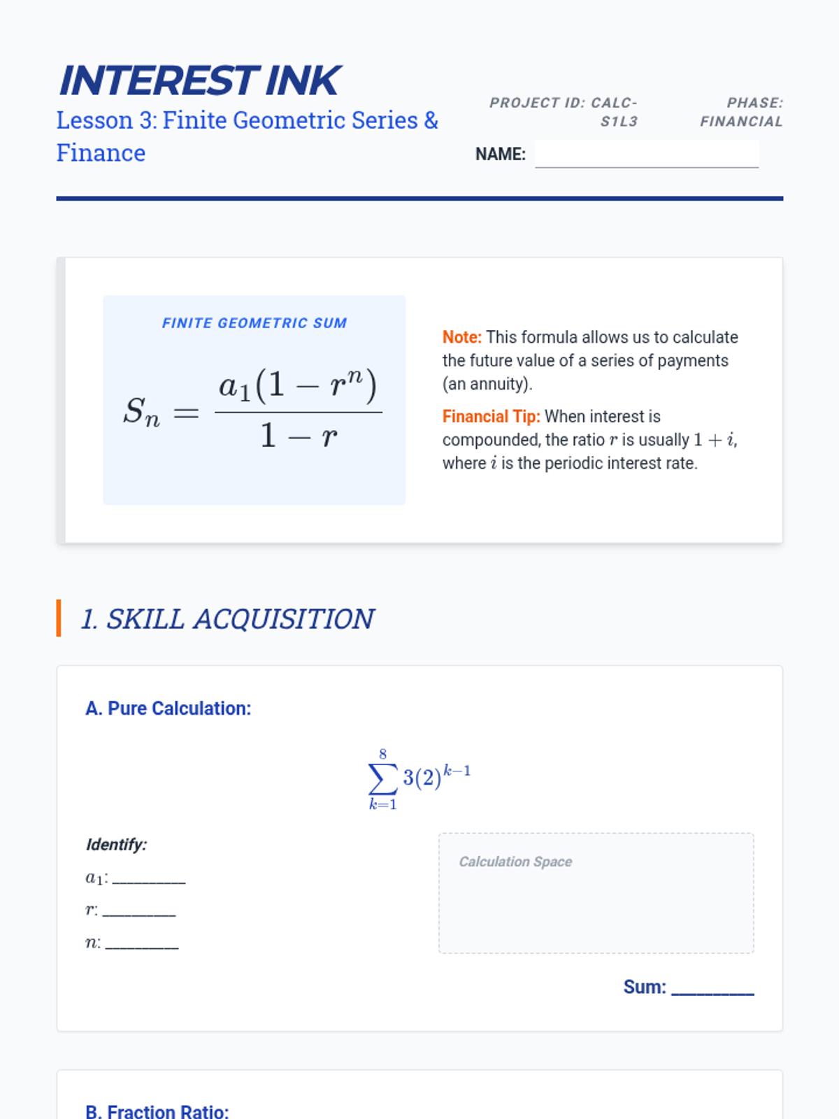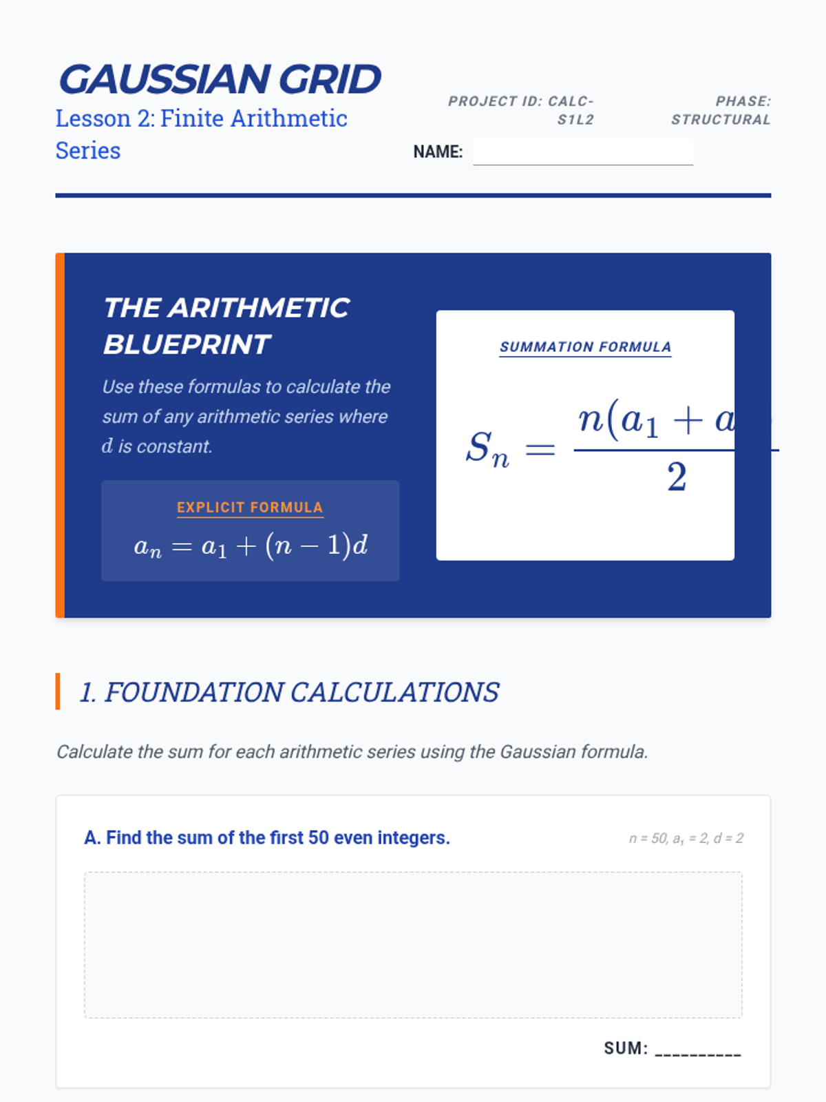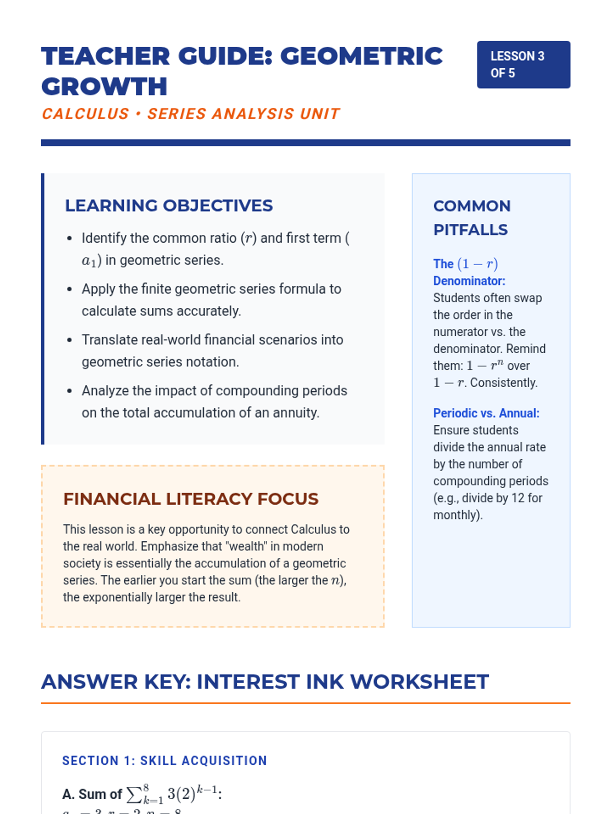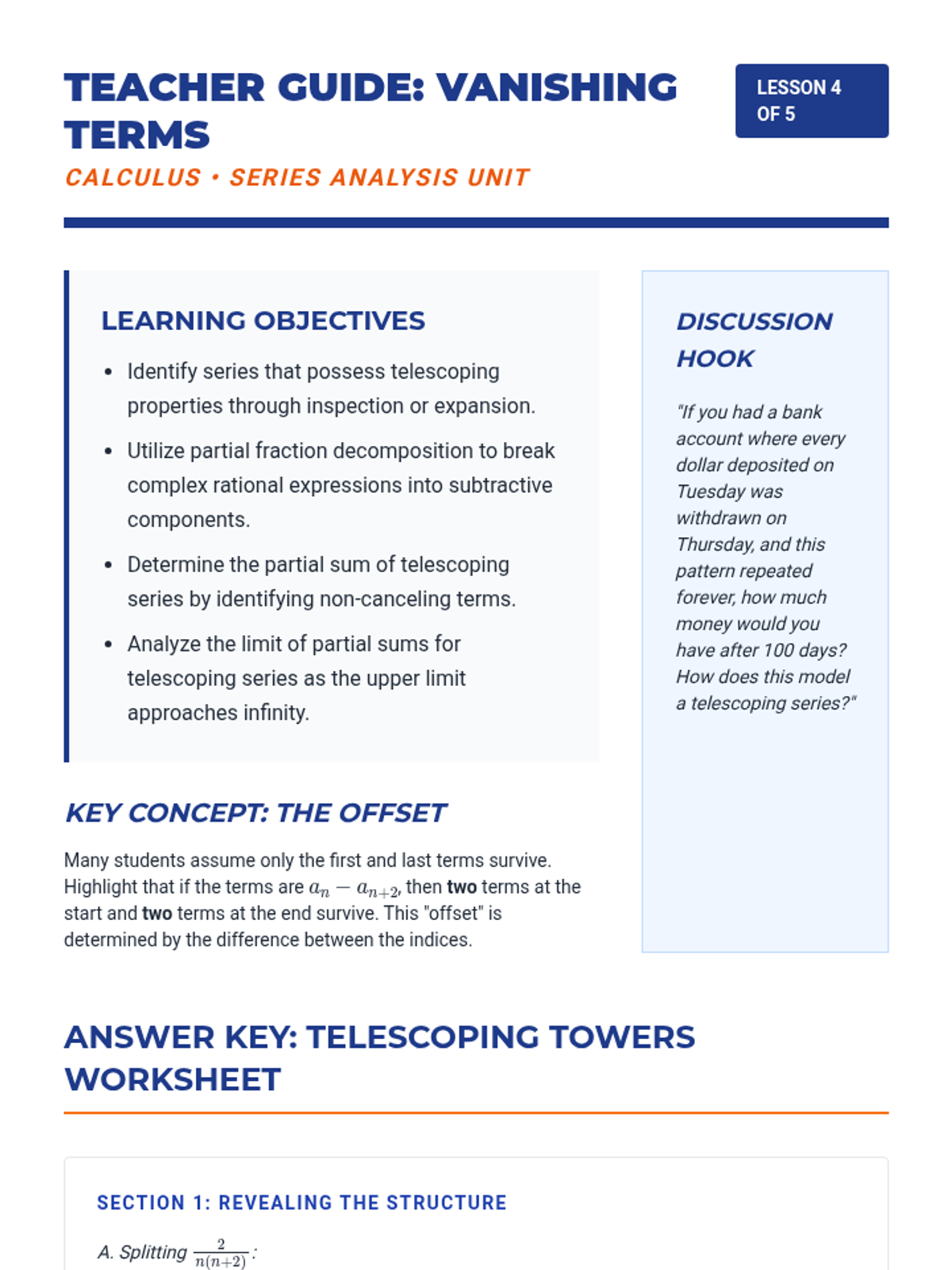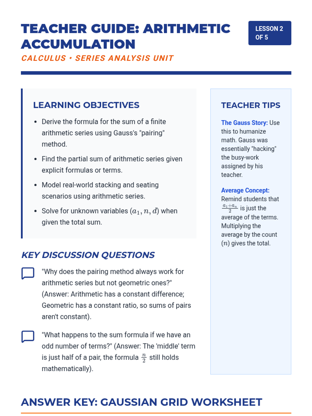 A comprehensive unit for 12th-grade calculus students exploring the power of summation. This sequence covers Sigma notation, arithmetic and geometric series formulas, financial applications, and the transition to infinite sums through telescoping series and Zeno's Paradox.