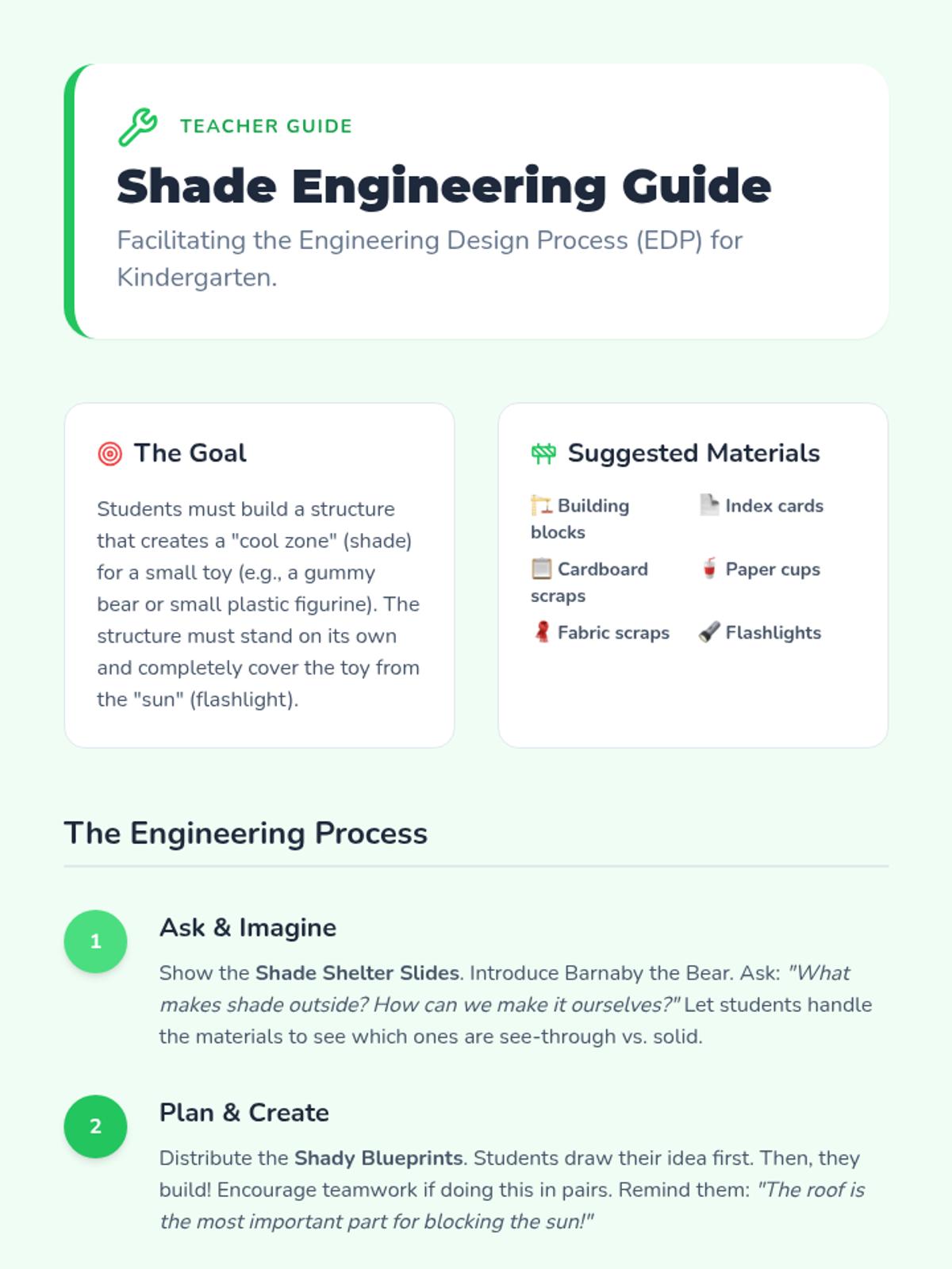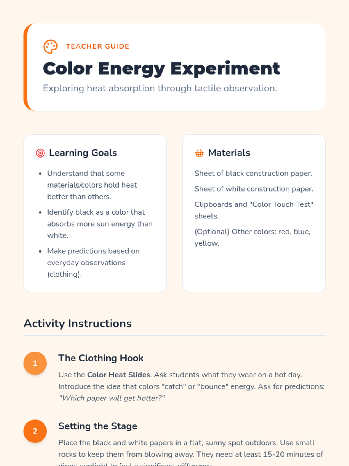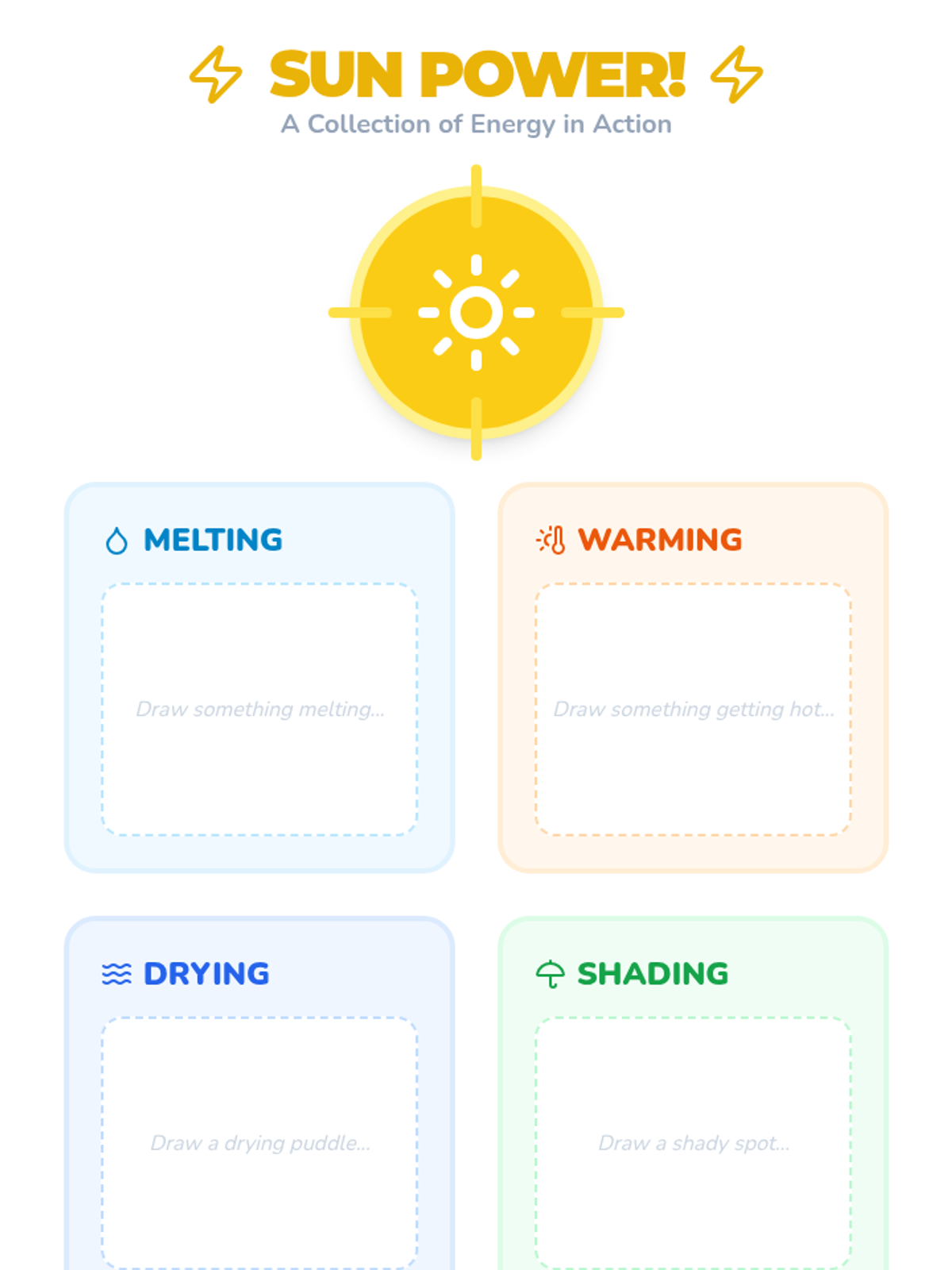 A Kindergarten science sequence where students explore sunlight as a source of heat and energy through sensory walks, ice-melting experiments, color absorption tests, and engineering shade structures.