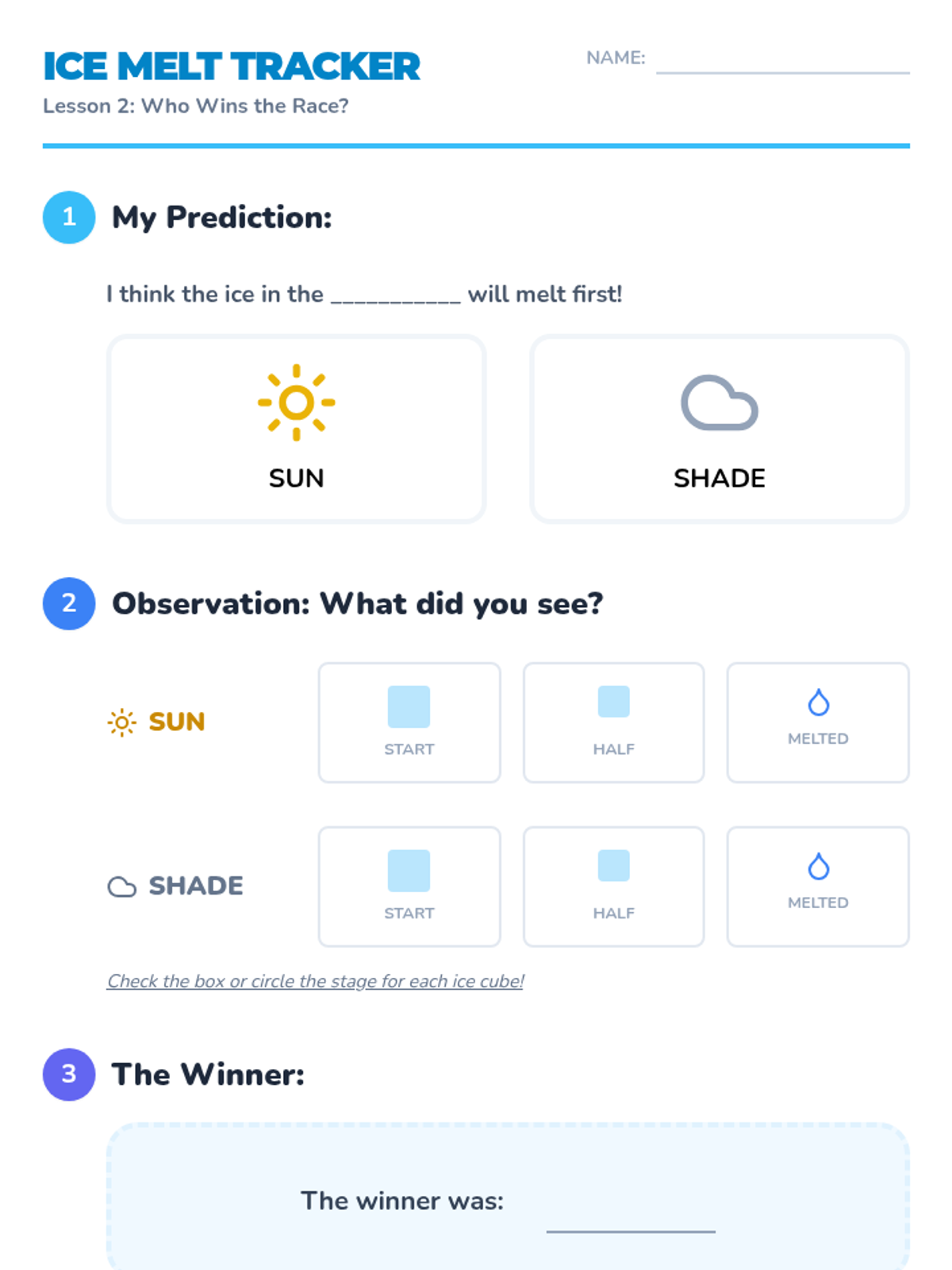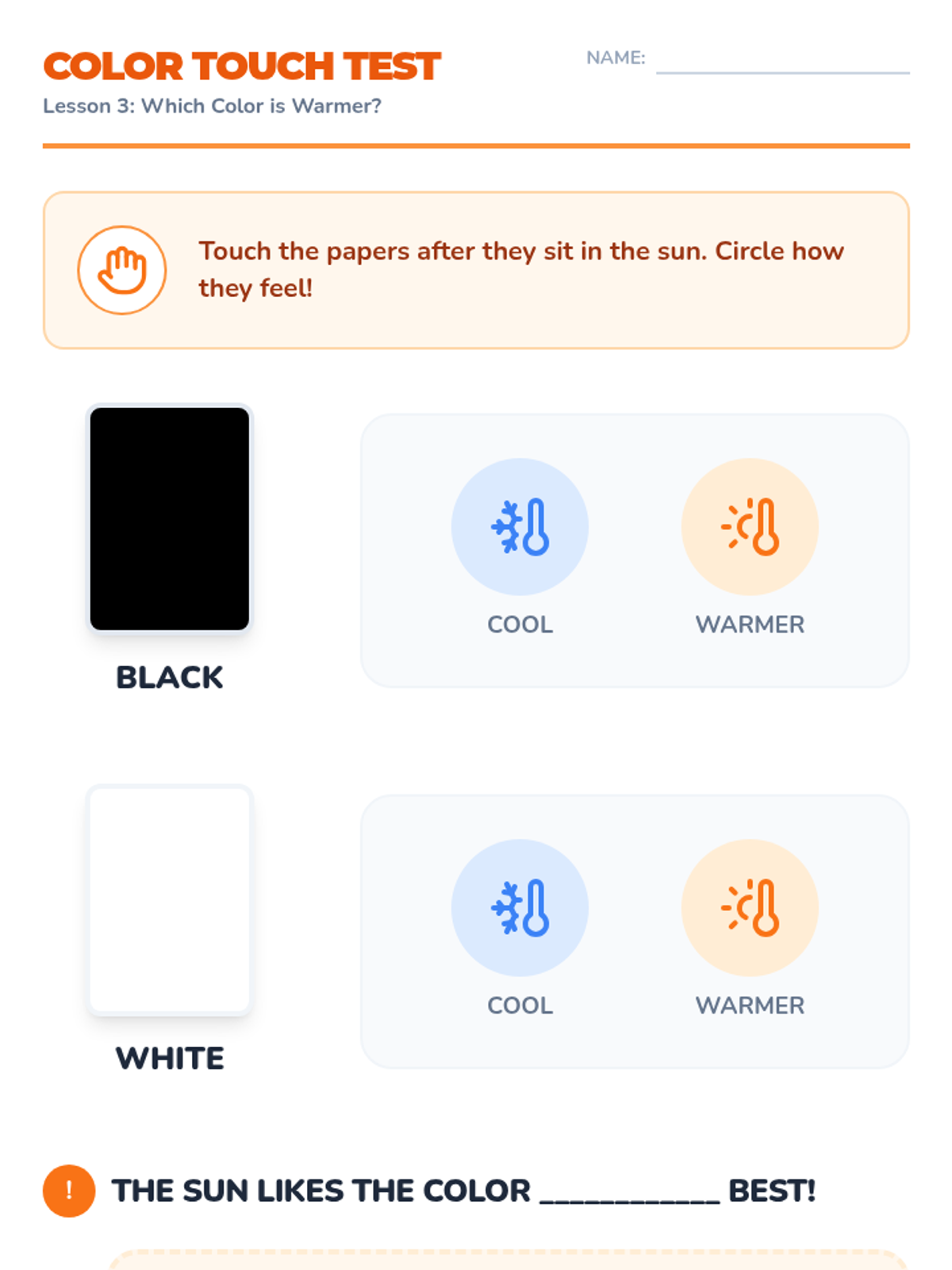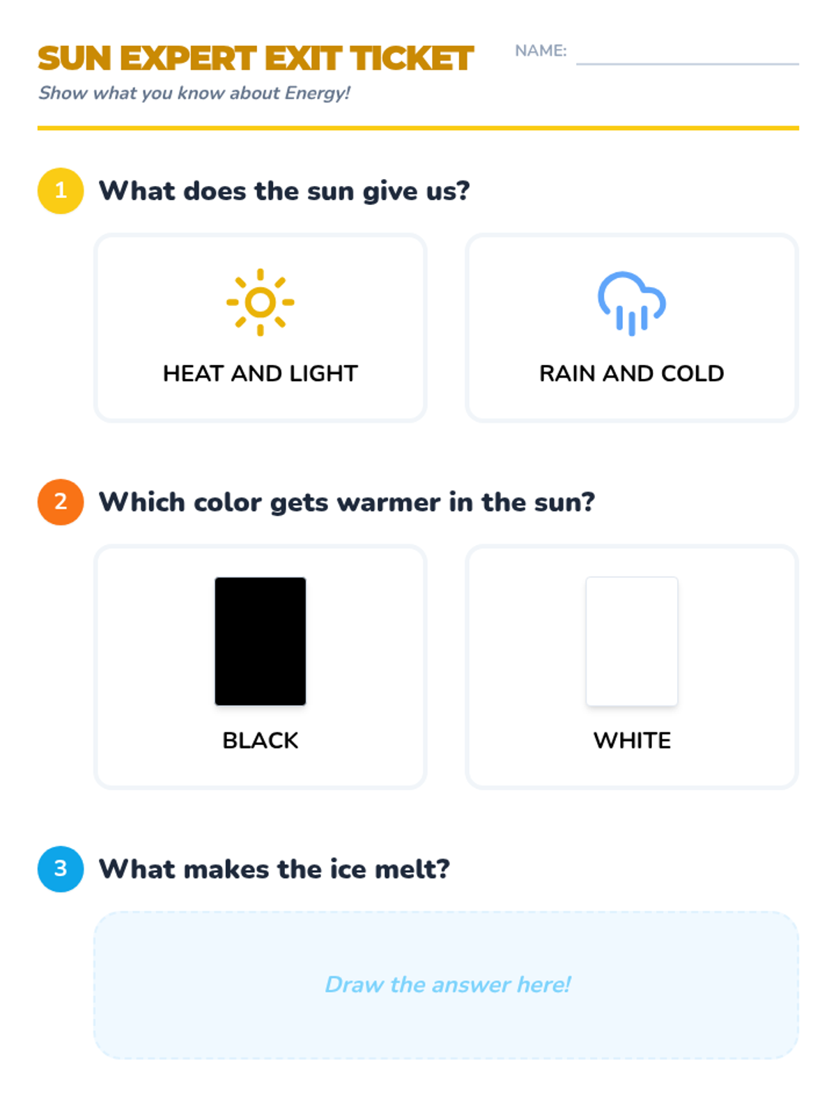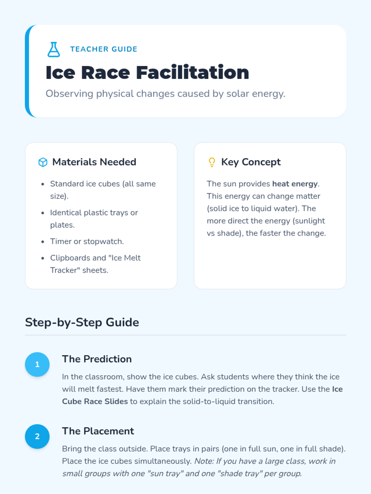 A Kindergarten science sequence where students explore sunlight as a source of heat and energy through sensory walks, ice-melting experiments, color absorption tests, and engineering shade structures.
