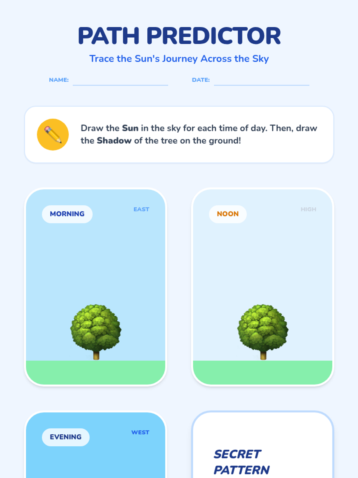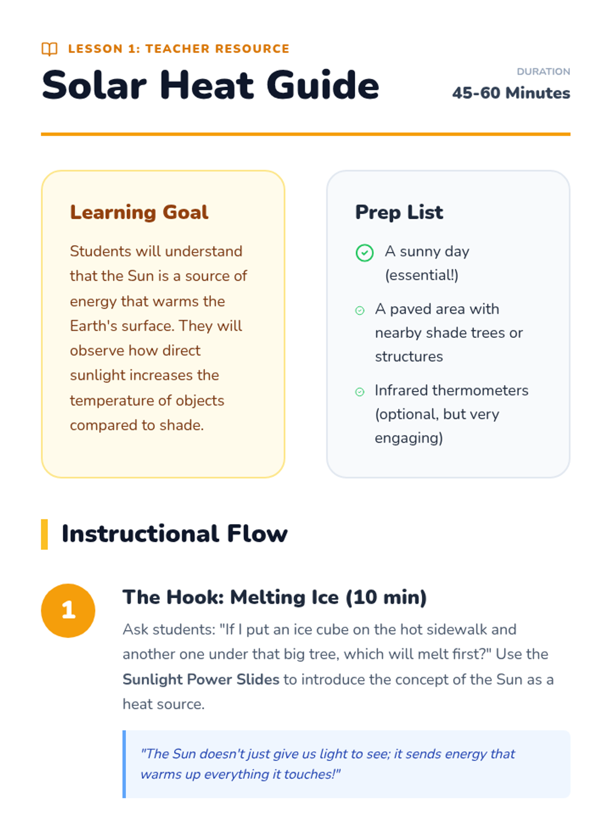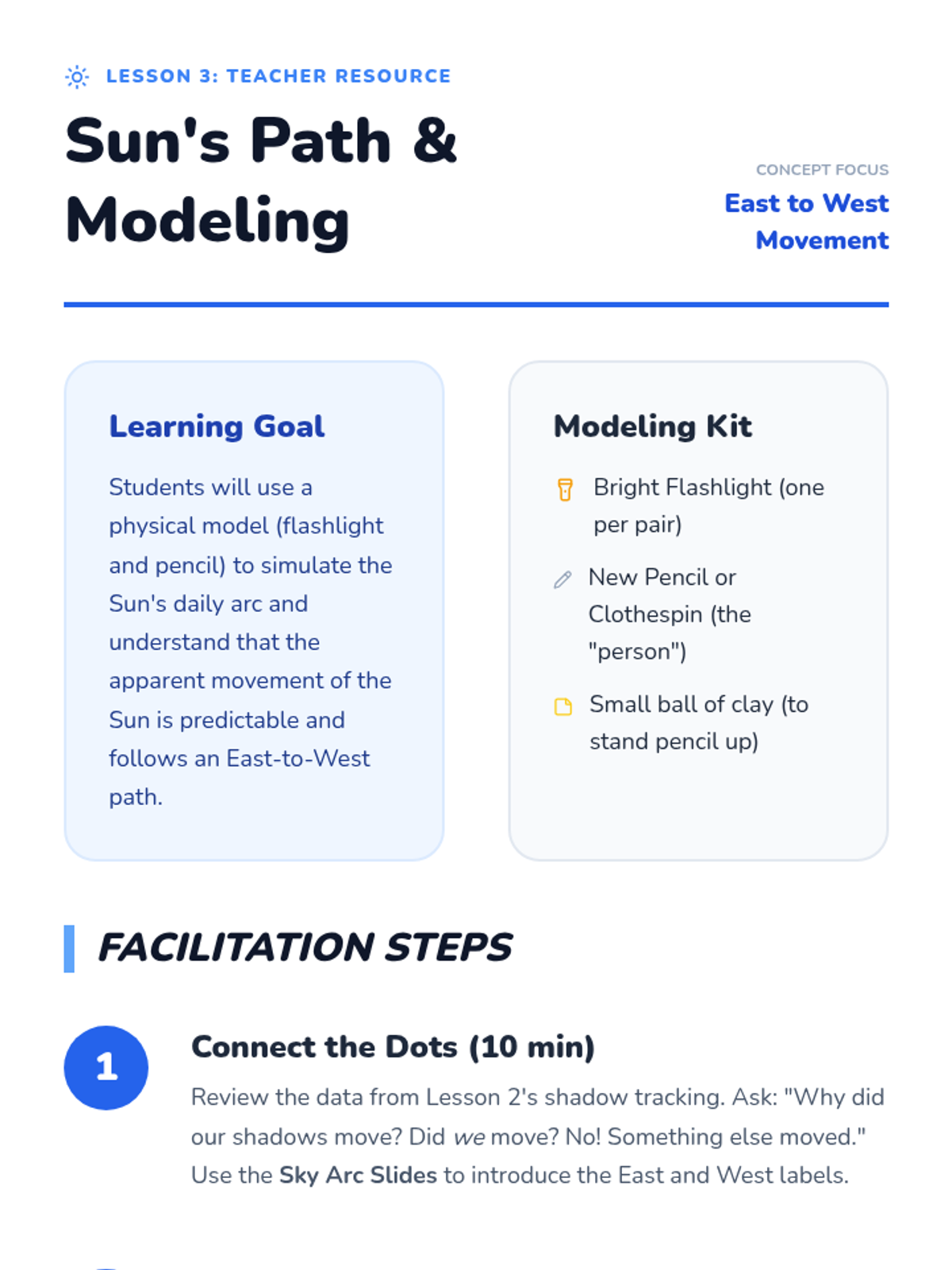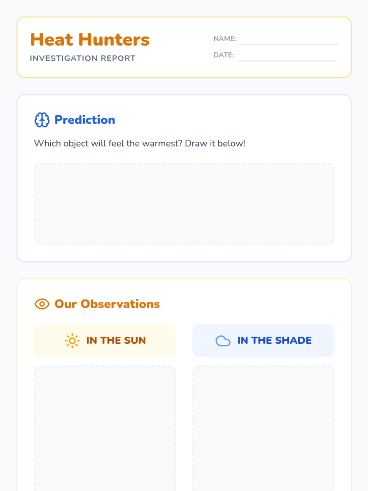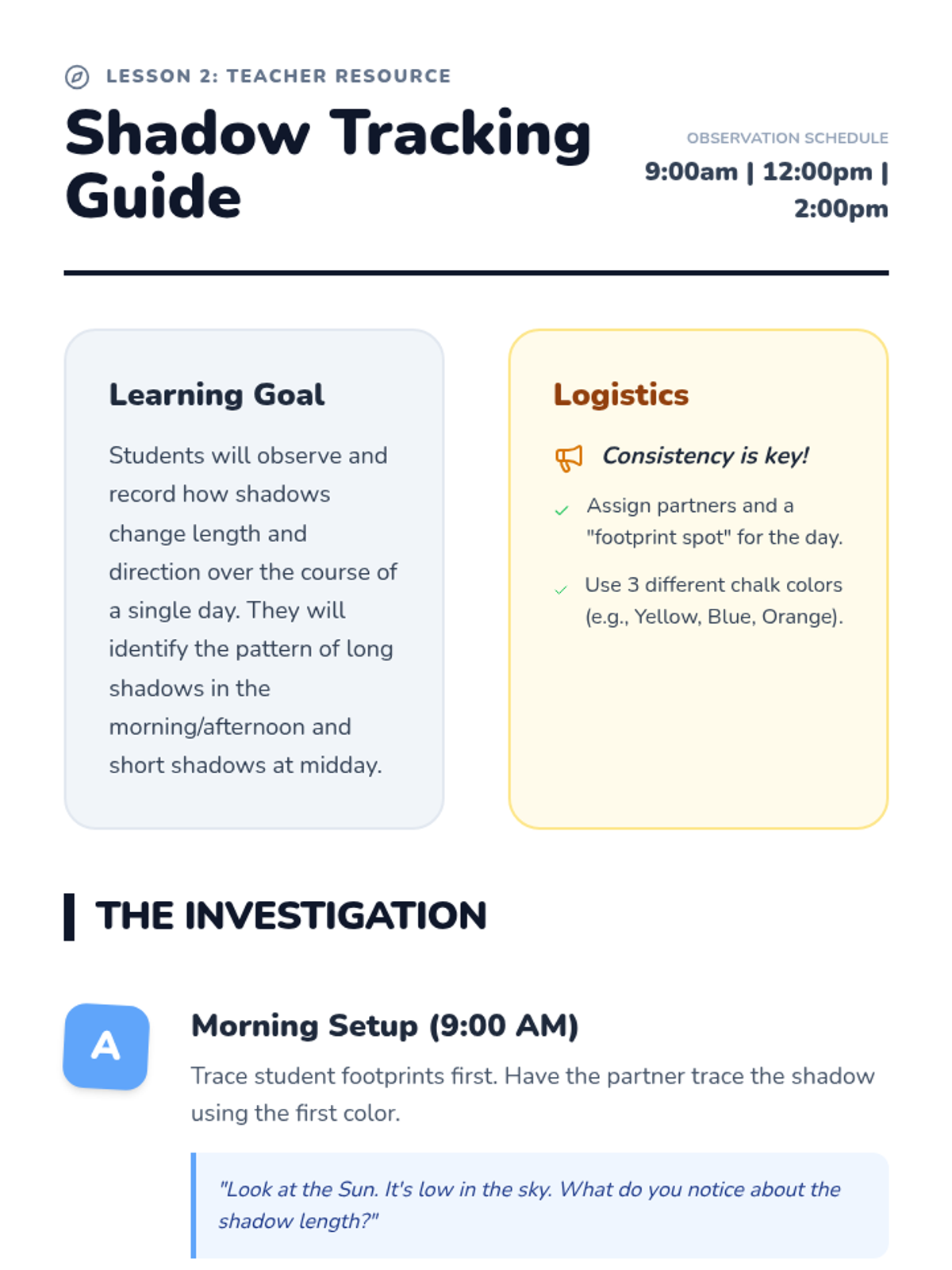 A first-grade science sequence where students explore the Sun's role as a heat source and discover predictable patterns in the sky through shadow tracking and modeling.