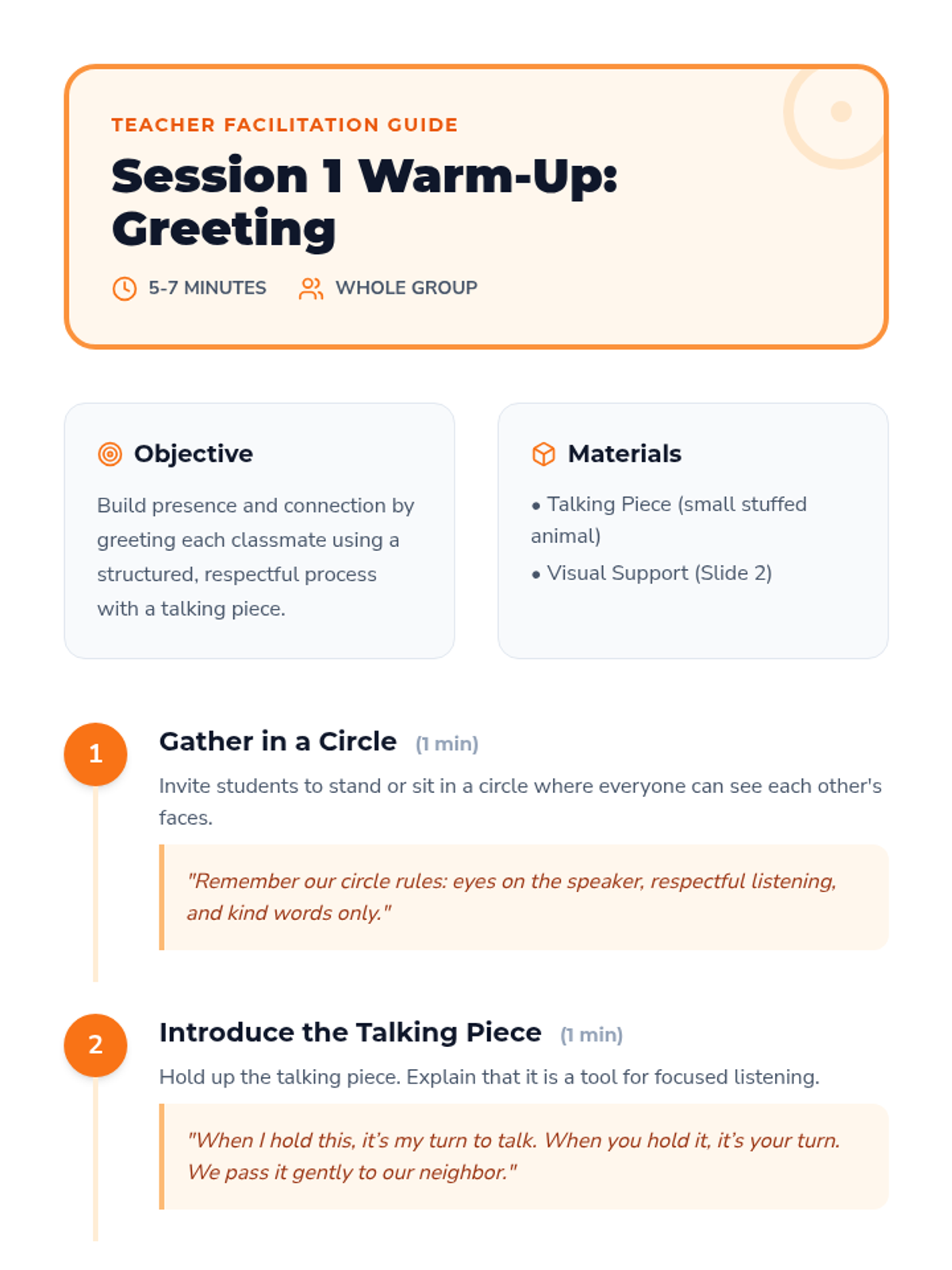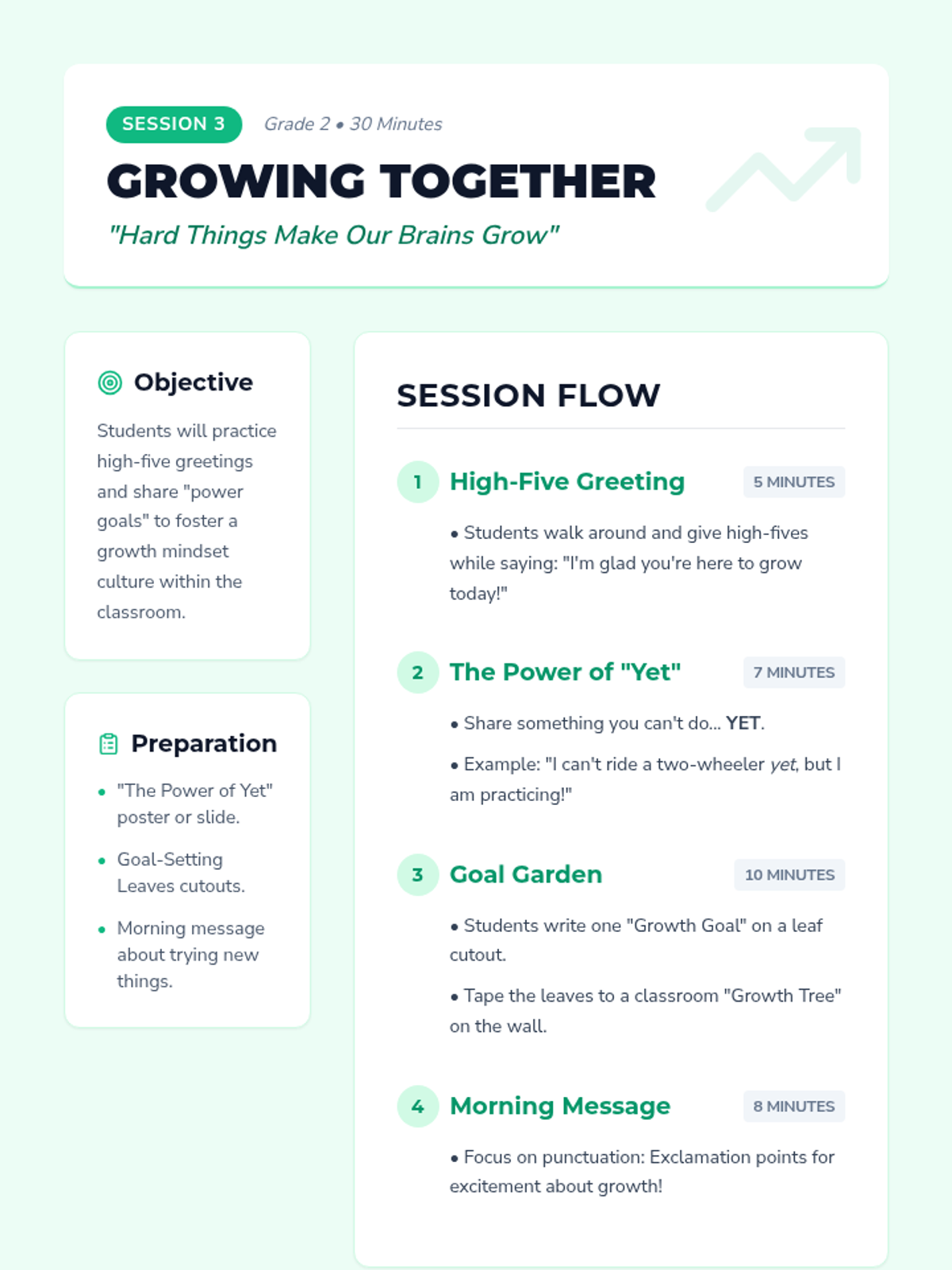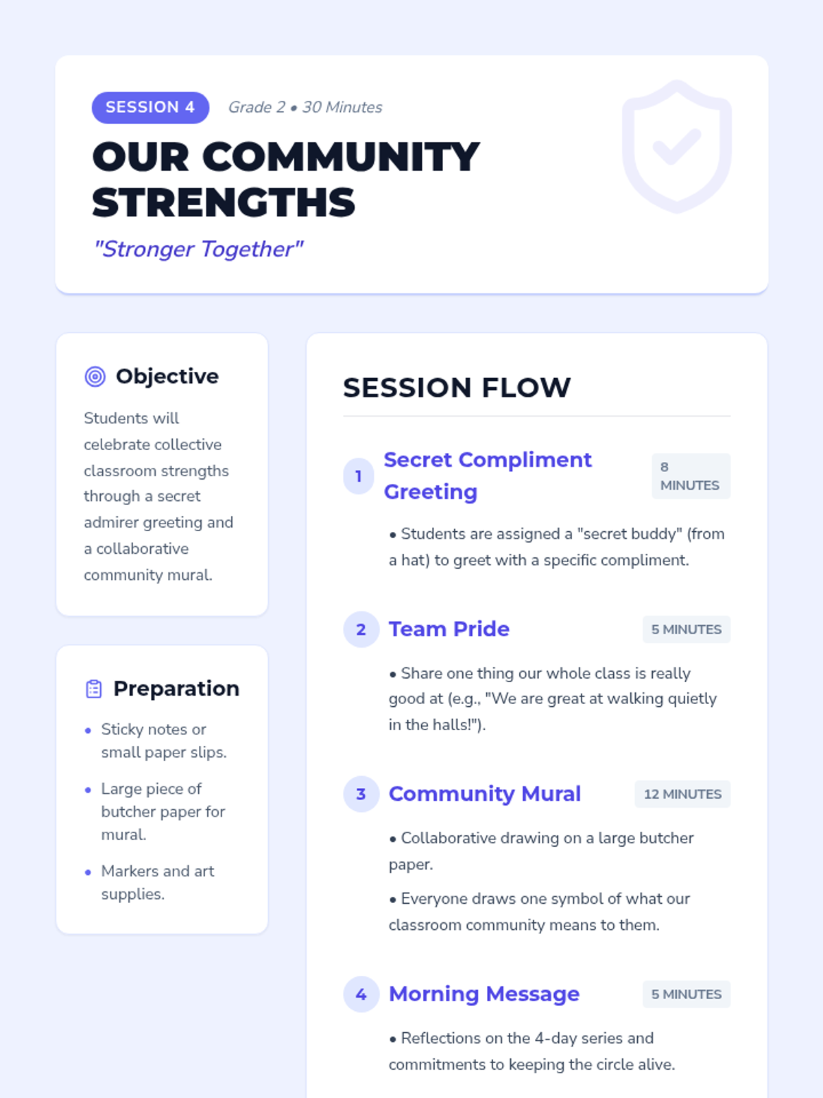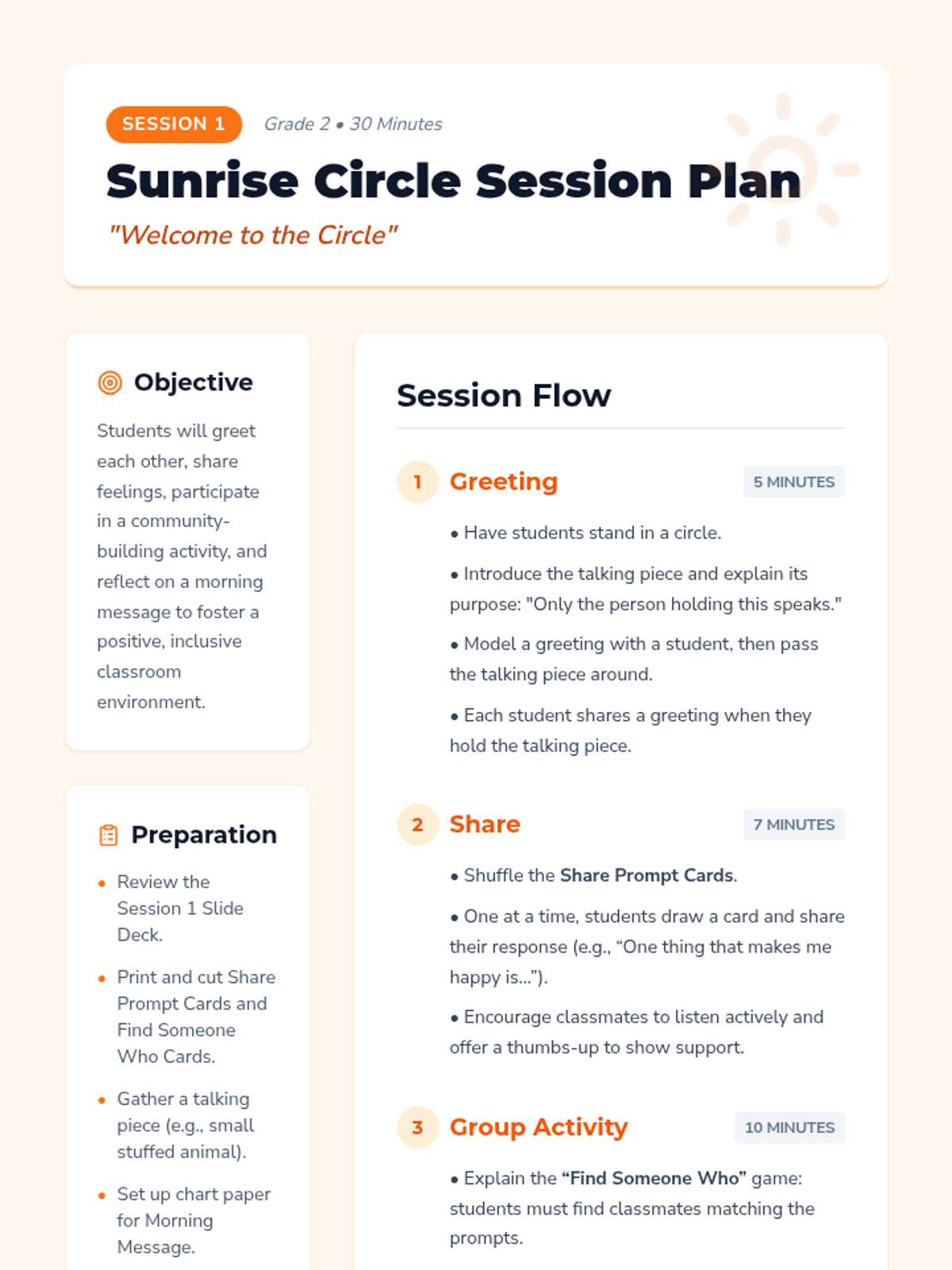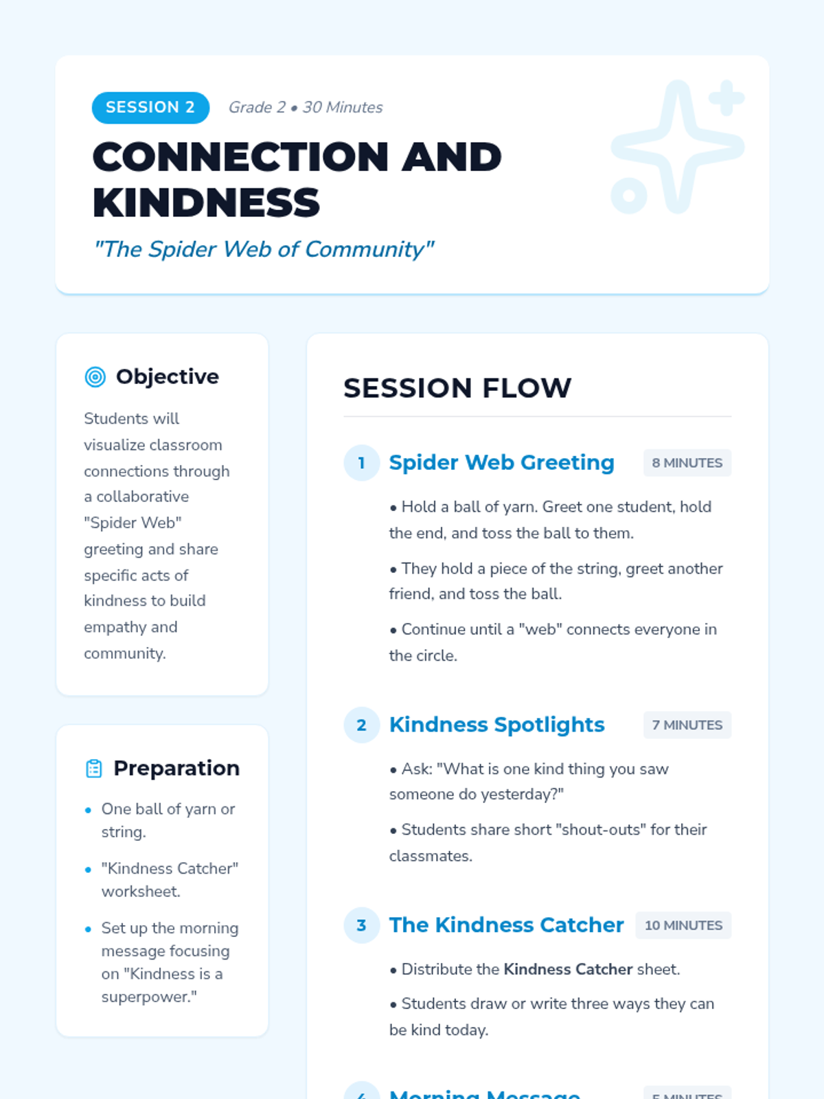 A 4-session morning meeting series designed to build community, practice social-emotional skills, and start the day with positivity for second graders. Each session includes greetings, sharing, collaborative activities, and morning message reflections.